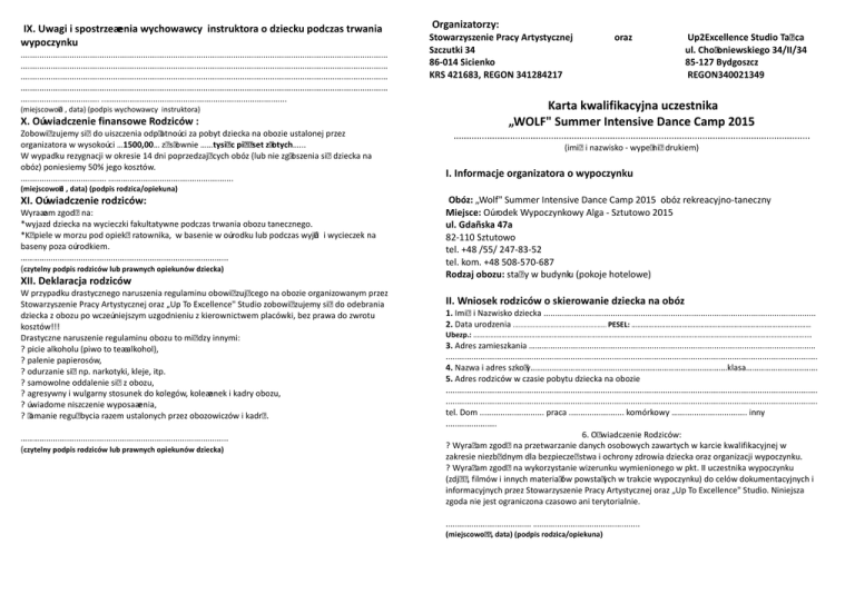 IX. Uwagi i spostrzeæenia wychowawcy instruktora o dziecku podczas trwania wypoczynku ............................................................................................................................................................... ............................................................................................................................................................... ............................................................................................................................................................... ............................................................................................................................................................... .................................. ..………..………............................................................ (miejscowoúę , data) (podpis wychowawcy instruktora) X. Oú wiadczenie finansowe Rodziców : Zobowi¹ zujemy siź do uiszczenia odp³atnoú ci za pobyt dziecka na obozie ustalonej przez organizatora w wysokoú ci …1500,00… z³ s³ownie ……tysi¹ c pięćset z³otych…... W wypadku rezygnacji w okresie 14 dni poprzedzaj¹ cych obóz (lub nie zg³oszenia siź dziecka na obóz) poniesiemy 50% jego kosztów. ..................................... ……….............................................. Organizatorzy: Stowarzyszenie Pracy Artystycznej Szczutki 34 86-014 Sicienko KRS 421683, REGON 341284217 oraz Up2Excellence Studio Tańca ul. Chołoniewskiego 34/II/34 85-127 Bydgoszcz REGON340021349 Karta kwalifikacyjna uczestnika „WOLF" Summer Intensive Dance Camp 2015 ........................................................................................................................................... (imię i nazwisko - wypełnić drukiem) I. Informacje organizatora o wypoczynku (miejscowoúę , data) (podpis rodzica/opiekuna) XI. Oú wiadczenie rodziców: Wyraæam zgodź na: *wyjazd dziecka na wycieczki fakultatywne podczas trwania obozu tanecznego. *K¹ piele w morzu pod opieką ratownika, w basenie w oú rodku lub podczas wyjúę i wycieczek na baseny poza oú rodkiem. …………............................................................................... (czytelny podpis rodziców lub prawnych opiekunów dziecka) XII. Deklaracja rodziców W przypadku drastycznego naruszenia regulaminu obowi¹ zuj¹ cego na obozie organizowanym przez Stowarzyszenie Pracy Artystycznej oraz „Up To Excellence" Studio zobowi¹ zujemy siź do odebrania dziecka z obozu po wczeú niejszym uzgodnieniu z kierownictwem placówki, bez prawa do zwrotu kosztów!!! Drastyczne naruszenie regulaminu obozu to miź dzy innymi: ? picie alkoholu (piwo to teæalkohol), ? palenie papierosów, ? odurzanie siź np. narkotyki, kleje, itp. ? samowolne oddalenie siź z obozu, ? agresywny i wulgarny stosunek do kolegów, koleæanek i kadry obozu, ? ú wiadome niszczenie wyposaæenia, ? ³amanie regu³ bycia razem ustalonych przez obozowiczów i kadrź . …………............................................................................... (czytelny podpis rodziców lub prawnych opiekunów dziecka) Obóz: „Wolf" Summer Intensive Dance Camp 2015 obóz rekreacyjno-taneczny Miejsce: Oúrodek Wypoczynkowy Alga - Sztutowo 2015 ul. Gdañska 47a 82-110 Sztutowo tel. +48 /55/ 247-83-52 tel. kom. +48 508-570-687 Rodzaj obozu: staůy w budynku (pokoje hotelowe) II. Wniosek rodziców o skierowanie dziecka na obóz 1. Imię i Nazwisko dziecka ...................................................................................................................... 2. Data urodzenia .................................................... PESEL: …………………………………………………………………………………… Ubezp.: …………………………………………………………………………………………………………………………………………………………….… 3. Adres zamieszkania ……….................................................................................................................... ................................................................................................................................................................. 4. Nazwa i adres szkoły………………………………….....……………………………………….…klasa……………………………. 5. Adres rodziców w czasie pobytu dziecka na obozie ................................................................................................................................................................. ................................................................................................................................................................. tel. Dom ............................ praca ........................ komórkowy ….............................. inny ...................... 6. Oświadczenie Rodziców: ? Wyrażam zgodę na przetwarzanie danych osobowych zawartych w karcie kwalifikacyjnej w zakresie niezbędnym dla bezpieczeństwa i ochrony zdrowia dziecka oraz organizacji wypoczynku. ? Wyrażam zgodę na wykorzystanie wizerunku wymienionego w pkt. II uczestnika wypoczynku (zdjęć, filmów i innych materiałów powstałych w trakcie wypoczynku) do celów dokumentacyjnych i informacyjnych przez Stowarzyszenie Pracy Artystycznej oraz „Up To Excellence" Studio. Niniejsza zgoda nie jest ograniczona czasowo ani terytorialnie. ..................................... ………...................................... (miejscowość, data) (podpis rodzica/opiekuna) KARTA ZDROWIA DZIECKA III. Informacje rodziców o stanie zdrowia dziecka (kadry pedagogicznej i służby zdrowia) 1.Imię i nazwisko dziecka ..................................................................................... Grupa krwi .............. 2. Przebyte choroby (podać w którym roku życia) odra ......................