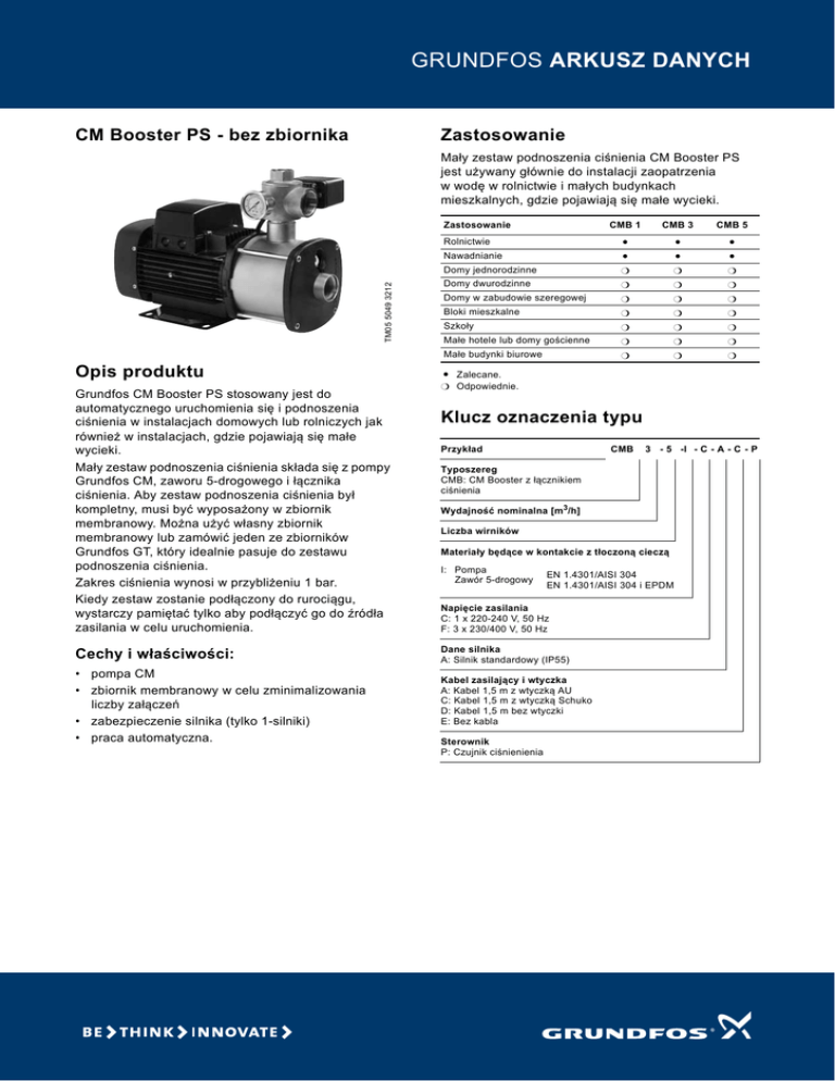 GRUNDFOS ARKUSZ DANYCH CM Booster PS - bez zbiornika Zastosowanie Mały zestaw podnoszenia ciśnienia CM Booster PS jest używany głównie do instalacji zaopatrzenia w wodę w rolnictwie i małych budynkach mieszkalnych, gdzie pojawiają się małe wycieki. TM05 5049 3212 Zastosowanie Opis produktu Grundfos CM Booster PS stosowany jest do automatycznego uruchomienia się i podnoszenia ciśnienia w instalacjach domowych lub rolniczych jak również w instalacjach, gdzie pojawiają się małe wycieki. Mały zestaw podnoszenia ciśnienia składa się z pompy Grundfos CM, zaworu 5-drogowego i łącznika ciśnienia. Aby zestaw podnoszenia ciśnienia był kompletny, musi być wyposażony w zbiornik membranowy. Można użyć własny zbiornik membranowy lub zamówić jeden ze zbiorników Grundfos GT, który idealnie pasuje do zestawu podnoszenia ciśnienia. Zakres ciśnienia wynosi w przybliżeniu 1 bar. Kiedy zestaw zostanie podłączony do rurociągu, wystarczy pamiętać tylko aby podłączyć go do źródła zasilania w celu uruchomienia. Cechy i właściwości: • pompa CM • zbiornik membranowy w celu zminimalizowania liczby załączeń • zabezpieczenie silnika (tylko 1-silniki) • praca automatyczna. CMB 1 CMB 3 CMB 5 Rolnictwie ● ● ● Nawadnianie ● ● ● Domy jednorodzinne ❍ ❍ ❍ Domy dwurodzinne ❍ ❍ ❍ Domy w zabudowie szeregowej ❍ ❍ ❍ Bloki mieszkalne ❍ ❍ ❍ Szkoły ❍ ❍ ❍ Małe hotele lub domy gościenne ❍ ❍ ❍ Małe budynki biurowe ❍ ❍ ❍ ● Zalecane. ❍ Odpowiednie. Klucz oznaczenia typu Przykład CMB 3 - 5 -I - C - A - C - P Typoszereg CMB: CM Booster z łącznikiem ciśnienia Wydajność nominalna [m3/h] Liczba wirników Materiały będące w kontakcie z tłoczoną cieczą I: Pompa Zawór 5-drogowy EN 1.4301/AISI 304 EN 1.4301/AISI 304 i EPDM Napięcie zasilania C: 1 x 220-240 V, 50 Hz F: 3 x 230/400 V, 50 Hz Dane silnika A: Silnik standardowy (IP55) Kabel zasilający i wtyczka A: Kabel 1,5 m z wtyczką AU C: Kabel 1,5 m z wtyczką Schuko D: Kabel 1,5 m bez wtyczki E: Bez kabla Sterownik P: Czujnik ciśnienienia Bycie odpowiedzialnym to nasz fundament Myślenie o przyszłości otwiera możliwości Innowacje są istotą Zakres stosowalności p [kPa] 1000 Zabezpieczenie termiczne Silniki 1-fazowe H [m] 50 Hz ISO 9906 Annex A 90 800 80 5-10 70 600 Silniki 1-fazowe pompy CM posiadają wbudowane zabezpieczenie termiczne i prądowe zgodnie z IEC 60034-11 i nie wymagają dodatkowego zabezpieczenia silnika. CM Booster PS 100 10-6 60 5-8 Silniki 3-fazowe 10-5 Silniki 3-fazowe pompy CM nie posiadają wbudowanego zabezpieczenia i dlatego wymagają użycia zewnętrznego zabezpieczenia silnika. 50 10-3 5-5 30 200 10-4 5-6 40 20 1-4 3-4 10 0 0 0 1 0.0 2 3 0.5 4 5 1.0 6 1.5 7 8 2.0 9 2.5 10 11 12 3.0 13 3.5 Q [m³/h] 14 4.0 Q [l/s] TM05 4765 2612 400 Dane techniczne 1 x 220-240 V, 50 Hz Nie uwzględnionio strat ciśnienia w armaturze i przewodzie. TM05 4246 2112 Rysunek wymiarowy 1 x 220-240 V, 50 Hz CMB H H1 H2 A1 A2 L1 B2 1-4 255 75,0 208 G1 Rp 1 323,0 158,0 3-4 255 75,0 208 G1 Rp 1 323,0 158,0 5-5 255 75,0 208 G1 Rp 1 1/4 381,0 158,0 5-6 270 90,0 223 G1 Rp 1 1/4 466,5 178,0 5-8 270 90,0 223 G1 Rp 1 1/4 502,5 178,0 5-10 270 90,0 223 G1 Rp 1 1/4 538,5 178,0 10-3 323 100,0 261 G 1 1/2 Rp 1 1/2 450,0 199,0 3 x 230/400 V, 50 Hz CMB H H1 H2 A1 A2 L1 B2 5-5 255 75,0 208 G1 Rp 1 1/4 401,0 158,0 5-6 255 75,0 208 G1 Rp 1 1/4 437,0 158,0 5-8 270 90,0 223 G1 Rp 1 1/4 502,5 178,0 5-10 270 90,0 223 G1 Rp 1 1/4 578,5 178,0 10-3 323 100,0 261 G 1 1/2 Rp 1 1/2 490,0 199,0 10-4 323 100,0 261 G 1 1/2 Rp 1 1/2 537,0 199,0 10-5 323 100,0 261 G 1 1/2 Rp 1 1/2 597,0 199,0 10-6 323 100,0 261 G 1 1/2 Rp 1 1/2 597,0 199,0 Typ Prędk. wtycz[min-1] ki CMB Imaks [A] P1 [W] 1-4 3,1 - 2,8 436 AU 3-4 3,1 - 2,8 587 AU 5-5 5,4 - 5,0 1410 5-6 8,4 - 8,0 5-8 pzał. [bar] Numer katalogowy 2.730 2,0 98244555 2.730 2,5 98244556 AU 2.750 3,0 98117630 1410 AU 2.710 4,0 98117632 8,4 - 8,0 1790 AU 2.710 4,5 98117633 5-10 11,0 - 10,0 2130 AU 2.755 6,5 98117634 10-3 11,0 - 10,0 2070 AU 2.755 3,0 98117635 Wszystkie pompy są dostarczone z kablem 1,5 m. 3 x 230/400 V, 50 Hz Typ Prędk. wtycz[min-1] ki CMB Imaks [A] P1 [W] pzał. [bar] Numer katalogowy 5-5 4,8 - 5,2/ 2,8 - 3 1170 AU 2.820 3,3 98117636 5-6 4,8 - 5,2/ 2,8 - 3 1360 5-8 5,55 - 5,38/ 3,25 - 3 AU 2.820 3,8 98117637 1840 AU 2.880 5,5 98117638 5-10 8,05 - 7,5/ 4,7 - 4,35 2320 AU 2.890 7,5 98117639 10-3 8,05 - 7,5/ 4,7 - 4,35 2250 AU 2.890 3,0 98117640 10-4 11,8 - 11,0/ 6,75 - 6,40 3000 AU 2.900 4,5 98117641 10-5 11,8 - 11,0/ 6,75 - 6,40 3710 AU 2.900 5,5 98117642 10-6 14,0 - 13,2/ 8,20 - 7,80 4600 AU 2.900 6,7 98117643 Wszystkie pompy są bez kabla. 98411208 0113 ECM: 1106559 GRUNDFOS A/S . DK-8850 Bjerringbro . Denmark Telephone: +45 87 50 14 00 www.grundfos.com Zmiany techniczne zastrzeżone.