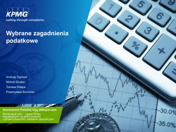 Wybrane zagadnienia podatkowe Andrzej Tajchert Michał Skraba Tomasz Rzepa Przemysław Borowiec Seminarium Polskiej Izby Ubezpieczeń Zamknięcie roku – wpływ zmian regulacyjnych na rachunkowość i sprawozdawczość zakładów ubezpieczeń Wybrane zagadnienia podatkowe Jednolity plik kontrolny 01 Ceny Transferowe 02 04 05 Seminarium Polskiej Izby Ubezpieczeń Zamknięcie roku – wpływ zmian regulacyjnych na rachunkowość i sprawozdawczość zakładów ubezpieczeń © 2015 KPMG Audyt Spółka z ograniczoną odpowiedzialnością sp.k. jest polską spółką komandytową i członkiem sieci KPMG składającej się z niezależnych spółek członkowskich stowarzyszonych z KPMG International Cooperative (“KPMG International”), podmiotem prawa szwajcarskiego. Wszelkie prawa zastrzeżone. 1 01 Jednolity plik kontrolny Nowy standard przekazywania ksiąg podatkowych i dowodów księgowych organom podatkowym Ustawa z dnia 10 września 2015 r. o zmianie ustawy – Ordynacja podatkowa ■ Nowy art. 193a Ordynacji podatkowej – Jednolity Plik Kontrolny – plik o uzgodnionym formacie strukturalnym ksiąg podatkowych oraz dowodów księgowych oparty na stosowanym w e-komunikacji standardzie XML; – stosowany na etapie postępowania podatkowego i kontrolnego, kontroli podatkowej, kontroli krzyżowych oraz w zakresie czynności sprawdzających, w tym w zakresie czynności sprawdzających u kontrahenta podatnika; – dotyczy podatników prowadzących księgi podatkowe przy użyciu programów komputerowych ■ Obowiązek sporządzania JPK powstanie: – dla dużych przedsiębiorców z dniem 1 lipca 2016 r. – dla małych i średnich przedsiębiorców z dniem 30 czerwca 2018 r. Struktura logiczna JPK zostanie ogłoszona w Biuletynie Informacji Publicznej Sposób przekazywania danych zostanie określony w Rozporządzeniu Ministra Finansów Seminarium Polskiej Izby Ubezpieczeń Zamknięcie roku – wpływ zmian regulacyjnych na rachunkowość i sprawozdawczość zakładów ubezpieczeń © 2015 KPMG Audyt Spółka z ograniczoną odpowiedzialnością sp.k. jest polską spółką komandytową i członkiem sieci KPMG składającej się z niezależnych spółek członkowskich stowarzyszonych z KPMG International Cooperative (“KPMG International”), podmiotem prawa szwajcarskiego. Wszelkie prawa zastrzeżone. 3 Jednolity Plik Kontrolny – czynności kontrolne ■ Czynności kontrolne przy wykorzystaniu Jednolitego Pliku Kontrolnego: – Obowiązek przekazywania JPK na żądanie organu – Dane przekazywane za pomocą: elektronicznego nośnika danych np. płyta CD/DVD, pendrive transmisji łączami elektronicznymi – planowana bramka elektroniczna (web-service) – Możliwość edycji danych przekazanych w formie JPK poprzez wyodrębnienie przez organ niezbędnych w toku kontroli/postępowania danych merytorycznych. – Obowiązek każdorazowego wskazania rodzaju przekazywanych ksiąg (dowodów księgowych) oraz okresu, którego dotyczy kontrola. ■ Sankcje: Brak przekazania danych może narazić osoby odpowiedzialne za sprawy finansowe podatnika na sankcje karne skarbowe: – kara porządkowa – kara grzywny - maksymalnie ok. 17 000 000 zł Seminarium Polskiej Izby Ubezpieczeń Zamknięcie roku – wpływ zmian regulacyjnych na rachunkowość i sprawozdawczość zakładów ubezpieczeń © 2015 KPMG Audyt Spółka z ograniczoną odpowiedzialnością sp.k. jest polską spółką komandytową i członkiem sieci KPMG składającej się z niezależnych spółek członkowskich stowarzyszonych z KPMG International Cooperative (“KPMG International”), podmiotem prawa szwajcarskiego. Wszelkie prawa zastrzeżone. 4 Jednolity Plik Kontrolny – czynności kontrolne Seminarium Polskiej Izby Ubezpieczeń Zamknięcie roku – wpływ zmian regulacyjnych na rachunkowość i sprawozdawczość zakładów ubezpieczeń © 2015 KPMG Audyt Spółka z ograniczoną odpowiedzialnością sp.k. jest polską spółką komandytową i członkiem sieci KPMG składającej się z niezależnych spółek członkowskich stowarzyszonych z KPMG International Cooperative (“KPMG International”), podmiotem prawa szwajcarskiego. Wszelkie prawa zastrzeżone. 5 Jednolity Plik Kontrolny – wzór OECD ■ Struktura Jednolitego Pliku Kontrolnego (SAF-T 2.0) - wzór OECD: – Wpisy Księgi Głównej (General Ledger Journals); – Należności księgowe (Account Receivables): dokumentacja transakcyjna klientów (Customer Master Files); faktury VAT (Invoices); dowody zapłaty (Payments); – Zobowiązania księgowe: dokumentacja transakcyjna dostawców (Supplier Master Files); faktury VAT (Invoices); dowody zapłaty (Payments); – Aktywa trwałe: (Fixed Assets): dokumentacja aktywów (Asset Master Files); dokumentacja dotycząca amortyzacji i utraty wartości początkowej (Depreciation&Revaluation) – Inwentarz (Inventory): dokumentacja transakcyjna składników inwentarza (Product Master Files) dokumentacja dotycząca przejścia własności (Movements) Seminarium Polskiej Izby Ubezpieczeń Zamknięcie roku – wpływ zmian regulacyjnych na rachunkowość i sprawozdawczość zakładów ubezpieczeń © 2015 KPMG Audyt Spółka z ograniczoną odpowiedzialnością sp.k. jest polską spółką komandytową i członkiem sieci KPMG składającej się z niezależnych spółek członkowskich stowarzyszonych z KPMG International Cooperative (“KPMG International”), podmiotem prawa szwajcarskiego. Wszelkie prawa zastrzeżone. 6 Harmonogram prac Ministerstwa Finansów w zakresie JPK 6 listopada 2015 r. na spotkaniu dot. stanu przygotowań JPK przez Ministerstwo Finansów przedstawiono harmonogram planowych prac w zakresie wprowadzenia JPK: – 18 grudnia 2015 r. MF planuje przekazać próbną wersję struktury JPK. – miesięczny okres na testowanie i przedstawienie uwag. Zakończenie okresu konsultacyjnego planowane jest na 16 stycznia 2016 r. – na 1 marca 2016 r. planowana jest publikacja ostatecznego wzoru JPK – pierwszą formą publ
