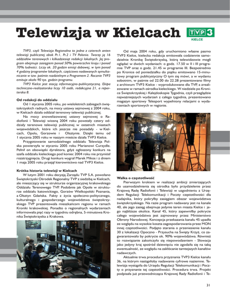 Telewizja w Kielcach TVP3, czyli Telewizja Regionalna to jedna z czterech anten telewizji publicznej obok Pr.1, Pr.2 i TV Polonia. Tworzy ją 16 oddziałów terenowych i kilkadziesiąt redakcji lokalnych. Jej program obejmuje zasięgiem ponad 50% powierzchni kraju i ponad 70% ludności. Liczy ok. 20 godzin emisji dobowej, w tym ponad 4 godziny programów lokalnych, częściowo nadawanych symultanicznie w tzw. paśmie rozdzielnym z Programem 2. Rocznie TVP3 emituje około 90 tys. godzin programu. TVP3 Kielce jest stacją informacyjno-publicystyczną. Ekipa techniczno-realizatorska liczy 10 osób, redakcyjna 21, a reporterska 8. Od redakcji do oddziału Od 1 stycznia 2005 roku, po wieloletnich zabiegach świętokrzyskich radnych, na mocy ustawy sejmowej z 2004 roku, w Kielcach działa oddział terenowy telewizji publicznej. Na mocy znowelizowanej ustawy sejmowej o Radiofonii i Telewizji wiosną 2004 roku powstały cztery oddziały terenowe telewizji publicznej w ostatnich miastach wojewódzkich, które ich jeszcze nie posiadały - w Kielcach, Opolu, Gorzowie i Olsztynie. Dzięki temu od 1 stycznia 2005 roku w naszym mieście działa TVP3 Kielce. Przygotowanie samodzielnego oddziału Telewizja Polska powierzyła w styczniu 2005 roku Marianowi Curzydle. Pełnił on obowiązki dyrektora, gdyż ogłoszony konkurs na szefa oddziału kieleckiego pod koniec 2004 roku nie przyniósł rozstrzygnięcia. Drugi konkurs wygrał Marek Mikos i z dniem 1 maja 2005 roku przejął kierownictwo nad TVP3 Kielce. Krótka historia telewizji w Kielcach W lutym 2001 roku decyzją Zarządu TVP S.A. powołano Świętokrzyski Ośrodek Regionalny TVP z siedzibą w Kielcach, ale mieszczący się w strukturze organizacyjnej krakowskiego Oddziału Terenowego TVP. Podobnie jak Opole w strukturze oddziału katowickiego, Gorzów Wielkopolski Poznania, a Olsztyn Gdańska. Fakty z życia społeczno-politycznego, kulturalnego i gospodarczego województwa świętokrzyskiego TVP prezentowała mieszkańcom regionu w ramach Kroniki krakowskiej. Ponadto o regionalnych wydarzeniach informowała pięć razy w tygodniu odrębna, 5-minutowa Kronika Świętokrzyska z Krakowa. Od maja 2004 roku, gdy uruchomiono własne pasmo TVP3 Kielce, kielecka redakcja emitowała codziennie samodzielnie Kronikę Świętokrzyską, którą telewidzowie mogli oglądać w dwóch wydaniach: o godz. 17.50 w II i III programie TVP oraz o godz. 21.45 w programie III. Bezpośrednio po Kronice od poniedziałku do piątku emitowano 15-minutowy program publicystyczny O tym się mówi, a w wydaniu sobotnim, w paśmie od 22.00 do 22.28 prezentowano filmy z archiwum TVP3 Kielce - wyprodukowane dla TVP, a zrealizowane w ramach ośrodka kieleckiego. W niedziele po Kronice Świętokrzyskiej i Kalejdoskopie Tygodnia, czyli przeglądzie najważniejszych wydarzeń z całego tygodnia, prezentowano magazyn sportowy Telesport wypełniony relacjami o wydarzeniach sportowych w regionie. Walka o częstotliwość Pierwszym krokiem w realizacji ambicji zmierzających do usamodzielnienia się ośrodka było przydzielenie przez Krajową Radę Radiofonii i Telewizji w uzgodnieniu z Urzędem Regulacji Telekomunikacji i Poczty częstotliwości dla nadajnika, który pokryłby zasięgiem obszar województwa świętokrzyskiego. Na razie program nadawany jest na kanale 40, ale jego zasięg obejmuje jedynie teren miasta Kielce i jego najbliższe okolice. Kanał 45, który zapewniłby pokrycie całego województwa jest zajmowany przez Ministerstwo Obrony Narodowej. Koncepcja przekazania kanału 45 upadła ze względu na wysokie koszta zagospodarowania przez MON innej częstotliwości. Podjęto starania o przeniesienie kanału 30 z lokalizacji Opoczno - Przysucha na Święty Krzyż, co zagwarantowało by pokrycie ok. 90% województwa. Również to rozwiązanie zakończyło się niepowodzeniem - Słowacja jako jedyny kraj spośród dziewięciu nie zgodziła się na taką ewentualność, ze względu na zakłócanie tamtejszych kanałów nadawczych. Aktualnie trwa procedura przyznania TVP3 Kielce kanału 36, na którym nastąpiłoby nadawanie cyfrowe naziemne. Telewizja wystąpiła do Urzędu Regulacji Telekomunikacji i Poczty o przyznanie tej częstotliwości. Procedura trwa. Projekt podpisała już przewodnicząca Krajowej Rady Radiofonii i Te31 lewizji, teraz czeka on na opinię URTiP. W 2007 roku zacznie się wprowadzać technologię cyfrową, więc kielecki oddział byłby jednym z pionierów takiego nadawania. Jednakże z tą koncepcją wiąże się i utrudnienie - do odbioru programu będą potrzebne dekodery, a nie wszyscy mieszkańcy regionu będą mogli sobie na nie pozwolić. Wyposażenie techniczne studia TV Studio TV zostało zlokalizowane w Kieleckim Centrum Kultury na podstawie porozumienia między TVP3 Kielce a Prezydentem Miasta Kielce. Adaptację pomieszczeń wraz z infrastrukturą techniczną zapewniającą zasilanie energetyczne, klimatyzację, sieć teleinformatyczną i warunki akustyczne zrealizowało Miasto Kielce. Instalacje technologiczne oraz wyposażenie Studia i Redakcji zrealizowała TVP. Studio, w którym zastosowano technologię cyfrową, oddano do eksploatacji w lipcu 2004 roku. W skład Oddziału wchodzą: studio wraz z reżyserką i pokojami technicznymi. Wyposażenie studia stanowią 3 kamery, cyfrowy mikser wizji, generator napisów, routery komutacyjne, teleprompter dla prezentera, mikser dźwięku, konsoleta oświetleniowa, interkom i zestaw magnetowidów emisyjnych. Dwa zestawy montażu liniowego w technologii mieszanej DVCAM i BetaCam. Newsroom wyposażony w 5 stanowisk dziennikarskich pracujących w sieci komputerowej z oprogramowaniem informacyjnym Flash i Runner. Telewizyjna ramówka Dzienna emisja liczy 54 minuty. Program TVP3 Kielce stanowią: Informacje - najświeższe wiadomości z regionu emitowane trzy razy dziennie: o godz. 18.00, 21.45 i 7.45 - powtórka wieczornego wydania, 7 minut. Rozmowa dnia (wcześniejszy tytuł O tym się mówi) emitowa