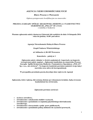 AGENCJA NIERUCHOMOŚCI ROLNYCH Biuro Prezesa w Warszawie Ogłasza postępowanie kwalifikacyjne na stanowisko: PREZESA ZARZĄDU SPÓŁKI KRAKOWSKA HODOWLA I NASIENNICTWO OGRODNICZE „POLAN” SP. Z O.O. z siedzibą w Krakowie Pisemne zgłoszenia należy dostarczyć listownie lub osobiście do dnia 14 listopada 2016 roku do godziny 16.00 pod adres: Agencja Nieruchomości Rolnych Biuro Prezesa Zespół Nadzoru Właścicielskiego ul. Inflancka 4, 00-189 Warszawa Kancelaria – pokój nr 1 Zgłoszenia należy składać w dwóch zamkniętych kopertach, na kopercie wewnętrznej należy napisać „ Zgłoszenie kandydata na stanowisko Prezesa Zarządu Spółki Krakowska Hodowla i Nasiennictwo Ogrodnicze „POLAN” Sp. z o.o., nie otwierać”. Na kopercie kandydat powinien umieścić swoje imię i nazwisko oraz adres do korespondencji. W przypadku przesłania pocztą decyduje data wpływu do Agencji Zgłoszenia, które wpłyną, lub zostaną złożone po wskazanym terminie, będą zwracane kandydatom bez otwierania. Zgłoszenie powinno zawierać: życiorys zawodowy, oświadczenie o ukończeniu studiów wyższych, oświadczenie o posiadaniu co najmniej pięcioletniego doświadczenia zawodowego, oświadczenie o korzystaniu z pełni praw publicznych, oświadczenie o posiadaniu pełnej zdolności do czynności prawnych, 1 oświadczenie o nie podleganiu określonym w przepisach prawa ograniczeniom, lub zakazom zajmowania stanowiska członka zarządu w spółkach handlowych, oświadczenie o nie pozostawaniu w konflikcie interesów ze Spółką, oświadczenie kandydata o wyrażeniu zgody na przetwarzanie danych osobowych do celów postępowania kwalifikacyjnego na członka zarządu spółki, zgodnie z ustawą z dnia 29 sierpnia 1997 r. o ochronie danych osobowych (tekst jedn.: Dz.U. z 2016 r., poz. 922), koncepcję prowadzenia Spółki – program pięcioletni. Do zgłoszenia należy dołączyć: oryginał, lub odpis dyplomu ukończenia studiów wyższych, dokumenty potwierdzające posiadane doświadczenie zawodowe, zaświadczenie o niekaralności (wydane nie wcześniej niż 3 miesiące przed datą złożenia dokumentów), aktualny numer telefonu. W konkursie nie mogą startować kandydaci pozostający w konflikcie interesów ze Spółką. Zgłoszenia kandydatów niespełniające wymogów określonych w ogłoszeniu oraz złożone po terminie nie podlegają rozpatrzeniu. Informacje na temat Spółki można uzyskać osobiście w terminie do dnia 14 listopada 2016 roku: w siedzibie Spółki Krakowska Hodowla i Nasiennictwo Ogrodnicze „POLAN” Sp. z o.o., 30-130 Kraków, ul. Rydla 53/55. Informacje na temat Spółki będą udostępniane w dniach roboczych w godzinach pracy Spółki. Ponadto informacje na temat Spółki można uzyskać na stronie internetowej Spółki: www.nasiona.pl Otwarcie zgłoszeń odbędzie się w dniu 15 listopada 2016 roku. Rozmowy kwalifikacyjne z kandydatami, którzy spełniają wymagania formalne określone w niniejszym ogłoszeniu, odbędą się w terminie do dnia 25 listopada 2016 roku w Zespole Nadzoru Właścicielskiego Biura Prezesa Agencji Nieruchomości Rolnych w Warszawie przy ul. Inflanckiej 4. Terminy rozmów będą ustalane z kandydatami telefonicznie. 2 Przedmiotem rozmowy kwalifikacyjnej będzie: wiedza w zakresie działalności spółki oraz o sektorze, w którym działa ta spółka, znajomość zagadnień związanych z zarządzaniem i kierowaniem zespołami pracowników, znajomość zasad funkcjonowania spółek prawa handlowego, ze szczególnym uwzględnieniem spółek z udziałem Skarbu Państwa, znajomość zasad wynagradzania w spółkach z udziałem Skarbu Państwa, znajomość ograniczeń prowadzenia działalności gospodarczej przez osoby pełniące funkcje publiczne, doświadczenie niezbędne do wykonywania funkcji prezesa zarządu w spółce, znajomość zasad nadzoru właścicielskiego, audytu i kontroli finansowej przedsiębiorstwa oraz rachunkowości zarządczej, wiedzę w zakresie oceny projektów inwestycyjnych, ocena przedstawionej koncepcji prowadzenia spółki. Postępowanie kwalifikacyjne może być w każdym czasie i bez podania przyczyny zakończone bez wyłonienia kandydata. Kandydaci uczestniczący w postępowaniu kwalifikacyjnym, o jego wynikach zostaną poinformowani listownie. 3