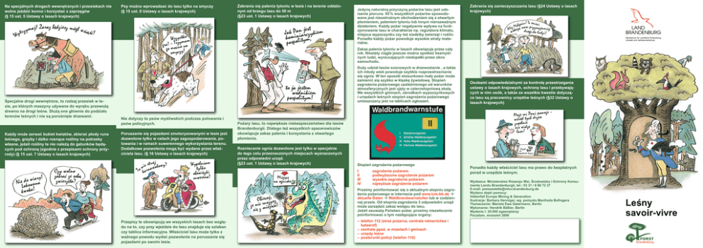 Na specjalnych drogach wewnętrznych i przesiekach nie wolno jeździć konno i korzystać z zaprzęgów (§ 15 ust. 5 Ustawy o lasach krajowych) trz Wy araz będziesz mógł w ymaj! Z s iąść! Specjalne drogi wewnętrzne, to rodzaj przesiek w lesie, po których maszyny używane do wyrębu przewożą drewno na drogi leśne. Służą one głównie do podziału terenów leśnych i nie są porośnięte drzewami. Każdy może zerwać bukiet kwiatów, zbierać płody runa leśnego, grzyby i dziko rosnące rośliny na potrzeby własne, jeżeli rośliny te nie należą do gatunków będących pod ochroną (zgodnie z przepisami ochrony przyrody) (§ 15 ust. 7 Ustawy o lasach krajowych) wiary! Nie dkoowana Lo ! kwoka Czy wolno zabrać ze sobą zwierzęta? Psy można wprowadzać do lasu tylko na smyczy (§ 15 ust. 8 Ustawy o lasach krajowych) Zabrania się palenia tytoniu w lesie i na terenie oddalonym od brzegu lasu do 50 m (§23 ust. 1 Ustawy o lasach krajowych) est Jak Panniajrczykiem komi litym, pospo Wszystkaom ym gra! – oTrczno na go m czy! smy to ja jestem wodnikiem pospolitym! Nie dotyczy to psów myśliwskich podczas polowania i psów policyjnych. Poruszanie się pojazdami zmotoryzowanymi w lesie jest dozwolone tylko w celach jego zagospodarowania, polowania i w ramach suwerennego wykorzystania terenu. Dodatkowe pozwolenia mogą być wydane przez właściciela lasu. (§ 16 Ustawy o lasach krajowych) rój ie stawałowy? n To karn Wypełniam tylko obowięzki suwerena! Rozniecanie ognia dozwolone jest tylko w specjalnie do tego celu przeznaczonych miejscach wyznaczonych przez odpowiedni urząd. (§23 ust. 1 Ustawy o lasach krajowych) Miejsce na ognisko Zabrania się zanieczyszczania lasu (§24 Ustawy o lasach krajowych) osiu! Te śmiec Małąg nam przynai jmn ż e l iej A każ ws drogę do ludzi! Ministerium für Ländliche Entwicklung, Umwelt und Verbraucherschutz Zakaz palenia tytoniu w lasach obowiązuje przez cały rok. Niestety ciągle jeszcze można spotkać bezmyślnych ludzi, wyrzucających niedopałki przez okno samochodu. Duży udział lasów sosnowych w drzewostanie , a także ich młody wiek powoduje szybkie rozprzestrzenianie się ognia. W ten sposób stosunkowo mały pożar może zamienić się szybko w klęskę żywiołową. Stopień zagrożenia pożarowego uzależnionego od warunków atmosferycznych jest ujęty w czterostopniową skalę. We wszystkich gminach, ośrodkach wypoczynkowych i urzędach leśnych stopień zagrożenia pożarowego umieszczany jest na tablicach ogłoszeń. Osobami odpowiedzialnymi za kontrolę przestrzegania ustawy o lasach krajowych, ochronę lasu i przebywających w nim osób, a także za wszelkie kwestie dotyczące lasu są pracownicy urzędów leśnych (§32 Ustawy o lasach krajowych) oże – Może mi Pandri zepowm ch ty wśród zupełnie nie widzę lasu! Pożary lasu, to największe niebezpieczeństwo dla lasów Brandenburgii. Dlatego też wszystkich spacerowiczów obowiązuje zakaz palenia i korzystania z otwartego płomienia. Obiecsazjy, sz że nize rmuiejsca! się Przepisy te obowiązują we wszyskich lasach bez względu na to, czy przy wjeździe do lasu znajduje się szlaban czy tablica informacyjna. Właściciel lasu może tylko z ważnego powodu wydać pozwolenie na poruszanie się pojazdami po swoim lesie. Jedyną naturalną przyczyną pożarów lasu jest uderzenie pioruna. 95 % wszystkich pożarów spowodowane jest nieostrożnym obchodzeniem się z otwartym płomieniem, paleniem tytoniu lub innym nierozważnym działaniem. Każdy pożar negatywnie wpływa na funkcjonowanie lasu w charakterze np. regulatora klimatu, miejsca wypoczynku czy też siedziby zwierząt i roślin. Ponadto każdy pożar powoduje wysokie straty materialne. Urząd ds. gospodarki leśnej Stopień zagrożenia pożarowego I II III IV zagrożenie pożarem podwyższone zagrożenie pożarem wysokie zagrożenie pożarem najwyższe zagrożenie pożarem Prosimy poinformować się o aktualnym stopniu zagrożenia pożarowego w internecie pod www.luis-bb.de aktuelle Daten Waldbrandwarnstufen lub w codziennej prasie. Od stopnia zagrożenia 3 odpowiedni urząd może zarządzić zakaz wstępu do lasu. Jeżeli zauważą Państwo pożar, prosimy niezwłocznie poinformować o tym następujące organy: – telefon 112 (straż pożarna, centrala ratownictwa i katasrof) – centrale ppoż. w miastach i gminach – urzędy leśne – posterunki policji (telefon 110) Ponadto każdy właściciel lasu ma prawo do bezpłatnych porad w urzędzie leśnym. Wydawca: Ministerstwo Rozwoju Wsi, Środowiska i Ochrony Konsumenta Landu Brandenburgii, tel.: 03 31 / 8 66 72 37 E-mail: [email protected] Wydano dzęki pomocy: Vattenfall Europe Mining & Generation Ilustracje: Barbara Henniger, wg. pomysłu Manfreda Bofingera Tłumaczenie: Mariola Ewa Gatermann, Berlin Wykonanie: Hendrik Bäßler, Berlin Wydanie I: 20.000 egzemplarzy Poczdam, wrzesień 2006 Leśny savoir-vivre Las, to każdy teren na którym rośnie roślinność leśna. Na tym terenie obowiązuje prawo leśne landu Brandenburgii (§ 2 Ustawy o lasach krajowych) Do widzenia stary! Teraz podlegasz już prawu leśnemu! Wykorzystanie lasu w innych celach niż gospodarka leśna możliwe jest tylko za zgodą Urzędu Gospodarki Leśnej (§8 Ustawy o lasach krajowych) Czy ma Pan zezwolenie straży pożarnej? Wejście na teren lasu w celach rekreacyjnych odbywa się na własną odpowiedzialność. Właściciel lasu nie odpowiada za szkody poniesione w wyniku niebezpieczeństw typowych dla lasu. (§14 Ustawy o lasach krajowych) Kto znajduje się w lesie, powinien zachowywać się tak, ażeby środowisko leśne było w jak najmniejszym stopniu zakłócone, żeby nie przeszkadzać działalności gospodarczej, nie narażać lasu na szkody, nie zaśmiecać go i nie przeszkadzać innym w użytkowaniu go do celów rekreacyjnych (§ 15 ust. 2 Ustawy o lasach krajowych) W lesie jazda na rowerze dozwolona jest (tylko) na drogach leśnych (§ 15 ust. 4 Usta