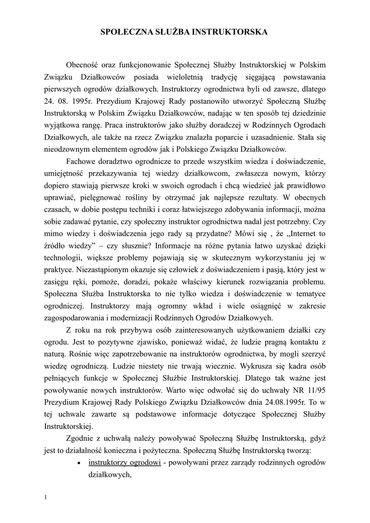 SPOŁECZNA SŁUŻBA INSTRUKTORSKA Obecność oraz funkcjonowanie Społecznej Służby Instruktorskiej w Polskim Związku Działkowców posiada wieloletnią tradycję sięgającą powstawania pierwszych ogrodów działkowych. Instruktorzy ogrodnictwa byli od zawsze, dlatego 24. 08. 1995r. Prezydium Krajowej Rady postanowiło utworzyć Społeczną Służbę Instruktorską w Polskim Związku Działkowców, nadając w ten sposób tej dziedzinie wyjątkowa rangę. Praca instruktorów jako służby doradczej w Rodzinnych Ogrodach Działkowych, ale także na rzecz Związku znalazła poparcie i uzasadnienie. Stała się nieodzownym elementem ogrodów jak i Polskiego Związku Działkowców. Fachowe doradztwo ogrodnicze to przede wszystkim wiedza i doświadczenie, umiejętność przekazywania tej wiedzy działkowcom, zwłaszcza nowym, którzy dopiero stawiają pierwsze kroki w swoich ogrodach i chcą wiedzieć jak prawidłowo uprawiać, pielęgnować rośliny by otrzymać jak najlepsze rezultaty. W obecnych czasach, w dobie postępu techniki i coraz łatwiejszego zdobywania informacji, można sobie zadawać pytanie, czy społeczny instruktor ogrodnictwa nadal jest potrzebny. Czy mimo wiedzy i doświadczenia jego rady są przydatne? Mówi się , że „Internet to źródło wiedzy” – czy słusznie? Informacje na różne pytania łatwo uzyskać dzięki technologii, większe problemy pojawiają się w skutecznym wykorzystaniu jej w praktyce. Niezastąpionym okazuje się człowiek z doświadczeniem i pasją, który jest w zasięgu ręki, pomoże, doradzi, pokaże właściwy kierunek rozwiązania problemu. Społeczna Służba Instruktorska to nie tylko wiedza i doświadczenie w tematyce ogrodniczej. Instruktorzy mają ogromny wkład i wiele osiągnięć w zakresie zagospodarowania i modernizacji Rodzinnych Ogrodów Działkowych. Z roku na rok przybywa osób zainteresowanych użytkowaniem działki czy ogrodu. Jest to pozytywne zjawisko, ponieważ widać, że ludzie pragną kontaktu z naturą. Rośnie więc zapotrzebowanie na instruktorów ogrodnictwa, by mogli szerzyć wiedzę ogrodniczą. Ludzie niestety nie trwają wiecznie. Wykrusza się kadra osób pełniących funkcje w Społecznej Służbie Instruktorskiej. Dlatego tak ważne jest powoływanie nowych instruktorów. Warto więc odwołać się do uchwały NR 11/95 Prezydium Krajowej Rady Polskiego Związku Działkowców dnia 24.08.1995r. To w tej uchwale zawarte są podstawowe informacje dotyczące Społecznej Służby Instruktorskiej. Zgodnie z uchwałą należy powoływać Społeczną Służbę Instruktorską, gdyż jest to działalność konieczna i pożyteczna. Społeczną Służbę Instruktorską tworzą: instruktorzy ogrodowi - powoływani przez zarządy rodzinnych ogrodów działkowych, 1 instruktorzy okręgowi - powoływani przez prezydia okręgowych zarządów PZD, instruktorzy krajowi - powoływani przez Prezydium Krajowej Rady Związku. Instruktorów powołuje się w następujący sposób: instruktorów ogrodowych – powołuje się spośród doświadczonych i odpowiednio przeszkolonych działkowców, wieloletnich, instruktorów okręgowych – powołuje się spośród instruktorów ogrodowych legitymujących się co najmniej 3-letnim stażem instruktorskim lub działkowców posiadających wykształcenie ogrodnicze, rolnicze, przyrodnicze instruktorów krajowych – powołuje się spośród instruktorów ogrodowych posiadających co najmniej 5-letni staż instruktorski, instruktorów okręgowych posiadających co najmniej 2-leni staż instruktorski lub działkowców posiadających wykształcenie, rolnicze, przyrodnicze. Jeżeli nie jest możliwe powoływanie nowych instruktorów warto zastanowić się jaka jest tego przyczyna. Być może brakuje osób chętnych do społecznej służby innym działkowcom. Może jest to spowodowane nieśmiałością lub brakiem pewności swoich własnych umiejętności i wiedzy. Dlatego do Zarządów Rodzinnych Ogrodów Działkowych kierowany jest apel o zwiększenie aktywności w pozyskiwaniu nowych instruktorów. Być może, wśród działkowców są osoby posiadające wykształcenie rolnicze bądź ogrodnicze, które mogłyby szerzyć zdobytą wiedzę. Może są osoby dla których ogrodnictwo to pasja i z chęcią tę pasję przekażą innym. Promując i zachęcając do przyłączenia się do Społecznej Służby Instruktorskiej, poprawiamy funkcjonowanie całego stowarzyszenia ogrodowego. Należy zachęcać potencjalnych kandydatów na instruktorów możliwością rozwoju, poprzez udział w specjalnych szkoleniach instruktorskich, prelekcjach, pokazach, mających na celu umocnienie posiadanej już wiedzy oraz zdobyciu nowych informacji z działu ogrodnictwa. Szkolenia instruktorskie, prowadzone przez wykwalifikowanych pracowników wyższych uczelni zapewnią jakość zdobywanej wiedzy. Warto przybliżać i omawiać działalność instruktorów zainteresowanym osobom. Służba instruktorska to nie tylko porady ogrodnicze i przekazywanie wiedzy poprzez szkolenia instruktażowe innym działkowcom. To również wkład w zakres zagospodarowania i modernizacji ogrodów, pomoc przy organizacji różnych konkursów, aktywność w wizji lokalnej. Przede 2 wszystkim to bezpośredni i ciągły kontakt z odpowiednimi jednostkami, pozwalający na szybki przepływ informacji. Zarządy Rodzinnych Ogrodów Działkowych powinny zweryfikować stan liczbowy obecnych instruktorów ogrodowych oraz zwiększyć aktywność w pozyskiwaniu nowych chętnych, pełnych pasji do pełnienia służby instruktorskiej. Zarządy ROD powinny udostępniać tablice informacyjne w Rodzinnych Ogrodach Działkowych instruktorom, w celu przekazywania informacji użytkownikom ogrodów. Na terenie każdego Rodzinnego Ogrodu Działkowego np. na tablicy informacyjnej powinna znajdować się informacja dotycząca kontaktu z instruktorami. Społeczna Służba Instruktorska to wiele ważnych zadań do wykonania, to pomoc i doradztwo ogrodnicze, t