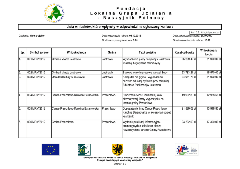 Lista wniosków, które wpłynęły w odpowiedzi na ogłoszony konkurs Działanie: Małe projekty Data rozpoczęcia naboru: 01.10.2012 Zał. 3.2. Książki procedur Data zakończenia naboru: 31.10.2012 Godzina rozpoczęcia naboru: 9.00 Godzina zakończenia naboru: 16.00 1. 001/MP/V/2012 Gmina i Miasto Jastrowie Jastrowie Wyposażenia plaży miejskiej w Jastrowiu w sprzęt turystyczno-rekreacyjny 35 229,40 zł Wnioskowana kwota 21 900,00 zł 2. 3. 002/MP/V/2012 003/MP/V/2012 Gmina i Miasto Jastrowie Ośrodek Kultury w Jastrowiu Jastrowie Jastrowie Budowa wiaty imprezowej we wsi Budy Komputer nie gryzie - wyposażenie centrum edukacji cyfrowej przy Miejskiej Bibliotece Publicznej w Jastrowiu 23 733,21 zł 34 971,75 zł 15 570,00 zł 21 900,00 zł 4. 004/MP/V/2012 Canoe Przechlewo Karolina Baranowska Przechlewo Stworzenie wioski indiańskiej jako alternatywnej formy wypoczynku na terenie gminy Przechlewo 19 902,80 zł 12 958,56 zł 5. 005/MP/V/2012 Canoe Przechlewo Karolina Baranowska Przechlewo Doposażenie firmy Canoe Przechlewo Karolina Baranowska w akcesoria i sprzęt kajakarski 21 589,08 zł 13 916,80 zł 6. 006/MP/V/2012 Gmina Przechlewo Przechlewo Wydanie publikacji informacyjnopromocyjnych o ścieżkach pieszo rowerowych na terenie Gminy Przechlewo 23 202,00 zł 17 390,00 zł Lp. Symbol sprawy Wnioskodawca Gmina Tytuł projektu Strona 1 z 9 Koszt całkowity Lp. Symbol sprawy Wnioskodawca Gmina Tytuł projektu Koszt całkowity Wnioskowana kwota 7. 007/MP/V/2012 Gmina Okonek Okonek Wymiana elementów placu zabaw w miejscowości Okonek 28 960,00 zł 17 483,45 zł 8. 008/MP/V/2012 Gmina Okonek Okonek Przygotowanie i wydanie folderów informacyjnych Gminy Okonek 13 008,60 zł 8 489,60 zł 9. 009/MP/V/2012 Gmina Okonek Okonek Budowa placu zabaw w Lubniczce wraz z zagospodarowaniem terenu 36 360,00 zł 21 999,00 zł 10. 010/MP/V/2012 Gmina Człuchów Człuchów Zakup wyposażenia do świetlic wiejskich na terenie Gminy Człuchów 10 772,86 zł 5 650,00 zł 11. 011/MP/V/2012 Gminny Ośrodek Kultury w Lipce Lipka Zakup wyposażenia dla Gminnej Biblioteki Publicznej w Lipce 27 060,00 zł 17 600,00 zł 12. 012/MP/V/2012 Gmina Lipka Lipka Budowa wiaty rekreacyjno-wypoczynkowej z kominkiem w miejscowości Łąkie 34 964,00 zł 17 900,00 zł 13. 013/MP/V/2012 Piotr Frieda Przechlewo Zakup sprzętu do gry w paintball (woodsball) 20 269,67 zł 9 587,04 zł 14. 014/MP/V/2012 Spółdzielnia Mieszkaniowa "Zacisze" w Lipce Lipka Utworzenie miejsca rekreacji dla dzieci i dorosłych na osiedlu mieszkaniowym w Lipce 27 132,27 zł 19 990,00 zł 15. 015/MP/V/2012 Stowarzyszenie Przyjaciół Szkoły "Aktywna Trójwieś" Okonek Budowa placu zabaw w Pniewie 18 770,51 zł 13 800,00 zł 16. 016/MP/V/2012 Przedsiębiorstwo Usługowe Tomasz Biały/Biały Gryfice Utworzenie internetowego portalu agroturystycznego dla obszaru LGD "Naszyjnik Północy" 33 656,80 zł 24 000,00 zł Strona 2 z 9 Lp. Symbol sprawy Wnioskodawca Gmina Tytuł projektu Koszt całkowity Wnioskowana kwota 17. 017/MP/V/2012 Tomasz Szyszka Człuchów Utworzenie placu zabaw przy gospodarstwie agroturystycznym w miejscowości Sokole 14 755,60 zł 11 804,48 zł 18. 018/MP/V/2012 Joanna Lucyna Szyszka Człuchów Adaptacja pomieszczenia przeznaczonego na "Pracownię garncarską" w miejscowości Sokole, gm. Człuchów 32 674,69 zł 24 900,00 zł 19. 019/MP/V/2012 Joanna Lucyna Szyszka Człuchów Metal, glina i wiklina - wykorzystując zasoby natury i rąk - Warsztaty Rękodzieła 10 179,30 zł 8 143,44 zł 20. 020/MP/V/2012 Michał Łukasz Szałek Przechlewo Rozpowszechnianie świadomości prawnej oraz zapewnienie dostępu do profesjonalnych usług prawniczych dla społeczności terenów wiejskich 22 799,07 zł 17 467,33 zł 21. 021/MP/V/2012 Stowarzyszenie "Na Rzecz Rozwoju Miasta i Gminy Debrzno" Debrzno Promocja produktów lokalnych szansą na inicjowanie powstania lub wprowadzania na rynek produktów, których podstawę stanowią lokalne zasoby 18 948,00 zł 14 211,00 zł 22. 022/MP/V/2012 Centrum Kultury, Sportu i Turystyki w Debrznie Debrzno "Tradycja uczy, natura bawi" - cykl imprez kulturalnych, edukacyjnych i rekreacyjnych dla mieszkańców miasta i gminy Debrzno 33 585,15 zł 10 500,00 zł Strona 3 z 9 Lp. Symbol sprawy Wnioskodawca Gmina Tytuł projektu 23. 023/MP/V/2012 Gmina Zakrzewo Zakrzewo "Gmina Zakrzewo wczoraj i dziś" wydanie informatora turystycznego 24. 024/MP/V/2012 Stowarzyszenie dla rozwoju Starej Wiśniewki i okolic "GROMADA" Zakrzewo 25. 025/MP/V/2012 Stowarzyszenie "Na Rzecz Rozwoju Miasta i Gminy Debrzno" 26. 026/MP/V/2012 27. Koszt całkowity Wnioskowana kwota 9 660,00 zł 7 200,00 zł Wyposażenie sali wiejskiej oraz organizacja kursu gotowania w Starej Wiśniewce 21 442,46 zł 16 070,00 zł Debrzno Organizacja imprezy kulturalnej dla mieszkańców gminy Debrzno 19 784,00 zł 14 600,00 zł Justyna Halusiak-Toruń Przechlewo Utworzenie wypożyczalni sprzętu rekreacyjnego w miejscowości Kleśnik 36 492,96 zł 17 990,00 zł 027/MP/V/2012 Karol Schramke Brusy Organizacja warsztatów edukacyjnointegracyjnych dla rodzin z dziećmi z terenu Lokalnej Grupy Działania Naszyjnik Północy 24 944,00 zł 17 990,00 zł 28. 028/MP/V/2012 Stowarzyszenie Przyjaciół Gminy Koczała Koczała Budowa małej infrastruktury turystycznej nad jeziorem Bardo i Resko I oraz wyznaczenie ścieżki rowerowej 39 803,62 zł 24 000,00 zł 29. 029/MP/V/2012 Gminny Klub Sportowy "Drzewiarz" Rzeczenica Rzeczenica Docieplenie elewacji budynku szatni na ogólnodostępnym boisku sportowym wraz z wymianą stolarki zewnętrznej 36 222,48 zł 17 999,00 zł 30. 030/MP/V/2012 Biblioteka Publiczna Gminy Rzeczenica Rzeczenica Zagospodarowanie otoczenia obiektu pełniącego funkcję świetlicy wiejskiej 29 504,27 zł 17 999,00 zł 31. 031/MP/V/2012 Uczniowski Klub Sportowy "Talent" Rzeczenica Budowa skoczni do skoków w dal 30 846,00 zł 17 999,00 zł Strona 4 z 9 Lp. Symbol sprawy Wnioskodawca Gmina Tytuł projektu 32. 032/MP/V/2012 Gminne Centrum Kultury Sportu