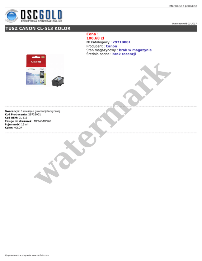 Informacje o produkcie Utworzono 03-03-2017 TUSZ CANON CL-513 KOLOR Cena : 100,68 zł er m ar k Nr katalogowy : 2971B001 Producent : Canon Stan magazynowy : brak w magazynie Średnia ocena : brak recenzji w at Gwarancja: 3 miesiące gwarancji fabrycznej Kod Producenta: 2971B001 Kod OEM: CL-513 Pasuje do drukarek:: MP240/MP260 Pojemność: 13 ml Kolor: KOLOR Wygenerowano w programie www.oscGold.com