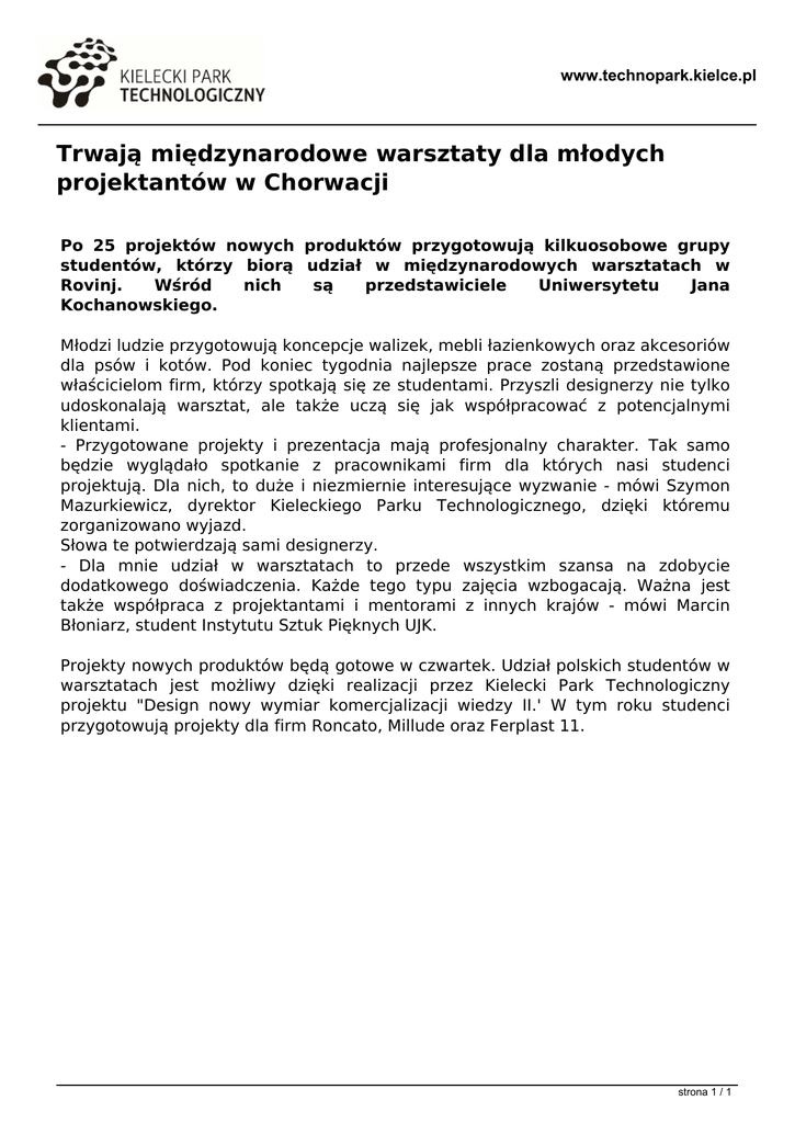 www.technopark.kielce.pl Trwają międzynarodowe warsztaty dla młodych projektantów w Chorwacji Po 25 projektów nowych produktów przygotowują kilkuosobowe grupy studentów, którzy biorą udział w międzynarodowych warsztatach w Rovinj. Wśród nich są przedstawiciele Uniwersytetu Jana Kochanowskiego. Młodzi ludzie przygotowują koncepcje walizek, mebli łazienkowych oraz akcesoriów dla psów i kotów. Pod koniec tygodnia najlepsze prace zostaną przedstawione właścicielom firm, którzy spotkają się ze studentami. Przyszli designerzy nie tylko udoskonalają warsztat, ale także uczą się jak współpracować z potencjalnymi klientami. - Przygotowane projekty i prezentacja mają profesjonalny charakter. Tak samo będzie wyglądało spotkanie z pracownikami firm dla których nasi studenci projektują. Dla nich, to duże i niezmiernie interesujące wyzwanie - mówi Szymon Mazurkiewicz, dyrektor Kieleckiego Parku Technologicznego, dzięki któremu zorganizowano wyjazd. Słowa te potwierdzają sami designerzy. - Dla mnie udział w warsztatach to przede wszystkim szansa na zdobycie dodatkowego doświadczenia. Każde tego typu zajęcia wzbogacają. Ważna jest także współpraca z projektantami i mentorami z innych krajów - mówi Marcin Błoniarz, student Instytutu Sztuk Pięknych UJK. Projekty nowych produktów będą gotowe w czwartek. Udział polskich studentów w warsztatach jest możliwy dzięki realizacji przez Kielecki Park Technologiczny projektu "Design nowy wymiar komercjalizacji wiedzy II.' W tym roku studenci przygotowują projekty dla firm Roncato, Millude oraz Ferplast 11. strona 1 / 1 Powered by TCPDF (www.tcpdf.org)