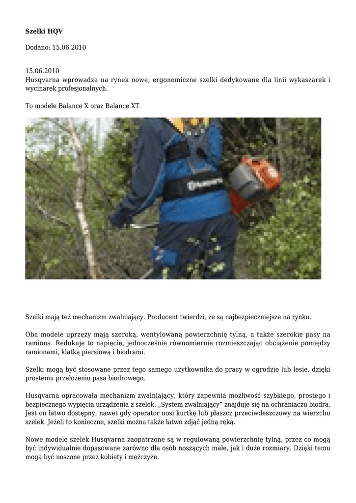 Szelki HQV Dodano: 15.06.2010 15.06.2010 Husqvarna wprowadza na rynek nowe, ergonomiczne szelki dedykowane dla linii wykaszarek i wycinarek profesjonalnych. To modele Balance X oraz Balance XT. Szelki mają też mechanizm zwalniający. Producent twierdzi, że są najbezpieczniejsze na rynku. Oba modele uprzęży mają szeroką, wentylowaną powierzchnię tylną, a także szerokie pasy na ramiona. Redukuje to napięcie, jednocześnie równomiernie rozmieszczając obciążenie pomiędzy ramionami, klatką piersiową i biodrami. Szelki mogą być stosowane przez tego samego użytkownika do pracy w ogrodzie lub lesie, dzięki prostemu przełożeniu pasa biodrowego. Husqvarna opracowała mechanizm zwalniający, który zapewnia możliwość szybkiego, prostego i bezpiecznego wypięcia urządzenia z szelek. „System zwalniający” znajduje się na ochraniaczu biodra. Jest on łatwo dostępny, nawet gdy operator nosi kurtkę lub płaszcz przeciwdeszczowy na wierzchu szelek. Jeżeli to konieczne, szelki można także łatwo zdjąć jedną ręką. Nowe modele szelek Husqvarna zaopatrzone są w regulowaną powierzchnię tylną, przez co mogą być indywidualnie dopasowane zarówno dla osób noszących małe, jak i duże rozmiary. Dzięki temu mogą być noszone przez kobiety i mężczyzn. Modele Balance X oraz Balance XT mogą być stosowane do maszyn o pojemności skokowej od 35 cm sześc. wzwyż. firmylesne.pl Źródło: Husqvarna Komentarze (0) Nie dodano jeszcze żadnego komentarza.