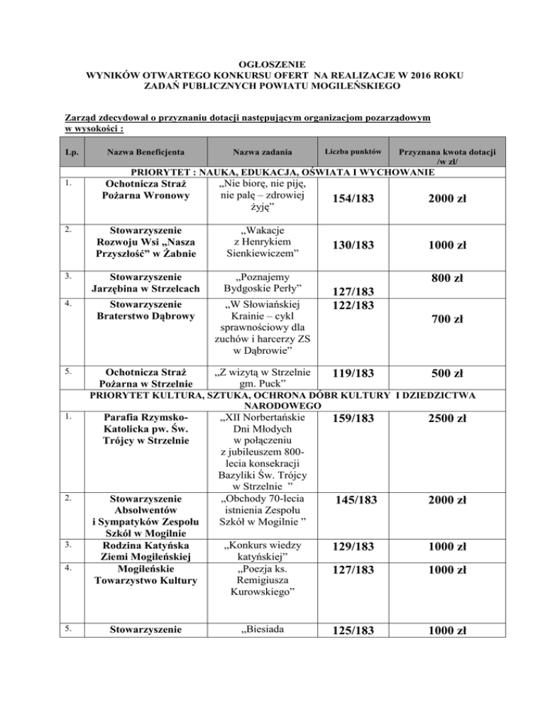 OGŁOSZENIE WYNIKÓW OTWARTEGO KONKURSU OFERT NA REALIZACJE W 2016 ROKU ZADAŃ PUBLICZNYCH POWIATU MOGILEŃSKIEGO Zarząd zdecydował o przyznaniu dotacji następującym organizacjom pozarządowym w wysokości : Lp. Nazwa Beneficjenta Nazwa zadania Liczba punktów Przyznana kwota dotacji /w zł/ PRIORYTET : NAUKA, EDUKACJA, OŚWIATA I WYCHOWANIE Ochotnicza Straż Pożarna Wronowy „Nie biorę, nie piję, nie palę – zdrowiej żyję” 154/183 2000 zł Stowarzyszenie Rozwoju Wsi „Nasza Przyszłość” w Żabnie „Wakacje z Henrykiem Sienkiewiczem” 130/183 1000 zł 3. Stowarzyszenie Jarzębina w Strzelcach „Poznajemy Bydgoskie Perły” 4. Stowarzyszenie Braterstwo Dąbrowy „W Słowiańskiej Krainie – cykl sprawnościowy dla zuchów i harcerzy ZS w Dąbrowie” Ochotnicza Straż Pożarna w Strzelnie „Z wizytą w Strzelnie gm. Puck” 1. 2. 5. 800 zł 127/183 122/183 700 zł 119/183 500 zł PRIORYTET KULTURA, SZTUKA, OCHRONA DÓBR KULTURY I DZIEDZICTWA NARODOWEGO 1. Parafia RzymskoKatolicka pw. Św. Trójcy w Strzelnie 2. Stowarzyszenie Absolwentów i Sympatyków Zespołu Szkół w Mogilnie Rodzina Katyńska Ziemi Mogileńskiej Mogileńskie Towarzystwo Kultury 3. 4. 5. Stowarzyszenie „XII Norbertańskie Dni Młodych w połączeniu z jubileuszem 800lecia konsekracji Bazyliki Św. Trójcy w Strzelnie ” „Obchody 70-lecia istnienia Zespołu Szkół w Mogilnie ” 159/183 2500 zł 145/183 2000 zł „Konkurs wiedzy katyńskiej” „Poezja ks. Remigiusza Kurowskiego” 129/183 1000 zł 127/183 1000 zł „Biesiada 125/183 1000 zł 6. 7. 8. 9. 10. 1. 2. 3. 4. 5. 6. 7. „Wspólna Droga” w Marcinkowie Gminny Związek Rolników Kółek i Organizacji Rolniczych w Mogilnie Stowarzyszenie Rozwoju Wsi „Nasza Przyszłość” w Żabnie Ochotnicza Straż Pożarna Wronowy Ochotnicza Straż Pożarna w Goryszewie Ochotnicza Straż Pożarna w Wylatowie z ziemniakiem w Marcinkowie” „Święto Kapusty” „Gęsina nie tylko na Świętego Marcina Obchody 90-lecia Ochotniczej Straży Pożarnej we Wronowach ” „ Święto kaszy” 122/183 1000 zł 121/183 1000 zł 118/183 300 zł 117/183 750 zł „Straż Zakonna 112/183 450 zł w Niepokalanowie, historia, tradycja, współczesność” PRIORYTET WSPIERANIE I UPOWSZECHNIANIE KULTURY FIZYCZNEJ „Szkolenie sportowe Klub Sportowy Nart dla dzieci i Wodnych SUNAL – 183/244 2500 zł młodzieży” Przyjezierze „Dziecięce biegi Stowarzyszenie uliczne” Przyjaciół Szkoły 1500 zł Podstawowej 180/244 z Oddziałami Integracyjnymi w Parlinie „Integracja” Mistrzostwa Powiatu Gminny Związek Mogileńskiego Rolników Kółek 173/244 1500 zł w powożeniu i Organizacji zaprzęgami konnymi Rolniczych w Dąbrowie z siedzibą w Słaboszewku „III Turniej Stowarzyszenie amatorskich drużyn „Wspólna Droga 164/244 1000 zł piłkarskich w Marcinkowie” „Wyprawa na Dziki „Inicjatywa”Zachód” Stowarzyszenie na 700 zł 161/244 Rzecz Rozwoju Sołectwa Padniewko Zakończenie Ligi Uczniowski Klub Pływackiej Szkół Sportowy ORKA 1900 zł Podstawowych 156/244 Powiatu Mogileńskiego Stowarzyszenie „Wiejski Turniej 156/244 1. 2. 3. 1. tenisa stołowego„ Aktywnych Kobiet 900 zł „Malwa” PRIORYTET DZIAŁANIA NA RZECZ OSÓB NIEPEŁNOSPRAWNYCH „Wycieczka Stowarzyszenie na Rzecz Wspierania Osób integracyjna do ZOO 1000 zł 180/244 w Poznaniu” z Zaburzeniami psychicznymi „Szansa” Piknik integracyjny Stowarzyszenie w Chałupskach „Wspólna Droga 178/244 1000 zł w Marcinkowie” „Poznaj Przyrodę, Parafia rzymskopoczuj przyrodę” katolicka pw. św. 161/244 1000 zł Faustyny Mogilno PRIORYTET 7. TURYSTYKA I KRAJOZNAWSTWO: „Atrakcje Polskie Towarzystwo 147/183 2700 zł TurystycznoKrajoznawcze oddział im. Antoniego Słowińskiego w Strzelnie 2. 1. Stowarzyszenie Jarzębina w Strzelcach TurystycznoKrajoznawcze Powiatu Mogilno”Informator na jubileusz 60-lecia oddziału PTTK im. Antoniego Słowińskiego w Strzelnie ” Powiat Mogileński w obiektywie: a to gmina Mogilno właśnie” 125/183 300 zł PRIORYTET : DZIAŁANIA NA RZECZ ORGANIZACJI POZARZĄDOWYCH „e-PUAP, GIODO Stowarzyszenie „Młode 1350 zł 201/244 -po co to NGO-som” Dęby” Stowarzyszenie „Forum Lokalna Grupa 2125 zł przedsiębiorczości działania Sąsiedzi 185/244 Powiatu wokół Szlaku Mogileńskiego” Piastowskiego Pliki do pobrania: Uchwała Nr 177/15 Zarządu Powiatu w Mogilnie wraz z uzasadnieniem z dnia 17 marca 2016 r. w sprawie rozstrzygnięcia otwartego konkursu ofert na realizację zadań publicznych w 2016 roku 2.