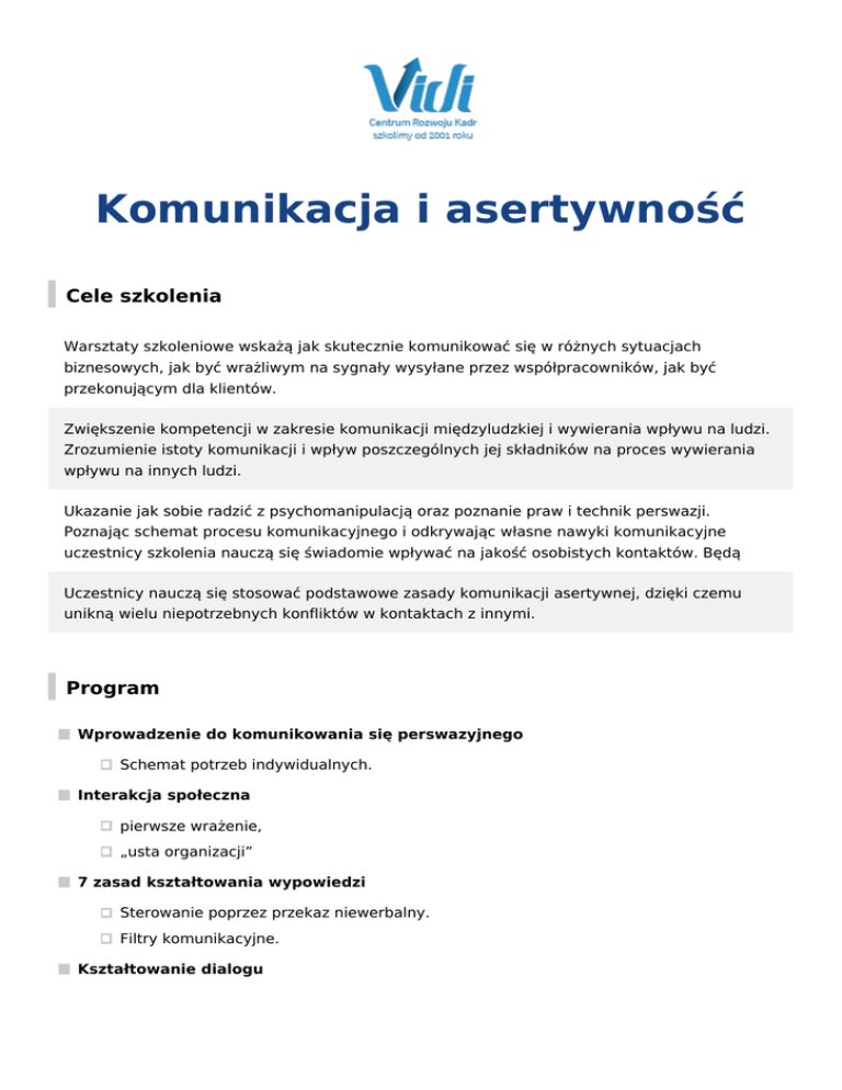 Komunikacja i asertywność Cele szkolenia Warsztaty szkoleniowe wskażą jak skutecznie komunikować się w różnych sytuacjach biznesowych, jak być wrażliwym na sygnały wysyłane przez współpracowników, jak być przekonującym dla klientów. Zwiększenie kompetencji w zakresie komunikacji międzyludzkiej i wywierania wpływu na ludzi. Zrozumienie istoty komunikacji i wpływ poszczególnych jej składników na proces wywierania wpływu na innych ludzi. Ukazanie jak sobie radzić z psychomanipulacją oraz poznanie praw i technik perswazji. Poznając schemat procesu komunikacyjnego i odkrywając własne nawyki komunikacyjne uczestnicy szkolenia nauczą się świadomie wpływać na jakość osobistych kontaktów. Będą Uczestnicy nauczą się stosować podstawowe zasady komunikacji asertywnej, dzięki czemu unikną wielu niepotrzebnych konfliktów w kontaktach z innymi. Program Wprowadzenie do komunikowania się perswazyjnego Schemat potrzeb indywidualnych. Interakcja społeczna pierwsze wrażenie, „usta organizacji” 7 zasad kształtowania wypowiedzi Sterowanie poprzez przekaz niewerbalny. Filtry komunikacyjne. Kształtowanie dialogu Budowanie poczucia tożsamości grupowej. Reagowanie kontrolowane. Wywoływanie automatycznych wzorców zachowań. Przełamywanie lodów. Własny styl kierowania ludźmi. Style prowadzenia rozmów. Stosowanie kar i nagród. Komunikacja perswazyjna Komunikaty jednostronne i dwustronne. Zachowania oparte na emocjach. Komunikaty emocjonalne i racjonalne. Dane obiektywne i subiektywne. Oddziaływanie na zmysły. Zadawanie pytań otwartych , zamkniętych i sugerujących. Język korzyści. Presupozycje. Typy osobowości biznesowych Czym jest osobowość i temperament Osobowość a kompetencje zawodowe Wpływ cech osobowości i temperamentu na potencjał zawodowy człowieka Rola dopasowania osobowościowego pracownika do stanowiska i miejsca pracy Przegląd nowoczesnych teorii i koncepcji osobowości Szesnaście typów osobowości i temperamentu w koncepcji MBTI (the Myers-Briggs Type Indicator), opartej na osiągnięciach C.G.Junga Określanie typu osobowości – proste metody diagnozy typu osobowości Zasady bezpośredniego wpływu społecznego Zasada autorytetu. Zasada niedostępności. Zasada kontrastu. Zasada wzajemności. Zasada zaangażowania. Zasada budowania sympatii. Zasada dowodu społecznego. Asertywność w sytuacjach stresowych Postawa asertywna (nastawienie do siebie, drugiego człowieka i życia) Zachowanie asertywne a zachowanie nieasertywne (bierne, agresywne, manipulacyjne) Czynniki hamujące asertywność Asertywność w kontaktach z klientami i współpracownikami. Wzmacnianie motywacji do rozwijania asertywności. Rozpoznanie obszarów interakcji społecznych, w których osoba zachowuje się asertywnie i nieasertywnie. Rozwijanie postawy asertywnej praca z „hamulcami” asertywności, budowanie i wzmacnianie pozytywnego obrazu siebie, poszerzanie samowiedzy, życie w zgodzie ze swoimi wartościami, wytyczanie realistycznych celów, dbanie o siebie, kontakt ze swoimi uczuciami, rozwijanie samokontroli, wzmacnianie umiejętności wyboru. Rozwijanie umiejętności asertywnego zachowania się w różnych sytuacjach społecznych przedstawianie swojego stanowiska,mówienie „nie”, przyjmowanie krytyki, sztuka konstruktywnego krytykowania, dbanie o swoje prawa, odpowiadanie na komplementy. Jak się zgłosić Aby skorzystać z warsztatu i doskonalić swoje umiejętności proszę o przesłanie wypełnionego formularza zgłoszeniowego na adres e-mail [email protected] lub pod nr faxu 32 757 00 36 lub 32 470 11 75 bądź zadzwoń do nas 32 470 11 75.