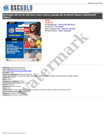 Informacje o produkcie Utworzono 03-03-2017 ActiveJet AE-611N (AE-611) tusz czarny pasuje do drukarki Epson (zamiennik T0611) Cena : 14,87 zł er m ar k Nr katalogowy : AE-611N (AE-611) Producent : ActiveJet Stan magazynowy : bardzo wysoki Średnia ocena : brak recenzji w at Gwarancja: 60 miesięcy gwarancji Kod Producenta: AE-611N (AE-611) www: Link na stronę opisu technicznego Kod OEM: T0611 Informacje dodatkowe: Wkład atramentowy Pasuje do drukarek:: Stylus: D68, D68PE, D88, D88+, D88PE, DX3800, DX3850, DX4200, DX4250, DX4800, DX4850. Pojemność: 12 ml Kolor: Czarny Zwiększona wydajność: Regular Technologia wytworzenia: 100 % nowy Wersja: Supreme Atrament: Barwnik klasa A+ Grupa: Gold Zastosowanie: Wydruki profesjonalne zdjęcia, katalogi, prezentacje, oferty, dyplomy, zaproszenia, ulotki Odwzorowanie barwy OEM: 90-100 % Hologram: hologram serializowany Opakowanie: foliowane, odporne na UV Wygenerowano w programie www.oscGold.com