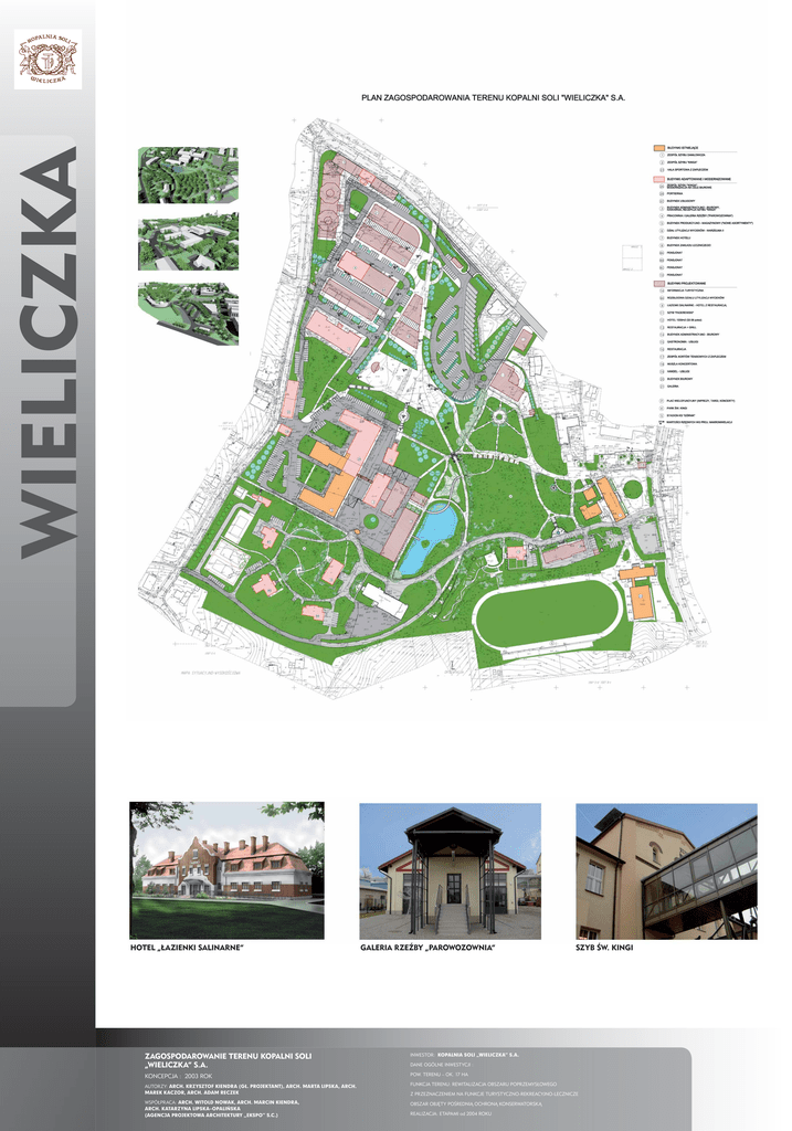WIELICZKA HOTEL „ŁAZIENKI SALINARNE” GALERIA RZEŹBY „PAROWOZOWNIA” ZAGOSPODAROWANIE TERENU KOPALNI SOLI „WIELICZKA” S.A. INWESTOR: KOPALNIA SOLI „WIELICZKA” S.A. KONCEPCJA : 2003 ROK POW. TERENU – OK. 17 HA AUTORZY: ARCH. KRZYSZTOF KIENDRA (GŁ. PROJEKTANT), ARCH. MARTA LIPSKA, ARCH. MAREK KACZOR, ARCH. ADAM RECZEK FUNKCJA TERENU: REWITALIZACJA OBSZARU POPRZEMYSŁOWEGO WSPÓŁPRACA: ARCH. WITOLD NOWAK, ARCH. MARCIN KIENDRA, ARCH. KATARZYNA LIPSKA–OPALIŃSKA (AGENCJA PROJEKTOWA ARCHITEKTURY „EKSPO” S.C.) OBSZAR OBJĘTY POŚREDNIĄ OCHRONĄ KONSERWATORSKĄ SZYB ŚW. KINGI DANE OGÓLNE INWESTYCJI : Z PRZEZNACZENIEM NA FUNKCJE TURYSTYCZNO-REKREACYJNO-LECZNICZE REALIZACJA: ETAPAMI od 2004 ROKU