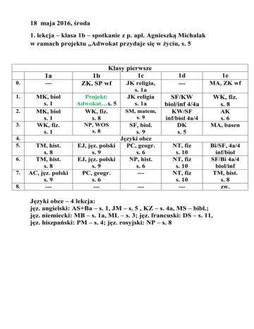 18 maja 2016, środa 1. lekcja – klasa 1b – spotkanie z p. apl. Agnieszką Michalak w ramach projektu „Adwokat przydaje się w życiu, s. 5 1a 0. 1. 2. 3. 4. 5. 6. 7. 8. --MK, biol s. 1 MK, biol s. 1 WK, fiz. s. 1 TM, hist. s. 8 TM, hist. s. 8 AC, jęz. polski s. 9 --- Klasy pierwsze 1c 1b JK religia, ZK, SP wf Projekt: Adwokat…s. 5 WK, fiz. s. 8 NP, WOS s. 8 s. 1a JK religia s. 1a SM, matem, s. 9 SF, biol. s. 9 Języki obce EJ, jęz. polski PC, geogr. s. 9 s. 6 EJ, jęz. polski NP, hist. s. 9 s. 6 PC, geogr. --s. 6 ----- 1d --- 1e MA, ZK wf SF/KW biol/inf 4/4a WK, fiz. s. 8 KW/SF inf/biol 4a/4 DK s. 5 AK s. 6 MA, basen NT, fiz s. 10 NT, fiz s. 10 NT, fiz s. 10 --- Bi/SF, 4a/4 inf/biol SF/Bi 4a/4 biol/inf TM, hist. s. 8 zw. Języki obce – 4 lekcja: jęz. angielski: AS+Ba – s. 1, JM – s. 5 , KZ – s. 4a, MS – bibl.; jęz. niemiecki: MB – s. 1a, ML – s. 3; jęz. francuski: DS – s. 11, jęz. hiszpański: PM – s. 4; jęz. rosyjski: NP – s. 8 18 maja 2016, środa Klasa 2c pod opieką p. T. Małki – do godz. 12.00 na wykładach: „Obywatel w postępowaniu karnym” na Uczelni Łazarskiego 2a 2b 1. SM, matem, s. 6 2. Warsztaty: Wiemrozumiem – wybieram, s. 2 ŁG, matem. s. 9 JP, przyr. s. 11 JP, przyr. s. 11 3. 4. 5. 6. 7. BD, biofiz. s. 10 Języki obce Klasy drugie 2c Wykłady na Uczelni Łazarskiego: „Obywatel w postępowaniu karnym” Warsztaty: Wiemrozumiem – wybieram, s. 2 2d ZK, BD, s. 10 Wf/fiz. BD/ZK, s. 10 Fiz/wf BD, s. 10 m. num ŁG, mat. s. 9 Języki obce 2e MA, SP wf MA, SP wf SM, matem s. 6 SM, matem s. 6 Języki obce Języki obce (d) Języki obce – 5., 6. lekcja: jęz. angielski: MS+ Ba – s. 1, JM+EM – s. 5, AS – bibl; jęz. niemiecki: MB – s. 1a, ML – s. 3; jęz. francuski: DS+AP – s. 11, jęz. hiszpański: PM – s. 21 Języki obce (d) – 7. lekcja: jęz. angielski: AS – s. 5, JM – s. 2, MS – 1; jęz. niemiecki: MB – s. 1a, ML – s. 3; jęz. rosyjski: NP – s. 11 jęz. francuski: DS – s. 4; jęz. hiszpański: PM – 4a ,