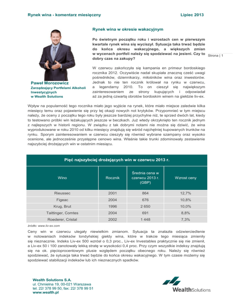 Rynek wina - komentarz miesięczny Lipiec 2013 Rynek wina w okresie wakacyjnym Po świetnym początku roku i wzrostach cen w pierwszym kwartale rynek wina się wyciszył. Sytuacja taka trwać będzie do końca okresu wakacyjnego, a większych zmian w wycenach portfeli należy się spodziewać na jesieni. Czy to Strona | 1 dobry czas na zakupy? Paweł Morozowicz Zarządzający Portfelami Alkoholi Inwestycyjnych w Wealth Solutions W czerwcu zakończyła się kampania en primeur bordoskiego rocznika 2012. Oczywiście nadal skupiała znaczną cześć uwagi pośredników, dziennikarzy, miłośników wina oraz inwestorów. Jednak to nie ten rocznik królował na rynku w czerwcu, a legendarny 2010. To on cieszył się największym zainteresowaniem ze strony kupujących i odpowiadał aż za jedną czwartą obrotów bordoskim winem na giełdzie liv-ex. Wpływ na popularność tego rocznika miało jego wyjście na rynek, które miało miejsce zaledwie kilka miesięcy temu oraz pojawienie się przy tej okazji nowych not krytyków. Przypomnieć w tym miejscu należy, że oceny z początku tego roku były jeszcze bardziej przychylne niż, te sprzed dwóch lat, kiedy to testowano próbki win leżakujących jeszcze w beczkach. Już wtedy okrzyknięto ten rocznik jednym z najlepszych w historii regionu. W związku z tak dobrymi notami nie można się dziwić, że wina wyprodukowane w roku 2010 od kilku miesięcy znajdują się wśród najchętniej kupowanych trunków na rynku. Sporym zainteresowaniem w czerwcu cieszyły się również wybrane szampany oraz wysoko ocenione, ale jednocześnie przystępne cenowo wina. Właśnie takie trunki zdominowały zestawienie najszybciej drożejących win w ostatnim miesiącu. Pięć najszybciej drożejących win w czerwcu 2013 r. Wino Rocznik Średnia cena w czerwcu 2013 r. (GBP) Wzrost ceny Rieussec 2001 864 12,7% Figeac 2004 676 10,8% Krug, Brut 1996 2 650 10,0% Taittinger, Comtes 2004 691 8,8% Roederer, Cristal 2002 1 448 7,3% źródło: www.liv-ex.com Ceny win w czerwcu ulegały niewielkim zmianom. Sytuacja ta znalazła odzwierciedlenie w notowaniach indeksów londyńskiej giełdy wina, które w trakcie tego miesiąca zmieniły się nieznacznie. Indeks Liv-ex 500 wzrósł o 0,3 proc., Liv-ex Investables praktycznie się nie zmienił, a Liv-ex 50 i 100 zanotowały lekką stratę w wysokości 0,4 proc. Przy czym wszystkie indeksy znajdują się na ok. pięcioprocentowym plusie względem początku obecnego roku. Należy się również spodziewać, że sytuacja taka trwać będzie do końca okresu wakacyjnego. W tym czasie możemy się spodziewać stabilizacji indeksów lub ich nieznacznych spadków. Wealth Solutions S.A. ul. Chmielna 19, 00-021 Warszawa tel. 22/ 378 99 50, fax: 22/ 378 99 51 www.wealth.pl Rynek wina - komentarz miesięczny Lipiec 2013 Najszybciej drożejące w I półroczu wina z rocznika 2010 (Wzrosty cen win znajdujących się w portfelach klientów Wealth Solutions) lp Wino Wzrost ceny 1 Clerc Milon 2010 33,17% 2 Pontet Canet 2010 22,11% 3 Leoville Barton 2010 20,74% 4 Armailhac 2010 19,26% 5 Forts de Latour 2010 16,67% 6 Pavillon Rouge 2010 13,79% 7 Beychevelle 2010 11,54% 8 Leoville Poyferre 2010 11,05% 9 Lynch Bages 2010 10,54% 10 Grand Puy Lacoste 2010 9,97% Strona | 2 źródło: Wealth Solutions Zmiany wartości indeksów Liv-ex w ciągu ostatniego miesiąca (stan na 30.06.2013 r.) Nazwa indeksu Zmiana miesięczna Zmiana od początku roku Liv-ex Fine Wine 50 -0,4% +5,0% Liv-ex Fine Wine 100 -0,4% +5.2% Liv-ex Bordeaux 500 0,3% +4,6% Liv-ex Fine Wine Investables -0,1% +5,0% źródło: www.liv-ex.com Pewna część Bordeaux cieszy się jednak nieprzerwanymi wzrostami cen i to mimo obecnie panującej sytuacji na rynku. Bardzo pozytywnie wyróżniają się pod tym względem wina z prawego brzegu Żyrondy. Czerwiec był już jedenastym miesiącem wzrostu notowań indeksu, który odzwierciedla ceny produkowanych tu trunków i wchodzi w skład indeksu Liv-ex 100. Zgromadzone w nim wina w ciągu ostatniego roku zyskały na wartości średnio prawie 15 proc. Wzrost wartości indeksu Liv-ex Right Bank 100 Zmiana wartości Indeks Wartość na koniec czerwca 2013 r. Miesięczna Półroczna Roczna Right Bank 100 218 1,2% 8,4% 14,8% źródło: www.liv-ex.com Warto również zauważyć, że mimo nieznacznych zmian cen na rynku dochodzi do dużej liczby transakcji. Obroty w stosunku do analogicznego okresu roku poprzedniego są wyższe o prawie 50 proc. Liczba transakcji jest cały czas bliska ok. 50 proc. liczby ofert, co jest dobrym wynikiem na rynku wina, gdzie można spotkać wiele ofert wystawionych po zawyżonych cenach. Wartość ta jest również charakterystyczna dla rynku rosnącego i jest o 20 proc. większa niż w analogicznym okresie ubiegłego roku. Warto również zauważyć, że bordoskie wina na giełdzie Liv-ex odpowiadały w czerwcu za 83 proc. obrotów pod względem wartości. Wealth Solutions S.A. ul. Chmielna 19, 00-021 Warszawa tel. 22/ 378 99 50, fax: 22/ 378 99 51 www.wealth.pl Rynek wina - komentarz miesięczny Lipiec 2013 Aktualnie nawet niewielki wzrost obrotów może przełożyć się na wzrosty cen wina. Obecna sytuacja, która potrwać powinna do września, jest w związku z tym dobrym czasem na rozbudowę portfeli. Jesień oraz okres przedświąteczny to bowiem czas wzmożonych zakupów na rynku wina. Dzięki temu w drugiej połowie roku dojść powinno do wzrostu wartości wielu bordoskich win. Przygotowanie się na ten czas, może zaowocować dobrymi wynikami portfeli. Strona | 3 Wino miesiąca Château Pichon-Longueville-Baron, AOC St Estèphe, 2eme Grand Cru Classe Historia chateau sięga końca XVII w., gdy to Jacques François de Pichon Baron Longueville (późniejszy Prezydent Parlamentu Bordeaux) otrzymał od ojca swej małżonki posiadłość obejmującą obszerne winnice. Nieruchomość ta zwana była ówcześnie L’Enclos Rauzan. Na początku to właśnie jego żona Thérèse de Reuzan miała również olbrzymi w