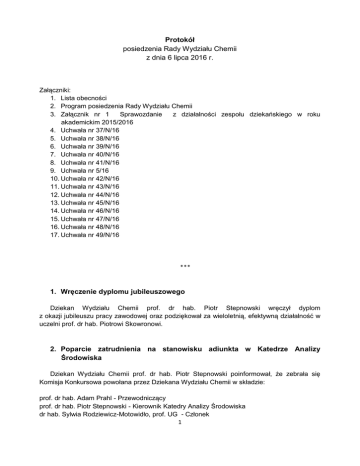 Protokół posiedzenia Rady Wydziału Chemii z dnia 6 lipca 2016 r. 1