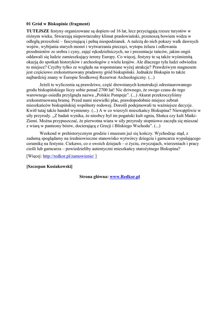 01 Gród w Biskupinie (fragment) TUTEJSZE festyny organizowane są dopiero od 16 lat, lecz przyciągają rzesze turystów w róŜnym wieku. Stwarzają niepowtarzalny klimat prasłowiański, przenoszą bowiem widza w odległą przeszłość – fascynującą i pełną niespodzianek. A naleŜą do nich pokazy walk dawnych wojów, wybijania starych monet i wytwarzania pieczęci, wytopu Ŝelaza i odlewania przedmiotów ze srebra i cyny, zajęć rękodzielniczych, no i prezentacje tańców, jakim ongiś oddawali się ludzie zamieszkujący tereny Europy. Co więcej, festyny te są takŜe wyśmienitą okazją do spotkań historyków i archeologów z wielu krajów. Ale dlaczego tylu ludzi odwiedza to miejsce? CzyŜby tylko ze względu na wspomniane wyŜej atrakcje? Prawdziwym magnesem jest częściowo zrekonstruowany pradawny gród biskupiński. JednakŜe Biskupin to takŜe najbardziej znany w Europie Środkowej Rezerwat Archeologiczny. (...) JeŜeli te wyliczenia są prawdziwe, część drewnianych konstrukcji odrestaurowanego grodu biskupińskiego liczy sobie ponad 2700 lat! Nic dziwnego, Ŝe swego czasu do tego warownego osiedla przylgnęła nazwa „Polskie Pompeje”. (...) Akurat przekroczyliśmy zrekonstruowaną bramę. Przed nami niewielki plac, prawdopodobnie miejsce zebrań mieszkańców biskupińskiej wspólnoty rodowej. Dorośli podejmowali tu waŜniejsze decyzje. Kwitł tutaj takŜe handel wymienny. (...) A w co wierzyli mieszkańcy Biskupina? Niewątpliwie w siły przyrody. „Z badań wynika, Ŝe nieobcy był im pogański kult ognia, Słońca czy kult MatkiZiemi. MoŜna przypuszczać, Ŝe pierwotna wiara w siły przyrody stopniowo zaczęła się mieszać z wiarą w panteony bóstw, docierającą z Grecji i Bliskiego Wschodu”. (...) Weekend w prehistorycznym grodzie i muzeum juŜ się kończy. Wychodząc stąd, z zadumą spoglądamy na średniowieczne stanowisko wytwórcy dziegciu i garncarza wypalającego ceramikę na festynie. Ciekawe, co o swoich dziejach – o Ŝyciu, zwyczajach, wierzeniach i pracy cieśli lub garncarza – powiedzieliby autentyczni mieszkańcy staroŜytnego Biskupina? [Więcej: http://redkor.pl/zamowienie/ ] [Szczepan Kosiakowski] Strona główna: www.Redkor.pl