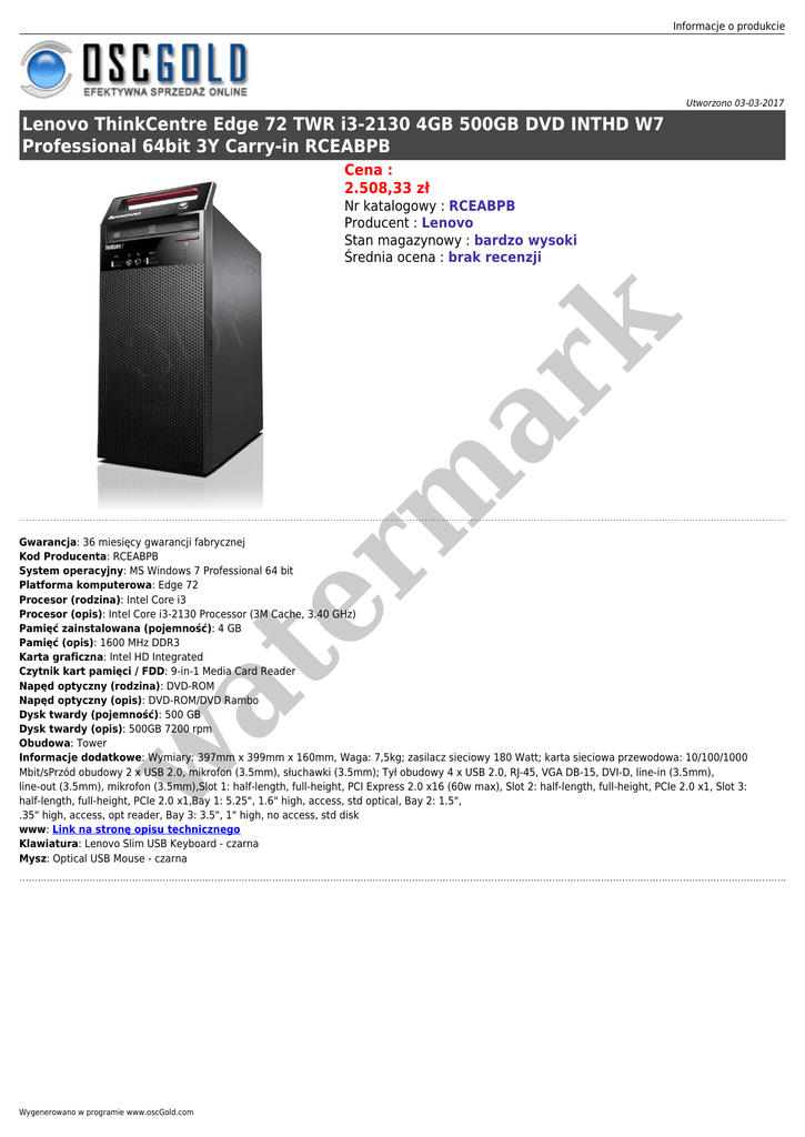 Informacje o produkcie Utworzono 03-03-2017 Lenovo ThinkCentre Edge 72 TWR i3-2130 4GB 500GB DVD INTHD W7 Professional 64bit 3Y Carry-in RCEABPB Cena : 2.508,33 zł er m ar k Nr katalogowy : RCEABPB Producent : Lenovo Stan magazynowy : bardzo wysoki Średnia ocena : brak recenzji w at Gwarancja: 36 miesięcy gwarancji fabrycznej Kod Producenta: RCEABPB System operacyjny: MS Windows 7 Professional 64 bit Platforma komputerowa: Edge 72 Procesor (rodzina): Intel Core i3 Procesor (opis): Intel Core i3-2130 Processor (3M Cache, 3.40 GHz) Pamięć zainstalowana (pojemność): 4 GB Pamięć (opis): 1600 MHz DDR3 Karta graficzna: Intel HD Integrated Czytnik kart pamięci / FDD: 9-in-1 Media Card Reader Napęd optyczny (rodzina): DVD-ROM Napęd optyczny (opis): DVD-ROM/DVD Rambo Dysk twardy (pojemność): 500 GB Dysk twardy (opis): 500GB 7200 rpm Obudowa: Tower Informacje dodatkowe: Wymiary: 397mm x 399mm x 160mm, Waga: 7,5kg; zasilacz sieciowy 180 Watt; karta sieciowa przewodowa: 10/100/1000 Mbit/sPrzód obudowy 2 x USB 2.0, mikrofon (3.5mm), słuchawki (3.5mm); Tył obudowy 4 x USB 2.0, RJ-45, VGA DB-15, DVI-D, line-in (3.5mm), line-out (3.5mm), mikrofon (3.5mm),Slot 1: half-length, full-height, PCI Express 2.0 x16 (60w max), Slot 2: half-length, full-height, PCIe 2.0 x1, Slot 3: half-length, full-height, PCIe 2.0 x1,Bay 1: 5.25", 1.6" high, access, std optical, Bay 2: 1.5", .35" high, access, opt reader, Bay 3: 3.5", 1" high, no access, std disk www: Link na stronę opisu technicznego Klawiatura: Lenovo Slim USB Keyboard - czarna Mysz: Optical USB Mouse - czarna Wygenerowano w programie www.oscGold.com