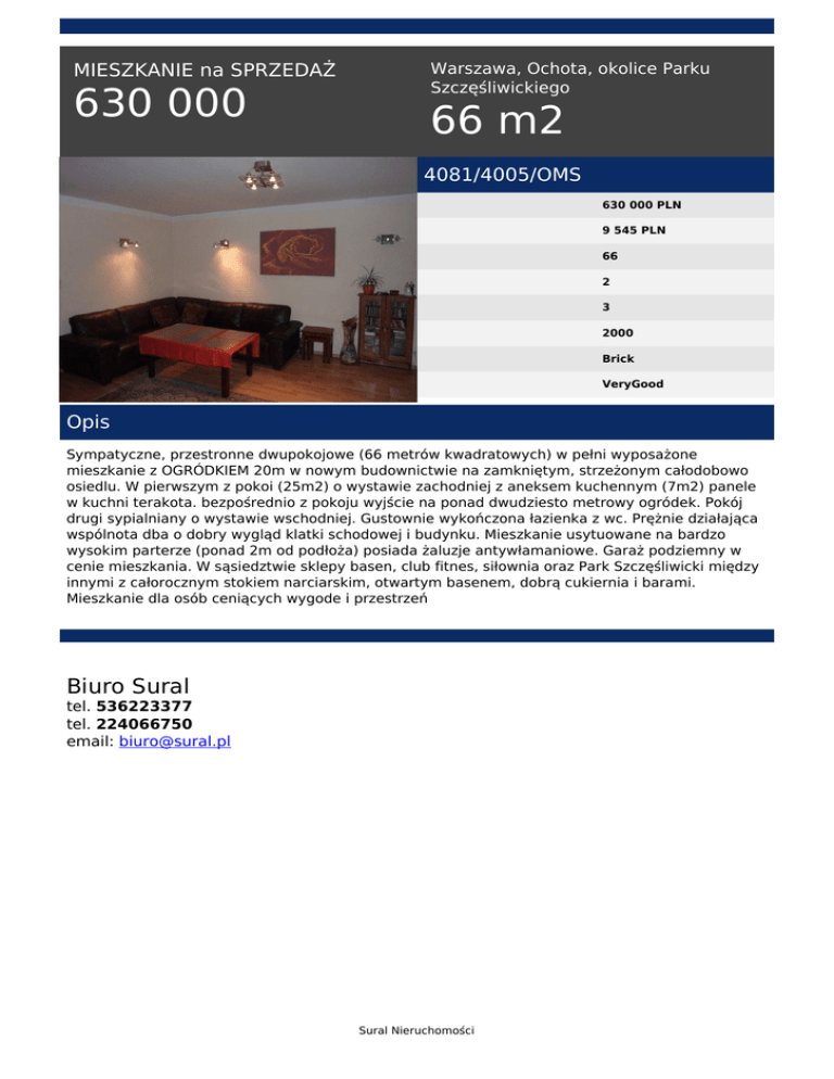MIESZKANIE na SPRZEDAŻ 630 000 Warszawa, Ochota, okolice Parku Szczęśliwickiego 66 m2 4081/4005/OMS 630 000 PLN 9 545 PLN 66 2 3 2000 Brick VeryGood Opis Sympatyczne, przestronne dwupokojowe (66 metrów kwadratowych) w pełni wyposażone mieszkanie z OGRÓDKIEM 20m w nowym budownictwie na zamkniętym, strzeżonym całodobowo osiedlu. W pierwszym z pokoi (25m2) o wystawie zachodniej z aneksem kuchennym (7m2) panele w kuchni terakota. bezpośrednio z pokoju wyjście na ponad dwudziesto metrowy ogródek. Pokój drugi sypialniany o wystawie wschodniej. Gustownie wykończona łazienka z wc. Prężnie działająca wspólnota dba o dobry wygląd klatki schodowej i budynku. Mieszkanie usytuowane na bardzo wysokim parterze (ponad 2m od podłoża) posiada żaluzje antywłamaniowe. Garaż podziemny w cenie mieszkania. W sąsiedztwie sklepy basen, club fitnes, siłownia oraz Park Szczęśliwicki między innymi z całorocznym stokiem narciarskim, otwartym basenem, dobrą cukiernia i barami. Mieszkanie dla osób ceniących wygode i przestrzeń Biuro Sural tel. 536223377 tel. 224066750 email: [email protected] Sural Nieruchomości Powered by TCPDF (www.tcpdf.org)