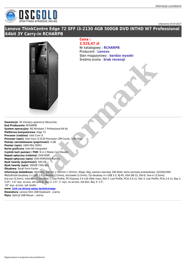Informacje o produkcie Utworzono 03-03-2017 Lenovo ThinkCentre Edge 72 SFF i3-2130 4GB 500GB DVD INTHD W7 Professional 64bit 3Y Carry-in RCHARPB Cena : 2.525,47 zł er m ar k Nr katalogowy : RCHARPB Producent : Lenovo Stan magazynowy : bardzo wysoki Średnia ocena : brak recenzji w at Gwarancja: 36 miesięcy gwarancji fabrycznej Kod Producenta: RCHARPB System operacyjny: MS Windows 7 Professional 64 bit Platforma komputerowa: Edge 72 Procesor (rodzina): Intel Core i3 Procesor (opis): Intel Core i3-2130 Processor (3M Cache, 3.40 GHz) Pamięć zainstalowana (pojemność): 4 GB Pamięć (opis): 1600 MHz DDR3 Karta graficzna: Intel HD Integrated Czytnik kart pamięci / FDD: 9-in-1 Media Card Reader Napęd optyczny (rodzina): DVD-ROM Napęd optyczny (opis): DVD-ROM/DVD Rambo Dysk twardy (pojemność): 500 GB Dysk twardy (opis): 500GB 7200 rpm Obudowa: Small Form Factor Informacje dodatkowe: Wymiary: 336mm x 382mm x 101mm, Waga: 6kg; zasilacz sieciowy 180 Watt; karta sieciowa przewodowa: 10/100/1000 Mbit/sPrzód obudowy 2 x USB 2.0, mikrofon (3.5mm), słuchawki (3.5mm); Tył obudowy 4 x USB 2.0, RJ-45, VGA DB-15, DVI-D, line-in (3.5mm), line-out (3.5mm), mikrofon (3.5mmSlot 1: Low Profile, PCI Express 2.0 x16 (40w max); Slot 2: Low Profile, PCIe 2.0 x1; Slot 3: Low Profile, PCIe 2.0 x1; Bay 1: 5.25", 1.6" wys, access, std optical, Bay 2: 3.5", 1" wys, no access, std disk, Bay 3: 1.5", .35" wys, access, opt reader www: Link na stronę opisu technicznego Klawiatura: Lenovo Slim USB Keyboard - czarna Mysz: Optical USB Mouse - czarna Wygenerowano w programie www.oscGold.com