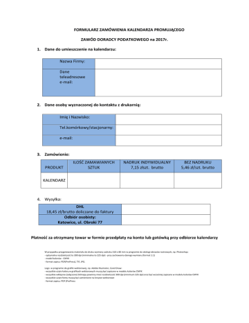 FORMULARZ ZAMÓWIENIA KALENDARZA PROMUJĄCEGO ZAWÓD DORADCY PODATKOWEGO na 2017r. 1. Dane do umieszczenie na kalendarzu: Nazwa Firmy: Dane teleadresowe e-mail: 2. Dane osoby wyznaczonej do kontaktu z drukarnią: Imię i Nazwisko: Tel.komórkowy/stacjonarny: e-mail: 3. Zamówienie: PRODUKT ILOŚĆ ZAMAWIANYCH SZTUK NADRUK INDYWIDUALNY 7,15 złszt. brutto BEZ NADRUKU 5,46 zł/szt. brutto KALENDARZ 4. Wysyłka: DHL 18,45 zł/brutto doliczane do faktury Odbiór osobisty: Katowice, ul. Obroki 77 Płatność za otrzymany towar w formie przedpłaty na konto lub gotówką przy odbiorze kalendarzy W przypadku przygotowania materiału do druku wymiary zadruku 310 x 80 mm w programie do obsługi obrazów rastrowych, np. Photoshop: - optymalna rozdzielczość to 300 dpi (minimalna to 225 dpi) - przy zachowaniu danego wymiaru (format 1:1) - model kolorów - CMYK - format zapisu: PDF(PrePress), TIF, JPG. Logo w programie do grafiki wektorowej, np. Adobe Illustrator, Corel Draw: - wszystkie użyte kolory w grafikach wektorowych muszą być zapisane w modelu kolorów CMYK - wszystkie wklejone (załączone) bitmapy powinny mieć rozdzielczość 300 dpi (minimum 225 dpi) oraz być wcześniej zapisane w modelu kolorów CMYK - wszystkie użyte fonty muszą być zamienione na krzywe wektorowe - format zapisu: PDF (PrePress