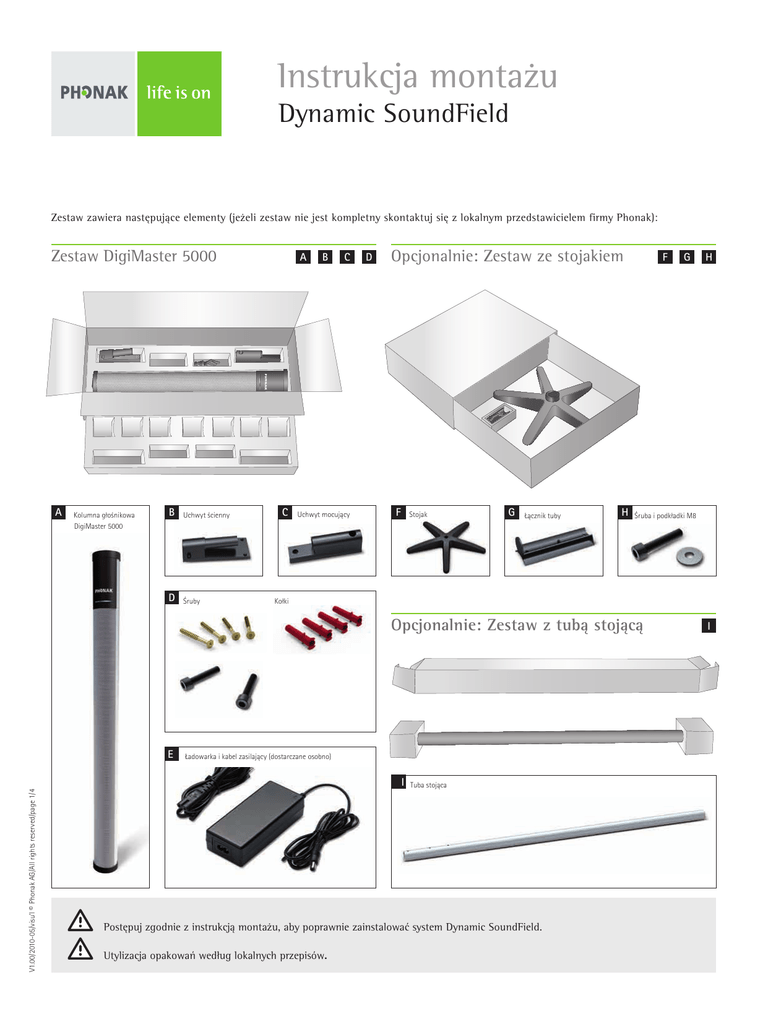Instrukcja montażu Dynamic SoundField Zestaw zawiera następujące elementy (jeżeli zestaw nie jest kompletny skontaktuj się z lokalnym przedstawicielem firmy Phonak): Zestaw DigiMaster 5000 A Kolumna głośnikowa DigiMaster 5000 B Uchwyt ścienny D Śruby A C B C Uchwyt mocujący D Opcjonalnie: Zestaw ze stojakiem F Stojak G Łącznik tuby H F Kołki Ładowarka i kabel zasilający (dostarczane osobno) V1.00/2010-05/visu’l © Phonak AG/All rights reserved/page 1/4 I Tuba stojąca Postępuj zgodnie z instrukcją montażu, aby poprawnie zainstalować system Dynamic SoundField. Utylizacja opakowań według lokalnych przepisów. 1 H Śruba i podkładki M8 Opcjonalnie: Zestaw z tubą stojącą E G I Instrukcja montażu Dynamic SoundField Do montażu wymagane są następujące narzędzia: Aby zamontować głośniki na ścianie: Wiertarka z wiertłem 5mm Poziomica Ołówek Śrubokręt Torx T20* Klucz imbusowy 5* Aby zamontować głośniki na stojaku: Klucz imbusowy 5* Klucz imbusowy 6* 2. Montaż Jeśli planujesz zamontować DigiMaster 5000 na stojaku przejdź do do rozdziału 2.2: Montowanie DigiMaster 5000 na stojaku. 2.1 Montowanie DigiMaster 5000 na ścianie 1) Odmierz 1.40 metra od podłogi i oznacz wysokość ołówkiem na ścianie. Trzymaj uchwyt ścienny, tak by jego dolna część znajdowała się przy znaku zrobionym ołówkiem na ścianie. Przy pomocy poziomicy wyreguluj odpowiednio ułożenie uchwytu. Ołówkiem zaznacz miejsca, w których znajdują się 4 otwory w uchwycie ściennym. *Dostarczone przez firmę Phonak 1. Wybór odpowiedniego miejsca Uchwyt ścienny [B] 1) Znajdź wolne, bezpieczne miejsce, najlepiej z przodu po prawej lub lewej stronie tablicy Smartboard bądź tablicy tradycyjnej. Poziomica Znak zrobiony ołówkiem (1.40m nad podłogą) V1.00/2010-05/visu’l © Phonak AG/All rights reserved/page 2/4 2) Usuń uchwyt ścienny i za pomocą wiertła 5mm wywierć 4 otwory. Głębokość tych otworów powinna wynosić co najmniej 30mm. 2) Upewnij się, że w pobliżu znajduje się źródło prądu. 30 mm 3) Do otworów włóż kołki [D]. Zamocuj uchwyt ścienny używając 4 śrub typu torx [D] i śrubokręta T20 torx. 2 Instrukcja montażu Dynamic SoundField 4) Przyczep uchwyt mocujący [C] do DigiMaster 5000 używając dwóch czarnych śrub [D] i klucza imbusowego 5. 2.2 Montowanie DigiMaster 5000 na stojaku 1) Przygotuj stojak [F], tubę stojącą [I], czarne śruby i podkładki M8 [H]. 2) Del i katnie umieść koniec tuby w stojaku (zobacz poniższy rysunek). Trzy otwory powinny znadjować się w górnej części tuby. Używając śrubek i podkładek M8 kluczem francuskim przykręć od dołu tubę do stojaka. Postaw stojak na podzłodze. 5) Ostrożnie zamocuj kolumnę DigiMaster 5000 [A] do uchwytu ściennego i skieruj w stronę klasy. 3) Umieść łacznik tuby za kolumną DigiMaster w miejscu gdzie znajdują się 4 otwory. Dwie wypustki znajdujące się w łączniku należy dopasować do otworów wewnętrznych. 6) Kabel zasilający podłącz do ładowarki [E]. Podłącz kabel do gniazda a wtyczkę jack 19Volt do gniazdka znajdującego się na spodzie DigiMaster 5000. Możesz teraz sparować DigiMaster 5000 z inspiro. 19V 3.2A AUDIO V1.00/2010-05/visu’l © Phonak AG/All rights reserved/page 3/4 3.2A Upewnij się, że kabel zasilający jest bezpiecznie podłączony! Przejdź do rozdziału 3: Parowanie DigiMaster 5000 z inspiro. 3 AUDIO 4) Wykorzystaj dwie czarne śruby [D] z zestawu do montażu na ścianie i włóż je w otwory znajdujące się w górnej części tuby stojącej. Obróć DigiMaster 5000 tak, aby dopasować łącznik tuby do tuby stojącej i dokręć je kluczem imbusowym 5. Instrukcja montażu Dynamic SoundField 5) Kabel zasilający podłącz do ładowarki [E]. Podłącz kabel do gniazda a wtyczkę jack 19Volt do gniazdka znajdującego się na spodzie DigiMaster 5000. Możesz teraz sparować DigiMaster 5000 z inspiro. 19V 3.2A 3) Pojawi się wówczas menu instalacji inspiro. Wybierz “Parowanie”. inspiro poprowadzi Cię przez proces parowania. Postępuj według poniższej instrukcji: a) Kiedy zobaczysz trzy kropki na wyświetlaczu inspiro, zbliż urządzenie do głośnika (mniej niż1 metr) i włącz DigiMaster 5000. AUDIO 19V 3.2A AUDIO 19V 3.2A 19V 3.2A Upewnij się, że kabel zasilający jest bezpiecznie podłączony! AUDIO AUDIO b) Po chwili, inspiro poinformuje Cię o sparowaniu z głośnikiem Od tego momentu dioda na kolumnie DigiMaster 5000 świeci na niebiesko. To niebieskie światło wskazuje, że system Dynamic SoundField jest gotowy do użycia. 4) Następnie wyłącz inspiro oraz kolumnę DigiMaster 5000. Instalacja Dynamic SoundField’s jest zakończona. 3. Parowanie DigiMaster 5000 z inspiro V1.00/2010-05/visu’l © Phonak AG/All rights reserved/page 4/4 1) Upewnij się, że inspiro jest w pełni naładowany (sprawdź instrukcję użytkowania Dynamic SoundField). Włącz inspiro. Kiedy pojawi się symbol baterii wciśnij dwa pokazane niżej przyciski jednocześnie. 2) Puść przyciski i wybierz ok. 4 Aby dowiedzieć się więcej na temat standardowego działania Dynamic SoundField proszę sprawdzić instrukcję użytkowania.