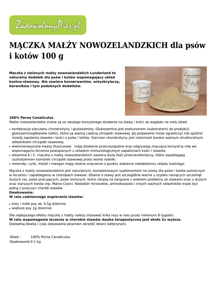 MĄCZKA MAŁŻY NOWOZELANDZKICH dla psów i kotów 100 g Mączka z zielonych małży nowozelandzkich Lunderland to naturalny dodatek dla psów i kotów wspomagający układ kostno-stawowy. Nie zawiera konserwantów, antyzbrylaczy, barwników i tym podobnych dodatków. 100% Perna Canaliculus Małże nowozelandzkie znane są ze swojego korzystnego działania na stawy i kości ze względu na swój skład: ● ● ● ● kombinacja siarczanu chondroityny i glukozaminy: Glukozamina jest prekursorem (substratem) do produkcji glukozaminoglikanów (GAG), które są ważną częścią chrząstki stawowej. Jej podawanie może ograniczyć lub opóźnić rozwój zapalenia stawów i kości u psów i kotów. Siarczan chondroityny jest natomiast bardzo ważnym strukturalnym składnikiem chrząstki stawowej. wielonienasycone kwasy tłuszczowe: mają działanie przeciwzapalne oraz odgrywają znaczącą korzystną rolę we wspomaganiu leczenia powiązanych z układem immunologicznym zapaleniach kości i stawów. witamina E i C: mączka z małży nowozelandzkich zawiera dużą ilość przeciwutleniaczy, które zapobiegają uszkodzeniom komórek chrząstki stawowej przez wolne rodniki. minerały: cynk, miedź i mangan mają istotne znaczenie z punktu widzenia metabolizmu układu kostnego. Mączka z małży nowozelandzkich jest naturalnym, kompleksowym suplementem na stawy dla psów i kotów pomocnym w leczeniu i zapobieganiu w chorobach stawów. Dbanie o stawy jest szczególnie ważne u szybko rosnących szczeniąt dużych ras, psów pracujących, psów starszych, które cierpią na związane z wiekiem problemy ze stawami oraz u dużych oraz starszych kotów (np. Maine Coon). Niedobór minerałów, aminokwasów i innych ważnych składników może być jedną z przyczyn chorób stawów. Dawkowanie: W celu codziennego wspierania stawów: ● ● koty i małe psy ok. 0,5g dziennie większe psy 1g dziennie. Dla najlepszego efektu mączkę z małży należy stosować kilka razy w roku przez minimum 8 tygodni. W celu wspomagania leczenia w chorobie stawów dawka terapeutyczna jest około 2x wyższa. Dokładną dawkę i czas stosowania powinien określić lekarz weterynarii. Skład : 100% Perna Canaliculus Opakowanie 0.1 kg