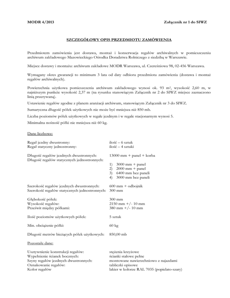 MODR 4/2013 Załącznik nr 1 do SIWZ SZCZEGÓŁOWY OPIS PRZEDMIOTU ZAMÓWIENIA Przedmiotem zamówienia jest dostawa, montaż i konserwacja regałów archiwalnych w pomieszczeniu archiwum zakładowego Mazowieckiego Ośrodka Doradztwa Rolniczego z siedzibą w Warszawie. Miejsce dostawy i montażu: archiwum zakładowe MODR Warszawa, ul. Czereśniowa 98, 02-456 Warszawa. Wymagany okres gwarancji to minimum 3 lata od daty odbioru przedmiotu zamówienia (dostawa i montaż regałów archiwalnych). Powierzchnia użytkowa pomieszczenia archiwum zakładowego wynosi ok. 93 m2, wysokość 2,60 m, w najniższym punkcie wysokość 2,37 m (na rysunku stanowiącym Załącznik nr 2 do SIWZ miejsce zaznaczono linią przerywaną). Ustawienie regałów zgodne z planem aranżacji archiwum, stanowiącym Załącznik nr 3 do SIWZ. Sumaryczna długość półek użytkowych nie może być mniejsza niż 850 mb. Liczba poziomów półek użytkowych w regale jezdnym i w regale stacjonarnym wynosi 5. Minimalna nośność półki nie mniejsza niż 60 kg. Dane liczbowe: Regał jezdny dwustronny: Regał statyczny jednostronny: ilość – 6 sztuk ilość – 4 sztuki Długość regałów jezdnych dwustronnych: Długość regałów statycznych jednostronnych: 13000 mm + panel + korba 1) 2) 3) 4) 3000 mm + panel 2000 mm + panel 6400 mm bez paneli 3000 mm bez paneli Szerokość regałów jezdnych dwustronnych: 600 mm + odbojnik Szerokość regałów statycznych jednostronnych: 300 mm Głębokość półek: Wysokość regałów: Prześwit między półkami: 300 mm 2150 mm +/- 10 mm 380 mm +/- 10 mm Ilość poziomów użytkowych półek: 5 sztuk Min. obciążenie półki: 60 kg Długość metrów bieżących półek użytkowych: 850,00 mb Pozostałe dane: Usztywnienie konstrukcji regałów: Wypełnienie ścianek bocznych: Szyny regałów jezdnych dwustronnych: Oznakowanie regałów: Kolor regałów stężenia krzyżowe ścianki stalowe pełne montowane nawierzchniowo z najazdami tabliczki opisowe lakier w kolorze RAL 7035 (popielato-szary) Opis wykonania regałów: Konstrukcja torów jezdnych. Tory jezdne wykonane z kształtownika profilowanego z blachy o grubości 1,5 mm i ciągnionego pręta kwadratowego o przekroju 16 mm x 16 mm. Tory jezdne mają być zabezpieczone przed korozją przez cynkowanie. Konstrukcja podwozia regałów. Wykonane z profili o grubości co najmniej 2 mm zapewniających odpowiednią sztywność i trwałość. Do konstrukcji podwozia zamocowane maja być żeliwne koła jezdne, odpowiednio ułożyskowane na łożyskach kulkowych, krytych. Podwozie wyposażone zostanie w gumowe odbojniki. Konstrukcja korpusu regału. Wykonany ze ścian bocznych pełnych, wyposażonych w otwory do bezśrubowego mocowania półek na specjalnych zaczepach, stężeń krzyżowych usztywniających poszczególne segmenty i półek daszących. Całość zabezpieczona zostanie antykorozyjnie przez malowanie proszkowe na odpowiednio przygotowanej powierzchni. Konstrukcja półek. Półki wykonane z odpowiednio profilowanej blachy (trzy gięcia na długość i dwa gięcia na szerokość półki). Całość zabezpieczona zostanie antykorozyjnie przez malowanie proszkowe na odpowiednio przygotowanej powierzchni. Malowanie będzie się odbywać po wykonaniu wszelkich otworów. Konstrukcja mechanizmu napędowego. Napęd regału odbywa się za pomocą trójramiennego pokrętła, przekładni łańcuchowej zębatej i wałków napędowych zakończonych sprzęgłami. Trójramienne pokrętło wykonane z metalu, w całości oblane tworzywem. Pokrętła będą zakończone ruchomymi gałkami. W korpus pokrętła wbudowana zostanie blokada umożliwiająca w kompletny sposób blokowanie regału w każdym miejscu trasy jego przejazdu. Konstrukcja osłony strony czołowej regału. Osłona czołowa wykonana z odpowiednio profilowanej blachy wyposażonej w tabliczkę z pleksi umożliwiającą na umieszczenie opisu zawartości regału. Panel czołowy musi być wykonany w kolorze całego regału. Regały muszą posiadać elementy zabezpieczające przed przechyłem lub wywróceniem. Żaden z elementów regału nie może posiadać ostrych krawędzi. Regały posiadają następujące atesty i certyfikaty: 1. certyfikat zgodności z polskimi normami, 2. atest higieniczny na regały, 3. klasyfikacja ogniowa w zakresie niepalności.