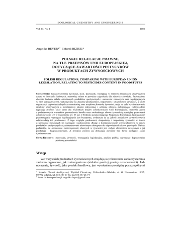 E C O LO GIC AL C H E M IS T R Y AN D E N GIN E E R IN G S Vol. 15, No. 1 2008 Angelika BEYER*1∗i Marek BIZIUK* POLSKIE REGULACJE PRAWNE, NA TLE PRZEPISÓW UNII EUROPEJSKIEJ, DOTYCZĄCE ZAWARTOŚCI PESTYCYDÓW W PRODUKTACH śYWNOŚCIOWYCH POLISH REGULATIONS, COMPARING WITH EUROPEAN UNION LEGISLATION, RELATING TO PESTICIDES CONTENT IN FOODSTUFFS Streszczenie: Zanieczyszczenia Ŝywności, m.in. pestycydy, występują w róŜnych produktach spoŜywczych często w ilościach śladowych, stanowiąc mimo to powaŜne zagroŜenie dla zdrowia człowieka. Prowadzone obecnie badania składu określonych produktów spoŜywczych i surowców rolniczych oraz występujących w nich zanieczyszczeń, wykonywane na zlecenie producentów, importerów i eksporterów Ŝywności, a takŜe organizacji odpowiedzialnych za monitoring oraz urzędową kontrolę Ŝywności, mają na celu wyeliminowanie środków spoŜywczych o niewłaściwej jakości zdrowotnej i ochronę zdrowia publicznego. Odpowiednie regulacje prawne, takie same dla wszystkich krajów członkowskich Unii Europejskiej, stanowią jeden z podstawowych warunków prowadzenia handlu oraz swobodnego obrotu Ŝywnością pomiędzy państwami członkowskimi UE w rozumieniu art. 23 ust. 2 Traktatu ustanawiającego Wspólnotę Europejska. Konieczność przestrzegania wymagań legislacyjnych jest bezsporna, zwłaszcza Ŝe za jakość produktów Ŝywnościowych odpowiadają ich producenci. Z tego względu producenci, eksporterzy i importerzy Ŝywności w trosce o spełnienie stawianych im wymagań i jednocześnie dbając o konkurencyjność wprowadzanych na rynek produktów spoŜywczych są zainteresowani ułatwionym dostępem do odpowiednich aktów prawnych. NaleŜy podkreślić, Ŝe oznaczanie zanieczyszczeń obecnych w Ŝywności jest stałym elementem związanym z jej produkcją i bezpieczeństwem. A przepisy prawne jej dotyczące powinny być łatwo dostępne, jasne i jednoznaczne. Słowa kluczowe: pestycydy, Ŝywność, wymagania legislacyjne, analiza próbki, najwyŜsze dopuszczalne poziomy pozostałości Wstęp We wszystkich produktach Ŝywnościowych znajdują się róŜnorodne zanieczyszczenia zarówno organiczne, jak i nieorganiczne (niektóre poniŜej granicy oznaczalności). Jednocześnie, Ŝywność, jako produkt handlowy, jest wymieniana pomiędzy poszczególnymi * Katedra Chemii Analitycznej, Wydział Chemiczny, Politechnika Gdańska, ul. G. Narutowicza 11/12, 80-952 Gdańsk, tel. 058 347 17 83, fax 058 347 26 94 1 Autor do korespondencji: [email protected] 30 Angelika Beyer i Marek Biziuk krajami. Dlatego teŜ naturalna wydaje się konieczność istnienia międzynarodowych regulacji prawnych dotyczących m.in. dopuszczalnego poziomu zanieczyszczenia Ŝywności. Rolę taką w najszerszym stopniu spełnia Kodeks śywnościowy, czyli Codex Alimentarius. Jednocześnie, regionalnie istnieją Ŝywnościowe regulacje prawne, np. w ramach Unii Europejskiej [1]. Zagadnienie bezpieczeństwa Ŝywności jest bardzo waŜnym obszarem zainteresowania zarówno władz Unii Europejskiej, jak i krajowych, przede wszystkim ze względu na znaczenie dla stanu zdrowia publicznego ogółu ludności. W celu sprostania ciągle rosnącym wymaganiom związanym z zapewnieniem właściwej jakości Ŝywności Polska, jako członek Unii Europejskiej, musi dostosowywać swoje prawodawstwo do odpowiednich międzynarodowych aktów prawnych. Szczególną grupę zanieczyszczeń Ŝywności, tworzonych i uwalnianych do środowiska przez człowieka, stanowią pestycydy. Oprócz celowego oddziaływania, m.in. w zakresie ochrony zbiorów przed szkodnikami, mogą mieć negatywny wpływ na zdrowie ludzkie poprzez zanieczyszczenie gleb, wód gruntowych, a takŜe powietrza czy Ŝywności; jak równieŜ mogą wpływać na środowisko i róŜnorodność biologiczną. Dlatego wiedza o dopuszczalnym poziomie stęŜeń tych ksenobiotyków zarówno w próbkach środowiskowych, jak i biologicznych jest niezbędnym warunkiem wiarygodnego oszacowania ryzyka zdrowotnego, wynikającego z wszechobecności pestycydów. Szczególnie waŜny wydaje się problem zanieczyszczenia Ŝywności oraz kumulacji tych groźnych substancji w organizmach Ŝywych. Odpowiednia ochrona zdrowia ludzkiego i właściwe funkcjonowanie międzynarodowego obrotu Ŝywnością wymagają wprowadzenia, w miarę moŜliwości, jednolitych przepisów obowiązujących wszystkie kraje prowadzące ze sobą wymianę towarową. Najpowszechniej przyjętą metodą ochrony zdrowia konsumentów przed szkodliwym wpływem i nadmiernym pobraniem do organizmu pozostałości związków szkodliwych z Ŝywnością jest ustalenie obowiązujących najwyŜszych dopuszczalnych poziomów ich pozostałości „w” lub „na” powierzchni produktów spoŜywczych [3]. Regulacje dotyczące chemicznych zanieczyszczeń Ŝywności w Unii Europejskiej Unia Europejska wywarła znaczny wpływ na stan europejskich regulacji dotyczących chemicznych zanieczyszczeń Ŝywności. Za przygotowanie, opracowanie i dostosowanie procedur dotyczących prawodawstwa z zakresu chemicznych zanieczyszczeń Ŝywności odpowiadają w ramach UE, m.in., Komisja Europejska, Rada Unii Europejskiej oraz Parlament Europejski. Najczęściej Komisja przygotowuje propozycje nowych regulacji prawnych, natomiast Rada podejmuje decyzje dotyczące prawodawstwa dotyczącego zanieczyszczeń w Ŝywności. Niemniej jednak obowiązują róŜne procedury dla róŜnych klas zanieczyszczeń, co więcej procedury te zmieniały się w ciągu ostatnich lat i nadal ulegają zmianom [3]. Wszystkie akty prawne Wspólnoty i propozycje prawa są publikowane w Official Journal of the European Union (do 1 lutego 2003 roku Official Journal of the European Communities). Od 1 maja 2004 roku Official Journal of the European Union ukazuje się równieŜ w języku polskim jako Dziennik Urzędowy Unii Europejskiej. W ramach Polskie regulacje prawne, na tle przepisów Unii Europejskiej, dotyczące zawartości pest