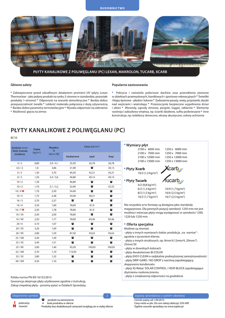 B U D OW NI C T WO PŁYTY KANALIKOWE ZZPOLIWĘGLANU (PC) (PC) LExAN, MAKrOLON, TUCArb, xCArb PŁYTY KANALIKOWE POLIWĘGLANU Lexan, Makrolon Główne zalety Popularne zastosowania ■ ■ Pokrycia i naświetla połaciowe dachów oraz przeszklenia pionowe w obiektach przemysłowych, handlowych i sportowo-rekreacyjnych ■ Świetliki i klapy dymowe - płaskie i łukowe ■ Zadaszenia pasaży, wiaty, przystanki, daszki nad wejściami i wiatrołapy ■ Przezroczyste bezpieczne wypełnienia drzwi i okien ■ Werandy, ogrody zimowe, pergole, loggie, szklarnie ■ Elementy wystroju i zabudowy wnętrza, np. ścianki działowe, sufity podwieszane ■ Inne konstrukcje, np. kolektory słoneczne, ekrany akustyczne, osłony ochronne Zabezpieczone przed szkodliwym działaniem promieni UV (płyty Lexan Thermoclear - jako jedyny produkt na rynku 2-stronne w standardzie, pozostałe produkty 1-stronne) ■ Odporność na warunki atmosferyczne ■ Bardzo dobra przepuszczalność światła ■ Lekkość materiału połączona z dużą sztywnością ■ Bardzo dobre parametry termoizolacyjne ■ Wysoka odporność na uderzenia ■ Możliwość gięcia na zimno PŁYTY KANALIKOWE Z POLIWĘGLANU (PC) BC10 Grubość (mm) / ilość ścianek, struktura Ciężar (kg/m2) Współcz. U (W/m2/K) ■ Cena (pln/m2) bezbarwne opal brąz 4/2 0,80 3,9 / 4,1 25,50 26,78 26,78 4,5 / 2 1,0 3,86 31,90 34,13 6/2 1,30 3,70 40,20 42,21 42,21 8/2 1,50 3,4 / 3,6 46,80 49,14 49,14 10 / 2 1,30 - 46,80 10 / 2 1,70 3,1 / 3,2 52,90 55,55 10 / 4 N 1,70 2,50 54,40 10 / 5 1,75 2,48 54,40 58,21 16 / 3 2,70 2,27 16 / 6 2,50 1,80 78,00 81,9 16 / 7 N 2,50 1,78 78,00 81,9 16 / 5X 2,40 2,00 78,00 16 / 9X 2,50 1,77 78,00 83,46 83,46 Wymiary płyt 2100 x 6000 mm 2100 x 7000 mm 2100 x 12000 mm 2100 x 13000 mm ■ 1250 x 6000 mm 1250 x 7000 mm 1250 x 12000 mm 1250 x 13000 mm Płyty Xcarb 10/2 (1,3 kg/m2) ■ Płyty Tucarb 4/2 (0,8 kg/m2) 6/2 (1,3 kg/m2) 8/2 (1,5 kg/m2) 10/2 (1,7 kg/m2) 10/4 (1,7 kg/m2) 16/6 (2,5 kg/m2) 16/7 (2,5 kg/m2) Nie wszystkie w/w formaty są dostępne jako standardy magazynowe. Dla pewnych pozycji szerokość 1250 mm nie jest „na wymiar”, możliwa i wówczas płyty mogą występować w szerokości 1200, z 1220 lub 1230 mm. 20 / 6 3,10 1,67 ■ 20 / 5X 3,20 1,69 20 / 9X 2,80 1,59 87,50 93,63 93,63 25 / 5M 3,40 1,40 25 / 5X 3,40 1,51 25 / 9X 3,00 1,40 93,50 100,05 100,05 32 / 5M 3,70 1,10 114,95 32 / 5X 3,80 1,32 40 / 5M 4,20 1,10 Możliwe są również: - płyty o innych wymiarach (także: produkcja „na wymiar” zgodnie z życzeniem klienta - płyty o innych strukturach, np. 8mm/4,12mm/4, 20mm/7, 25mm/3X - płyty w dowolnych kolorach - płyty dwukolorowe BI-COLOR - płyty EASY-CLEAN o radykalnie podwyższonej samozmywalności - płyty DRIP-GARD / NO DROP z warstwą zapobiegającą skapywaniu kondensatu - płyty IQ-Relax/ SOLAR CONTROL / HEAT-BLOCK zapobiegające zbytniemu nasłonecznieniu - płyty o zwiększonej odporności na gradobicie Polska norma PN-EN 16153:2013 Gwarancja obejmuje płyty użytkowane zgodnie z instrukcją. Zakup niepełnej płyty - prosimy pytać w Działach Sprzedaży. 2 Objaśnienie symboli ! N produkt na zamówienie polecamy nowość - brak produktu w ofercie Produkty bez dodatkowych oznaczeń znajdują sie w stałej ofercie Oferta specjalna Zapytaj sprzedawcę o system rabatowy Cennik ważny od 1.09.2015. Ceny netto w pln. Do cen należy doliczyć 23% VAT. Ogólne warunki sprzedaży na www.tuplex.pl B U D OW NI C T WO PrOfILE ALUMINIOWE sPECjALNE dO MONTAżU POLIWĘGLANU ■ ■ Nazwa Index Oznaczenie Wymiary A x B x C (mm) długości magazynowe (m) Cena (zł/mb) Profil AL górny 1003980 1003981 A-01 60 x 9 6,0 7,0 6,40 Profil AL dolny 1003983 1003984 D-01 60 x 12 6,0 7,0 11,06 Profil AL dolny konstrukcyjny wys. 30 mm 1003985 1003986 D-02 60 x 30 6,0 7,0 20,13 Profil AL dolny konstrukcyjny wys. 60 mm 1013808 1013809 D-03 60 x 60 6,0 7,0 23,41 Profil AL. zamyk. do płyt o gr. 6 mm 1003993 AL-F06 20,4 x 21,4 x 6,2 6,0 3,94 Profil AL. zamyk. do płyt o gr. 8 mm 1003994 AL-F08 22,4 x 21,4 x 8,2 6,0 4,13 Profil AL. zamyk. do płyt o gr. 10 mm 1003996 AL-F10 24,4 x 21,4 x10,2 6,0 4,46 Profil AL. zamyk. do płyt o gr. 16 mm 1003997 AL-F16 30,4 x 21,4 x 16,2 6,0 4,79 Profil AL. zamyk. do płyt o gr. 20 mm 1003998 AL-F20 34,4 x 21,4 x 20,2 6,0 4,88 Profil AL. zamyk. do płyt o gr. 25 mm 1003999 AL-F25 39,4 x 21,4 x 25,2 6,0 4,95 rura pr. 60x30x2 1003987 60 x 30 x 2 7,0 15,35 rura pr. 60x40x2 1003988 60 x 40 x 2 7,0 17,16 Prof. AL przegub. do płyt 10mm 1017897 66,8 x 29,6 x 12 6,0 11,81 Prof. AL przegub. do płyt 16mm 1017896 66,8 x 35,6 x 18 6,0 12,31 Prof. AL przegub. do płyt 20mm 1017885 66,8 x 39,6 x 22 6,0 12,64 Prof. AL listwa do przegub. 1017898 58,8 x 7 6,0 4,98 ■ O inne profile aluminiowe prosimy pytać w Działach Sprzedaży Tuplex Opłata za cięcie profili 1 pln za każde cięcie 3 Objaśnienie symboli ! N produkt na zamówienie polecamy nowość - brak produktu w ofercie Produkty bez dodatkowych oznaczeń znajdują sie w stałej ofercie szkic Tolerancja profili zgodnie z normą: PN EN 755-9 Zapytaj sprzedawcę o system rabatowy Cennik ważny od 1.09.2015. Ceny netto w pln. Do cen należy doliczyć 23% VAT. Ogólne warunki sprzedaży na www.tuplex.pl B OW UDO ICT WO BUD NIWCN T WO OSPRZĘT DO MONTAŻU PŁYT KANALIKOWYCH PROFILE, USZCZELKI, TAŚMY, PODKŁADKI AA4015, AA4050 KodIndex produktu Opis Szkic JM Cena (zł/JM) PROFILE POLIWĘGLANOWE PC-H04 Profil PC b/b łącz. do płyt o gr. 4 mm, dł. 6 m mb. 10,10 10,61 PC-H06 Profil PC b/b łącz. do płyt o gr. 6 mm, dł. 6 m mb. 10,70 11,24 PC-H08 Profil PC b/b łącz. do płyt o gr. 8 mm, dł. 6 m mb. 13,10 13,76 PC-H10 Profil PC b/b łącz. do płyt o gr. 10 mm, dł. 6 m mb. 13,76 13,10 PC-H16 Profil PC b/b łącz. do płyt o gr. 16 mm, dł. 6 m mb. 15,70 21,50 PC-U04 Profil PC b/b zamyk. do płyt o gr. 4 mm, dł. 2,1 m mb. 2,90 3,05 PC-U06 Profil PC b/b zamyk. do płyt o gr. 6 mm, dł. 2,1 m mb. 2,90 3,05 PC-U08 Profil PC b/b zamyk. do płyt