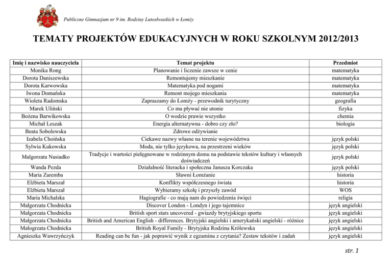 Publiczne Gimnazjum nr 9 im. Rodziny Lutosłwaskich w Łomży TEMATY PROJEKTÓW EDUKACYJNYCH W ROKU SZKOLNYM 2012/2013 Imię i nazwisko nauczyciela Monika Rong Dorota Daniszewska Dorota Karwowska Iwona Domańska Wioleta Radomska Marek Uliński Bożena Barwikowska Michał Leszak Beata Sobolewska Izabela Choińska Sylwia Kukowska Malgorzata Nasiadko Wanda Pezda Maria Zaremba Elżbieta Marszał Elżbieta Marszał Maria Michalska Małgorzata Chodnicka Małgorzata Chodnicka Małgorzata Chodnicka Małogrzata Chodnicka Agnieszka Wawrzyńczyk Temat projektu Planowanie i liczenie zawsze w cenie Remontujemy mieszkanie Matematyka pod nogami Remont mojego mieszkania Zapraszamy do Łomży - przewodnik turytyczny Co ma pływać nie utonie O wodzie prawie wszystko Energia alternatywna - dobro czy zło? Zdrowe odżywianie Ciekawe nazwy własne na terenie województwa Moda, nie tylko językowa, na przestrzeni wieków Tradycje i wartości pielęgnowane w rodzinnym domu na podstawie tekstów kultury i własnych doświadczeń Działalność literacka i społeczna Janusza Korczaka Sławni Łomżanie Konflikty współczesnego świata Wybieramy szkołę i przyszły zawód Hagiografie - co mają nam do powiedzenia święci Discover London - Londyn i jego tajemnice British sport stars uncovered - gwiazdy brytyjskiego sportu British and American English - differences. Brytyjski angielski i amerykański angielski - różnice British Royal Family - Brytyjska Rodzina Królewska Reading can be fun - jak poprawić wynik z egzaminu z czytania? Zestaw tekstów i zadań Przedmiot matematyka matematyka matematyka matematyka geografia fizyka chemia biologia język polski język polski język polski język polski historia historia WOS religia język angielski język angielski język angielski język angielski język angielski str. 1 Publiczne Gimnazjum nr 9 im. Rodziny Lutosłwaskich w Łomży Agnieszka Wawrzyńczyk Iwona Kulka Iwona Kulka Magdalena RakowskaGrochowska Magdalena RakowskaGrochowska Ewa Szymańska Justyna Czerwonko Justyna Czerwonko Radosław Jemielity Izabela Cywińska Andrzej Rogiński Krzysztof Rychter Otwórzmy się na różnorodność. Niezwykłe zwyczaje w krajach anglojęzycznych Deutsch ist einfach - jak szybko i skutecznie zapamiętać nowe słówka Poczytaj mi przyjacielu Nie pozwólmy światu umrzeć z głodu - zmiany klimatyczne a ubóstwo w Krajach globalnego Południa Woda =ż ycie - z czego wynika niedostatek wody pitnej w Krajach Globalnego Południa Nałogi - Jak z nimi walczyć? - Jak wygrać życie? Wielkanoc w sztuce ludowej Podlasia Kompozytorzy naszego regionu Jak zorganizować i przeprowadzić zawody sportowe Znane sylwetki Polskich Medalistów - olimpiady i paraolimpiady w Londynie Jak zostać sędzią sportowym? Poznajemy zasady sprawiedliwgo sędziowania zawodów sportowych Aktywność fizyczna a zdrowie język angielski język niemiecki język niemiecki edukacja globalna edukacja globalna plastyka muzka wychowanie fizyczne wychowanie fizyczne wychowanie fizyczne wychowanie fizyczne str. 2