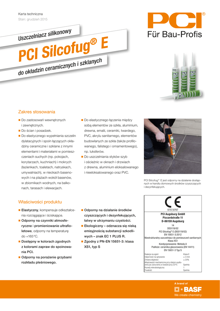 Karta techniczna Stan: grudzień 2015 ikonowy l i s z c a i n Uszczel E g u f o c l i S I PC ® zklanych s i h c y n eramicz c n i z d a ł do ok Zakres stosowania Do zastosowań wewnętrznych i zewnętrznych. Do elastycznego łączenia między sobą elementów ze szkła, aluminium, Do ścian i posadzek. drewna, emalii, ceramiki, twardego, Do elastycznego wypełniania szczelin PVC, akrylu sanitarnego, elementów dylatacyjnych i spoin łączących okła- budowlanych ze szkła (także profilo- dziny ceramiczne i szklane z innymi wanego, falistego i ornamentowego), elementami i materiałami w pomieszczeniach suchych (np. pokojach, np. luksferów. Do uszczelniania styków szyb korytarzach, kuchniach) i mokrych i ościeżnic w oknach i drzwiach (łazienkach, toaletach, natryskach, z drewna, aluminium eloksalowanego umywalniach), w nieckach baseno- i nieeloksalowanego oraz PVC. wych i na plażach wokół basenów, PCI Silcofug® E jest odporny na działanie dostępnych w handlu domowych środków czyszczących i dezynfekujących. w zbiornikach wodnych, na balkonach, tarasach i elewacjach. Właściwości produktu Elastyczny, kompensuje odkształce- nia rozciągające i ściskające. Odporny na czynniki atmosfe- ryczne i promieniowanie ultrafio- Odporny na działanie środków czyszczących i dezynfekujących, łatwy w utrzymaniu czystości. Ekologiczny – odznacza się niską letowe, odporny na temperaturę emisyjnością substancji szkodli- do +165 ºC. wych – znak EC 1 PLUS R. Dostępny w kolorach zgodnych z kolorami zapraw do spoinowania PCI. Odporny na porażenie grzybami rozkładu pleśniowego. Zgodny z PN-EN 15651-3: klasa XS1, typ S 0757,0767 PCI Augsburg GmbH Piccardstraße 11 D-86159 Augsburg 14 DE0119/02 ® PCI Silcofug E (DE0119/02) EN 15651-3:2012 Niestrukturalny uszczelniacz do pomieszczeń sanitarnych Klasa XS1 Kondycjonowanie: Metoda A Podłoże: ceramika glazurowana (EN 14411) EN 15651-3 Typ S Reakcja na ogień Odporność na spływanie Zmiana objętości Właściwości mechaniczne przy stałym wydłużeniu po zanurzeniu w wodzie przy 23 ºC Rozwój mikrobiologiczny Trwałość Klasa E ≤ 3 mm ≤ 20% Spełnia 1 Spełnia Karta techniczna PCI Silcofug® E Dane techniczne Baza materiałowa kauczuk silikonowy, sieciujący na bazie kwasu octowego Składniki produkt 1-składnikowy Gęstość ok. 1,0 g/cm3 Trwałość składowania 24 miesiące Składowanie w suchym miejscu, nie składować długotrwale w temperaturze powyżej +30 ºC Opakowanie kartusz 310 ml z nakręcaną dyszą (karton zbiorczy z 12 kartuszami) Zużycie: wymiary spoin: - 10 × 10 mm - 5 × 5 mm ok. 100 ml/m ok. 25 ml/m Wydajność kartusza 310 ml wymiary spoin: - 10 × 10 mm - 5 × 5 mm ok. 3,1 m ok. 12,4 m Szerokość spoiny do 30 mm Temperatura aplikacji i podłoża +5 ºC do +35 ºC Przyczepność bez gruntowania do szkła, ceramiki, emalii, poliestru, linoleum, żywicy melaminowej, akrylu sanitarnego itp. Przyczepność z gruntowaniem patrz karta techniczna gruntowników PCI Elastoprimer® Szybkość utwardzania* ok. 2 mm/dzień Czas naskórkowania* ok. 10 - 15 minut Odporność termiczna -40 ºC do +165 ºC, krótkotrwale również powyżej Dopuszczalne odkształcenie ok. 20% szerokości spoiny Twardość (Shore A) Odporność na spływanie ok. 25 ≤ 3 mm Wytrzymałość plastyczna ok. 0,6 MPa Skurcz objętościowy ok. 6% Reakcja na ogień wg PN-EN 13501 klasa E * Przy +23 °C i 50% względnej wilgotności powietrza. Wyższa temperatura i niższa wilgotność skracają, niższa temperatura i wyższa wilgotność wydłużają podane czasy. Opakowania Kolory: Kartusz 310 ml nr art./kod EAN 01 brylantowa biel 2981/7 02 beż bahama 2692/2 03 karmel 2750/9 05 średniobrązowy 2754/7 11 jaśmin 2693/9 12 anemon 2747/9 16 srebrnoszary 2711/0 19 bazalt 2691/5 22 piaskowoszary 2700/4 31 cementowoszary 2698/4 40 czarny 2690/8 47 antracyt 2785/1 49 jasnobrązowy 2695/3 50 czerwonobrązowy 2702/8 52 beż 2704/2 53 żółtobrązowy 2705/9 91 magnolia 92 mięta Karta techniczna PCI Silcofug® E Kolory: Kartusz 310 ml nr art./kod EAN 93 krokus przezroczysty 2699/1 Zastrzega się możliwość różnic koloru, uwarunkowanych drukiem. 01 brylantowa biel 19 bazalt 52 beż 02 beż bahama 22 piaskowoszary 53 żółtobrązowy 03 karmel 31 cementowoszary 91 magnolia 05 średniobrązowy 40 czarny 92 mięta 11 jaśmin 47 antracyt 93 krokus 12 anemon 49 jasnobrązowy przezroczysty 16 srebrnoszary 50 czerwonobrązowy Możliwe jest wystąpienie niewielkich różnic w odcieniach barw związanych z procesem druku. Przygotowanie podłoża Szerokość spoiny musi być dobrana Szerokość Głębokość od pyłu i zanieczyszczeń, zwłasz- tak, aby wskutek przemieszczeń/ do 10 mm 10 mm 15 mm 20 mm 25 mm min. 6 mm 8 - 10 mm 8 - 12 mm 10 - 14 mm 12 - 18 mm cza smoły i bitumów. Tłuszcze, zmian długości sąsiednich elementów budowlanych nie została przekroczona całkowita odkształcalność, wynosząca 20% tej szerokości. Przy założonych szerokościach spoin należy zachować niżej podane głębokości: Wewnętrzne powierzchnie boczne smary i oleje należy usuwać z podłoży niechłonnych rozcieńczalnikiem uniwersalnym. W głębsze spoiny należy wcisnąć spoiny lub powierzchnie sklejane tępym narzędziem polipropylenowy muszą być suche, zwarte oraz wolne sznur dylatacyjny. Karta techniczna PCI Silcofug® E Sposób użycia Do wyciskania uszczelniacza z kartusza 2 Przyciskając do boków spoiny wtła- Możliwa jest praca etapami, ponieważ nadają się wszystkie dostępne w han- czać uszczelniacz w spoinę. W połą- świeży uszczelniacz PCI Silcofug® E dlu wyciskarki ręczne i pneumatyczne. czeniach kątowych spoina powinna wykazuje bardzo dobrą przyczepność mieć przekrój trójkątny. do silikonu już utwardzonego. Wyciskanie uszczelniacza 1 Odciąć prosto wierzchołek gwintowa- 3 Przed naskórkowaniem wygładzić uszczelniacz odpowiednim narzędziem, nej końcówki, nakręcić dyszę i uciąć ją zwilżonym wodnym 