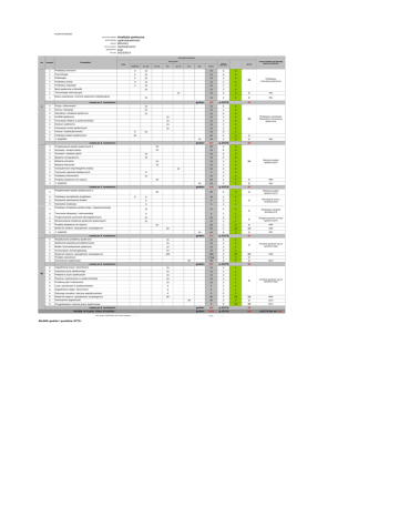 PLAN STUDIÓW Analityka społeczna ogólnoakademicki pierwszy forma studiów: niestacjonarne specjalności: brak od roku: 2013/2014 kierunek studiów: profil studiów: stopień: Szczegóły przedmiotu rok ilość godzin Przedmiot semestr KOD wykładów ćw. aud. ćw. lab. kon. lab. Inf sem. Forma zaliczenia ECTS Podstawy ekonomii 9 15 24 E 5 1 Psychologia 9 15 24 E 5 1 Politologia 9 15 24 Z 4 1 Podstawy prawa 9 15 24 Z 4 1 Podstawy statystyki 9 15 24 Z 4 1 Myśl społeczna w filozofii 15 Z 4 1 Technologie informacyjne 15 Z 15 Z 165 p. ECTS: 15 E 3 15 15 15 Etyka zawodowa i ochrona własności intelektualnej 15 razem po 1. semestrze : godzin: Podstawy interdyscyplinarne 2 2 MU 2 2 MU 30 Grupy i zbiorowości 15 2 Normy i dewiacje 15 Z 3 2 Interakcje i działania społeczne 15 15 E 3 2 Konflikt społeczny 15 15 Z 3 2 Koncepcje władzy w społeczeństwie 15 15 Z 3 2 Dyskurs społeczny 15 15 Z 3 2 Koncepcje zmian społecznych 15 15 Z 3 2 Kultura i wielokulturowość 9 24 E 4 2 Podstawy badań społecznych 30 30 E 3 2 J. angielski 24 24 Z 2 godzin: 183 p. ECTS: 30 30 Z 3 15 15 Projektowanie badań społecznych 1 3 Wywiady i analiza tekstu 15 E 3 3 Sondaże i badania opinii 15 15 E 3 3 Badania etnograficzne 15 15 E 3 3 Badania wizualne 15 15 Z 3 3 Badania fokusowe 15 15 Z 3 3 Komputerowe wspomaganie analizy 15 Z 2 3 Tworzenie raportów badawczych 9 9 Z 2 3 Podstawy ekonometrii 15 15 Z 2 3 Projekty badawcze do wyboru 30 Z 4 3 J. angielski 24 24 Z 2 godzin: 198 p. ECTS: 30 E 3 30 razem po 3. semestrze : 4 Projektowanie badań społecznych 2 30 Podstawy zarządzania projektami 9 18 Z 2 4 Narzędzia planowania działań 9 9 Z 1 4 Narzędzia ewaluacji 9 9 Z 1 15 Podstawy doradztwa społecznego i organizacyjnego Podstawy socjologii. Zjawiska i koncepcje społeczne 3 2 MU 24 Metody badań społecznych 4 MW 2 MU 30 4 9 25 30 3 15 nazwa modułu do którego należy przedmiot 26 2 razem po 2. semestrze : 3 Metody badań społecznych 4 Narzędzia pracy analitycznej 3 Podstawy działań doradczych 15 E 2 4 Tworzenie ekspertyz i rekomendacji 9 9 Z 1 4 Prognozowanie procesów demograficznych 15 15 Z 1 4 Monitorowanie tendencji społeczno-kulturowych 15 15 Z 1 2 Diagnozowanie zmian społecznych 4 Projekty badawcze do wyboru 30 Z 5 5 MW 4 Moduł do wyboru: specjalności socjologiczne 4 J. angielski 4 30 60 razem po 4. semestrze : 60 Z 10 10 MW 24 24 E 3 3 MU godzin: 234 p. ECTS: 30 5 Współczesne problemy społeczne 15 15 E 1 5 Społeczne aspekty przesiębiorczości 15 15 Z 1 5 Media i komunikowanie społeczne 15 15 Z 1 5 Konsumpcja i komercjalizacja 15 15 Z 1 5 Moduł do wyboru: specjalności socjologiczne 180 5 5 Praktyki zawodowe Seminarium dyplomowe 6 Zagadnienia pracy i bezrobocia 15 6 Instytucje życia społecznego 15 6 Polityka w życiu społecznym 6 Rodzina i partnerstwo w społeczeństwie 6 Problemy płci i tożsamości 6 Czas i przestrzeń w społeczeństwie 6 Zagadnienia religii i etniczności 9 Z 6 Dylematy moralne i etyczne współczesności 9 9 E 1 6 60 60 Z 10 10 MW 6 Moduł do wyboru: specjalności socjologiczne Seminarium dyplomowe 30 Z 2 2 Sem 6 Przygotowanie i obrona pracy dyplomowej 0 E 10 10 Sem razem po 6. semestrze : Plan studiów zatwierdzony przez Rade Wydziału ........………. BILANS godzin i punktów ECTS: Analiza zjawisk życia społecznego 180 Z 22 22 MW Z Z 4 2 4 2 Sem 270 p. ECTS: 15 Z 1 15 Z 1 15 15 Z 1 15 15 Z 1 15 15 Z 1 9 9 Z 1 godzin: 9 RAZEM W CIĄGU TOKU STUDIÓW : 4 4 tyg 30 30 razem po 5. semestrze : III Razem 1 1 I lekt. 30 godzin: 192 godzin: 1242 w dniu 32 8 1 p. ECTS: 30 p. ECTS: 182 ................ Analiza zjawisk życia społecznego p.ECTS bez wf: 182 PLAN STUDIÓW Analityka społeczna ogólnoakademicki stopień: pierwszy forma studiów: niestacjonarne specjalności: brak kierunek studiów: profil studiów: od roku: 2013/2014 Szczegóły przedmiotu rok ilość godzin Przedmiot semestr KOD ćw. aud. ćw. lab. kon. lab. Inf lekt. Razem Forma zaliczenia ECTS Podstawy ekonomii 9 9 18 E 5 1 Psychologia 9 9 18 E 5 1 Politologia 9 9 18 Z 4 1 Podstawy prawa 9 9 18 Z 4 1 Podstawy statystyki 9 9 18 Z 4 1 Myśl społeczna w filozofii 9 9 Z 4 1 Technologie informacyjne 9 Z 2 9 9 Z 2 2 Grupy i zbiorowości 9 9 E 3 2 Normy i dewiacje 9 9 Z 3 2 Interakcje i działania społeczne 9 9 E 3 2 Konflikt społeczny 9 9 Z 3 2 Koncepcje władzy w społeczeństwie 9 9 Z 3 2 Dyskurs społeczny 9 9 Z 3 2 Koncepcje zmian społecznych 9 9 Z 3 2 Kultura i wielokulturowość 9 18 E 4 2 Podstawy badań społecznych 30 30 E 3 2 J. angielski 24 24 Z godzin: 252 p. ECTS: 60 9 Etyka zawodowa i ochrona własności intelektualnej 9 razem po I roku : 2 3 Projektowanie badań społecznych 1 15 15 E 3 3 Wywiady i analiza tekstu 9 9 Z 3 3 Sondaże i badania opinii 9 9 E 3 3 Badania etnograficzne 9 9 E 3 3 Badania wizualne 9 9 Z 3 3 Badania fokusowe 9 9 Z 3 3 Komputerowe wspomaganie analizy 9 Z 2 3 Tworzenie raportów badawczych 9 9 Z 2 3 Podstawy ekonometrii 9 9 Z 2 4 Projektowanie badań społecznych 2 15 E 3 4 Podstawy zarządzania projektami 9 9 Z 2 4 Narzędzia planowania działań 9 9 Z 1 4 Narzędzia ewaluacji 9 9 Z 1 9 9 E 2 4 9 15 Podstawy doradztwa społecznego i organizacyjnego 4 Tworzenie ekspertyz i rekomendacji 9 9 Z 1 4 Prognozowanie procesów demograficznych 9 9 Z 1 4 Monitorowanie tendencji społeczno-kulturowych 9 9 Z 1 4 Moduł do wyboru: specjalności socjologiczne 60 60 Z 10 9 3/4 Projekty badawcze do wyboru 3/4 J. angielski 60 razem po II roku : III sem. 1 1 I wykładów 60 Z 48 48 E 5 godzin: 333 p. ECTS: 60 5 Współczesne problemy społeczne 9 9 E 1 5 Społeczne aspekty przesiębiorczości 9 9 Z 1 5 Media i komunikowanie społeczne 9 9 Z 1 5 Konsumpcja i komercjalizacja 9 9 Z 1 5 Praktyki zawodowe 4 tyg Z 4 6 Zagadnienia pracy i bezrobocia 9 9 Z 1 6 Instytucje życia społecznego 9 9 Z 1 6 Polityka w życiu społecznym 9 9 Z 1 6 Rodzina i partnerstwo w społeczeństwie 9 9 Z 1 6 Problemy płci i tożsamości 9 9 Z 1 6 Czas i przestrzeń w społeczeństwie 9 9 Z 1 6 Zagadnienia r