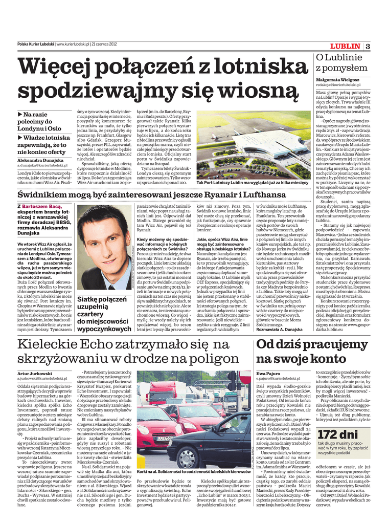 Polska Kurier Lubelski | www.kurierlubelski.pl | 21 czerwca 2012 LUBLIN 3 Więcej połączeń z lotniska spodziewajmy się wiosną b Na razie polecimy do Londynu i Oslo b Władze lotniska zapewniają, że to nie koniec oferty Aleksandra Dunajska [email protected] Londyn i Oslo to pierwsze połączenia, jakie z lotniska w Świdniku uruchomi Wizz Air. Pisali- łączeń (m.in. do Barcelony, Rzymu i Budapesztu). Ofertę przygotował także Ryanair. Kilka pierwszych połączeń wystartuje w lipcu, a do końca roku będzie ichkilkanaście.Listę tras z Modlina przewoźnicy ogłosili na początku marca, czyli niecałe pięć miesięcy przed otwarciem lotniska. Oficjalny start portu w Świdniku zapowiedziano na listopad. Tymczasem bilety Świdnik Londyn cieszą się ogromnym zainteresowaniem.Tylkowczoraj sprzedano ich ponad 100. śmy o tym wczoraj. Kiedy informacja pojawiła się w internecie, posypały się komentarze: że kierunków za mało, że tylko jedna linia, że przydałyby się jeszcze np. Frankfurt, Glasgow albo Gdańsk. Grzegorz Muszyński, prezes PLL, zapewniał, że lotów i operatorów będzie więcej. Ale szczegółów zdradzić nie chciał. Sprawdziliśmy, jaką ofertą dysponuje lotnisko w Modlinie, które rozpocznie działalność 16 lipca. Do końca tego miesiąca Wizz Air uruchomi tam 20 po- Tak Port Lotniczy Lublin ma wyglądać już za kilka miesięcy Świdnikiem mogą być zainteresowani jeszcze Ryanair i Lufthansa Z Bartoszem Bacą, ekspertem branży lotniczej z warszawskiej firmy doradczej BBSG, rozmawia Aleksandra Dunajska Duża ilość połączeń oferowanych przez Modlin to kwestia chłonnego warszawskiego rynku, z którym lubelski nie może się równać. Port lotniczy im. Chopina w Warszawie nigdy nie byłpreferowanyprzezprzewoźników niskokosztowych, bo nie jest lotniskiem, które bardzo silniezabiegaotakielinie,atymsamym jest droższy. Tymczasem ARCHIWUMPRYWATNEBARTOSZABACY We wtorek Wizz Air ogłosił, że uruchomi z Lublina połączenia do Londynu i Oslo.Tymczasem z Modlina, otwieranego dla ruchu pasażerskiego w lipcu, już w tym samym miesiącu będzie można polecieć do około 20 miast. Siatkę połączeń uzupełnią czartery do miejscowości wypoczynkowych pasażerowiechcąlataćtanimiliniami, więc popyt na usługi tanich linii jest. Odpowiedź dał Modlin. Dlatego przeniósł się tam Wizz Air, pojawił się też Ryanair. ków niż zimowy. Poza tym, Świdnik to nowe lotnisko, linie być może chcą się przekonać, jak funkcjonuje, czy sprawnie i bezpiecznie realizuje operacje lotnicze. Kiedy możemy się spodziewać informacji o kolejnych połączeniach ze Świdnika? Jakie, oprócz Wizz Aira, linie mogą być zainteresowane obsługą lubelskiego lotniska? Pozostaje mieć nadzieję, że dwa kierunki Wizz Aira to dopiero początek.Linielotniczeukładają siatki połączeń - co do zasady sezonowo i jeśli chodzi o okres zimowy, to już ostatni moment dla portu w Świdniku na podpisanieumównazimę2012/13.Jeżeli informacje o nowych połączeniachnatenczasniepojawią sięwnajbliższychtygodniach,to pewnie już ich nie będzie. Ale to nieoznacza,żeniezostanąuruchomione wiosną. Co więcej myślę, że wtedy należy się ich spodziewać więcej, bo sezon letni jest lepszy dla przewoźni- Naturalnym kandydatem jest Ryanair, ale trzeba pamiętać, że to przewoźnik wymagający, do którego funkcjonowania często muszą dopłacać samorządy lokalne. O Lublinie myśli OLT Express, specjalizujący się w połączeniach krajowych. Jednak w przypadku tej linii nie jestem przekonany o stabilności oferowanych połączeń. Jej strategia polega na tym, że uruchamia połączenia i sprawdza, jakie jest faktyczne zainteresowanie. Jeśli niewielkie – szybko z nich rezygnuje. Z linii regularnych widziałbym w Świdniku może Lufthansę, która mogłaby latać np. do Frankfurtu. Ten przewoźnik często proponuje loty z mniejszych portów do swoich hubów w Niemczech, gdzie pasażerowie mogą skorzystać z połączeń tej linii do innych krajów europejskich, ale też np. do Nowego Jorku (w Świdniku nie będzie technicznych możliwości uruchomienia takich kierunków, pas startowy będzie za krótki - red.). Nie spodziewałbym się zaś oferowania przez przewoźników tradycyjnych podróży do Paryża czy Madrytu bezpośrednio z Lublina. Takie loty mogą zaś uruchomić przewoźnicy niskokosztowi. Siatkę połączeń w Świdniku uzupełnią oczywiście czartery do miejscowości wypoczynkowych, głównie w basenie Morza Śródziemnego. Rozmawiała A. Dunajska Kieleckie Echo zatrzymało się na skrzyżowaniu w drodze na poligon [email protected] Oddala się termin podjęcia rozstrzygających decyzji w sprawie budowy hipermarketu na górkach czechowskich. Inwestor, kielecka spółka spółka Echo Investment, poprosił ratusz oprzesunięcieoczterymiesiące debaty radnych nad zmianą planu zagospodarowania poligonu, która umożliwi inwestycję. - Projekt uchwały trafi na sesjęwpaździerniku-poinformowała wczoraj Katarzyna Mieczkowska-Czerniak, rzeczniczka prezydenta Lublina. To nieoczekiwany zwrot w sprawie poligonu. Jeszcze na wczoraj ratusz szumnie zapowiadał podpisanie porozumienia z EI dotyczącego warunków przebudowy skrzyżowania Solidarności - Sikorskiego - gen. Ducha - Wyrwasa. W ostatniej chwili spotkanie zostało odwołane. -Potrzebujemyjeszczetrochę czasunaanalizęrynkowąprzedsięwzięcia-tłumaczyłKurierowi Krzysztof Kwapisz, prokurent Echo Investment. I zapewniał: - Wszystkie obszary negocjacji dotyczące przebudowy układu drogowego zostały zamknięte. Niezmieniamynaszychplanów wobec Lublina. EI ma sfinansować roboty drogowezwłasnejkasy.Ponadto wynegocjowane obecnie porozumienieokreślawysokośćkar, jakie zapłaciłby deweloper, gdyby nie ruszył z robotami wiosną przyszłego roku. - Nie możemy na razie zdradzić o jakie kwoty chodzi - stwierdziła Mieczkowska-Czerniak. Na al. Solidarności ma pojawić się kładka dla aut, która umożli