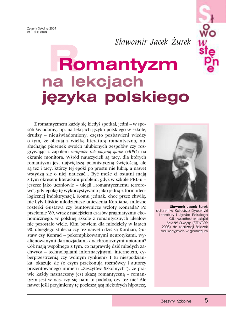 Zeszyty Szkolne 2004 nr 1 (11) zima Sławomir Jacek Żurek Romantyzm R na lekcjach języka polskiego Z romantyzmem każdy się kiedyś spotkał, jedni – w sposób świadomy, np. na lekcjach języka polskiego w szkole, drudzy – nieuświadomiony, często pozbawieni wiedzy o tym, że obcują z wielką literaturą romantyczną, np. słuchając piosenek swoich ulubionych zespołów czy rozgrywając z zapałem computer role-playing game (cRPG) na ekranie monitora. Wśród nauczycieli są tacy, dla których romantyzm jest największą polonistyczną świętością, ale są też i tacy, którzy tej epoki po prostu nie lubią, a nawet wstydzą się o niej nauczać... Być może ci ostatni mają z tym okresem literackim problem, gdyż w szkole PRL-u – jeszcze jako uczniowie – ulegli „romantycznemu terrorowi”, gdy epokę tę wykorzystywano jako jedną z form ideologicznej indoktrynacji. Komu jednak, choć przez chwilę, nie były bliskie młodzieńcze uniesienia Kordiana, miłosne rozterki Gustawa czy buntownicze wzloty Konrada? Po przełomie ’89, wraz z nadejściem czasów pragmatyzmu ekonomicznego, w polskiej szkole z romantycznych ideałów nie pozostało wiele. Kim bowiem dla młodzieży w latach 90. ubiegłego stulecia czy też nawet i dziś są Kordian, Gustaw czy Konrad – pokomplikowanymi neurotykami, wyalienowanymi darmozjadami, anachronicznymi upiorami? Cóż mają wspólnego z tym, co naprawdę dziś młodych zachwyca – technologiami informacyjnymi, internetem, cyberprzestrzenią czy wolnym rynkiem? I tu niespodzianka: okazuje się (o czym przekonują rozmówcy i autorzy prezentowanego numeru „Zeszytów Szkolnych”), że prawie każdy naznaczony jest skazą romantyczną – romantyzm jest w nas, czy się nam to podoba, czy też nie! Ale nawet jeśli przyjmiemy tę pocieszającą niektórych hipotezę, Sławomir Jacek Żurek adiunkt w Katedrze Dydaktyki Literatury i Języka Polskiego KUL; współautor książki Ścieżki Europy (STENTOR 2003) do realizacji ścieżek edukacyjnych w gimnazjum Zeszyty Szkolne 5 Sławomir Jacek Żurek to mimo wszystko pozostaje ten sam problem: jak mówić o romantyzmie po 200 latach? W prezentowanym numerze „Zeszytów Szkolnych” [2004, nr 1(11)] pytanie to postawiliśmy badaczom romantyzmu, metodykom, nauczycielom i uczniom. Prof. Marian Maciejewski w rozmowie z Wacławem Pyczkiem i Sławomirem Jackiem Żurkiem (Romantyzm po 200 latach) stwierdził, że w romantyzmie „można znaleźć odpowiedź na każdy problem, tu można szukać inspiracji dla nowych rozwiązań artystycznych. Bez romantyzmu nie można zrozumieć siebie, dlatego należy do niego wracać nawet po dwustu latach”. Uczony z Katolickiego Uniwersytetu Lubelskiego próbuje także dać nauczycielom kilka konkretnych rad, podkreślając po wielekroć wagę aksjologii chrześcijańskiej w odczytaniu tej epoki. Drugim naszym rozmówcą jest prof. Józef Bachórz z Uniwersytetu Gdańskiego, który próbuje spojrzeć na romantyzm z nieco innej perspektywy – badacza pozytywizmu. Blok szkiców poświęconych nowemu odczytaniu epoki romantycznej rozpoczyna artykuł prof. Aliny Kowalczykowej z Instytutu Badań Literackich PAN. Autorka ta, nieco z przymrużeniem oka, pisze o kobietach dwóch polskich romantyków – Mickiewicza i Słowackiego, a właściwie o różnych kreacjach kobiecości, z którymi można się spotkać na kartach ich twórczości. Kolejny głos należy do Małgorzaty Łukaszuk (KUL), która zastanawia się nad znaczeniem romantyzmu dla epoki po-nowoczesnej – nad determinującą rolą owej polifonicznej tradycji dla kształtu obecnej kultury (Romantyzm czy romantyzmy?). Wypowiedzi tej dopełnia szkic Rafała Rutkowskiego (Uniwersytet im. M. Kopernika w Toruniu), będący próbą podsumowania osiągnięć najnowszej 6 Zeszyty Szkolne poezji w kontekście spuścizny pierwszej połowy XIX w. (Najnowsza poezja wobec tradycji romantycznej). Warto w tej części „Zeszytów Szkolnych” zwrócić także uwagę na dwie inne wypowiedzi: Telefon do Norwida, czyli analogi i analogie Grzegorza Olszańskiego oraz Gry fabularne i komputerowe a romantyzm Macieja Zaremby, w świetle których być może wielu nauczycieli inaczej spojrzy na uczniowskie fascynacje i wykorzysta je do zaznajomienia młodzieży z romantycznymi źródłami najnowszych osiągnięć kultury. Całość „Głosów wokół romantyzmu” zamykają wypowiedzi: uczniów, nauczycieli polonistów, metodyków, redaktorów, a także badaczy zebranych na debacie, która miała miejsce w Wydawnictwie STENTOR, a poświęcona była obecności romantyzmu w szkole. W kolejnych działach („Od stażu do dylomu” i „Czas na wiersz!”) dalsze romantyczne dywagacje: Agnieszki Wojnowskiej o różnego rodzaju tworach fantazji autora Pana Tadeusza (Co wolno Mickiewiczowi?), Jacka Brzozowskiego o krótkim fragmencie wiersza (Lozański urywek Mickiewicza) oraz Ewy Obary-Grączewskiej o XX-wiecznym poecie-kreatorze (Mit romantycznego artysty. O wierszu Poeta Andrzeja Bursy), które – mamy taką nadzieję – staną się inspiracją w projektowaniu rozwiązań metodycznych służących głębszemu odczytaniu poezji romantycznej. Na „Językoznawczych stronach” tym razem inne spojrzenie na romantyczną komedię. Katarzyna Bocheńska proponuje, jak wykorzystać tekst Aleksandra Fredry przy realizacji zagadnień językoznawczych (Komunikacja interpersonalna w Zemście). W dziale „Bombowe lekcje” pięć różnych propozycji scenariuszy (w większości do wykorzystania przy omawianiu kontekstów interpretacyjnych epoki romantycznej): Romantyzm na lekcjach języka polskiego Od erosa do agape. O potędze miłości na podstawie Pieśni nad pieśniami, Hymnu o miłości św. Pawła i przypowieści o miłosiernym Samarytaninie (Iwona Otulakowska), Dwa obrazy – dwa światy. Wokół zaślubin w malarstwie i literaturze (Katarzyna Wrembel), Życie z Bogiem, „życie bez boga” (Katarzyna Michałek), Metodą biograf
