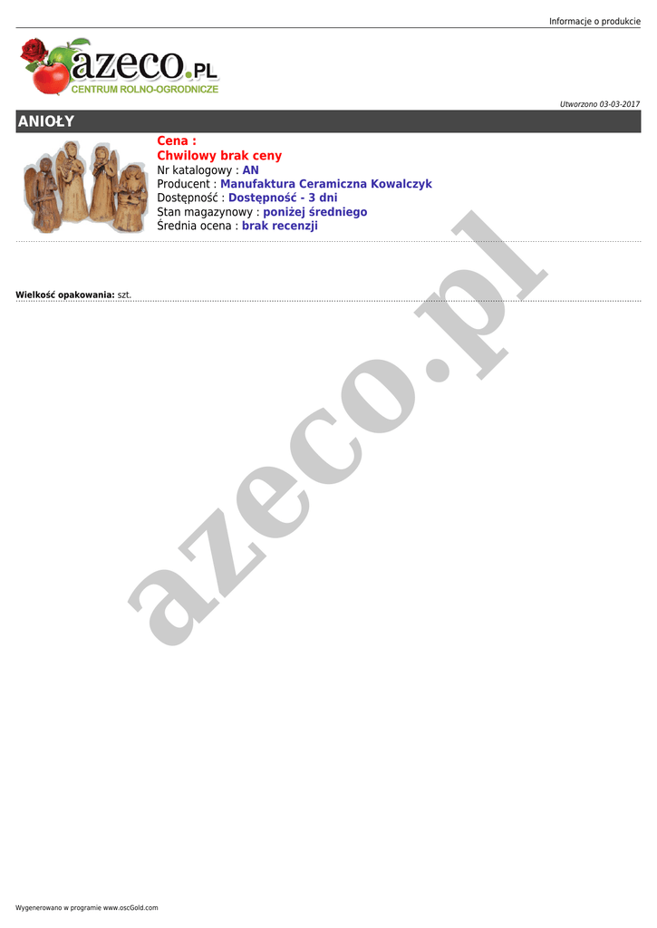Informacje o produkcie Utworzono 03-03-2017 ANIOŁY Cena : Chwilowy brak ceny o. pl Nr katalogowy : AN Producent : Manufaktura Ceramiczna Kowalczyk Dostępność : Dostępność - 3 dni Stan magazynowy : poniżej średniego Średnia ocena : brak recenzji az ec Wielkość opakowania: szt. Wygenerowano w programie www.oscGold.com
