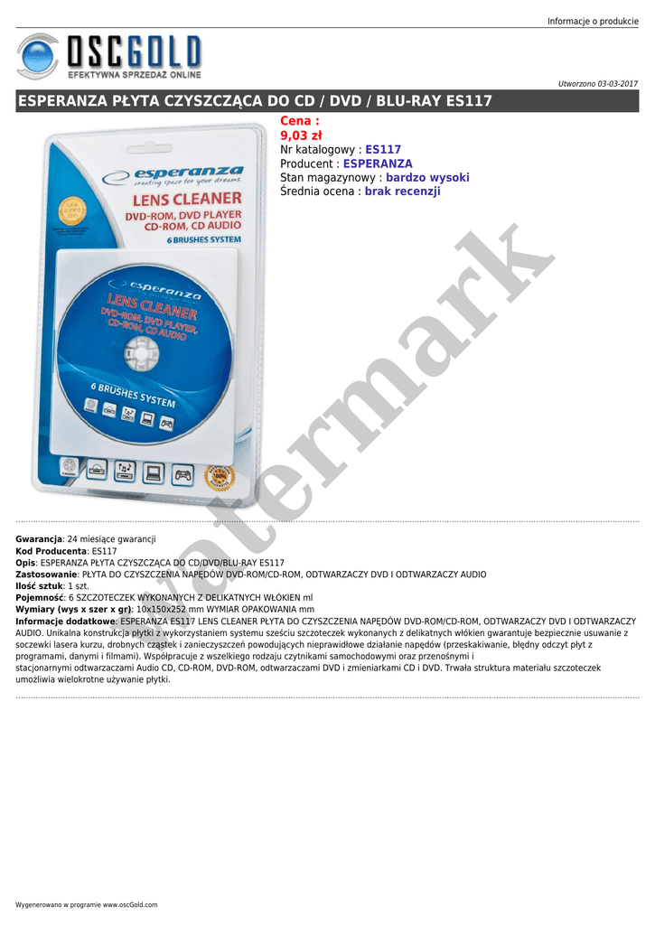Informacje o produkcie Utworzono 03-03-2017 ESPERANZA PŁYTA CZYSZCZĄCA DO CD / DVD / BLU-RAY ES117 Cena : 9,03 zł at er m ar k Nr katalogowy : ES117 Producent : ESPERANZA Stan magazynowy : bardzo wysoki Średnia ocena : brak recenzji w Gwarancja: 24 miesiące gwarancji Kod Producenta: ES117 Opis: ESPERANZA PŁYTA CZYSZCZĄCA DO CD/DVD/BLU-RAY ES117 Zastosowanie: PŁYTA DO CZYSZCZENIA NAPĘDÓW DVD-ROM/CD-ROM, ODTWARZACZY DVD I ODTWARZACZY AUDIO Ilość sztuk: 1 szt. Pojemność: 6 SZCZOTECZEK WYKONANYCH Z DELIKATNYCH WŁÓKIEN ml Wymiary (wys x szer x gr): 10x150x252 mm WYMIAR OPAKOWANIA mm Informacje dodatkowe: ESPERANZA ES117 LENS CLEANER PŁYTA DO CZYSZCZENIA NAPĘDÓW DVD-ROM/CD-ROM, ODTWARZACZY DVD I ODTWARZACZY AUDIO. Unikalna konstrukcja płytki z wykorzystaniem systemu sześciu szczoteczek wykonanych z delikatnych włókien gwarantuje bezpiecznie usuwanie z soczewki lasera kurzu, drobnych cząstek i zanieczyszczeń powodujących nieprawidłowe działanie napędów (przeskakiwanie, błędny odczyt płyt z programami, danymi i filmami). Współpracuje z wszelkiego rodzaju czytnikami samochodowymi oraz przenośnymi i stacjonarnymi odtwarzaczami Audio CD, CD-ROM, DVD-ROM, odtwarzaczami DVD i zmieniarkami CD i DVD. Trwała struktura materiału szczoteczek umożliwia wielokrotne używanie płytki. Wygenerowano w programie www.oscGold.com