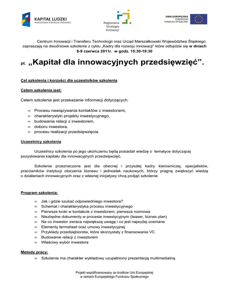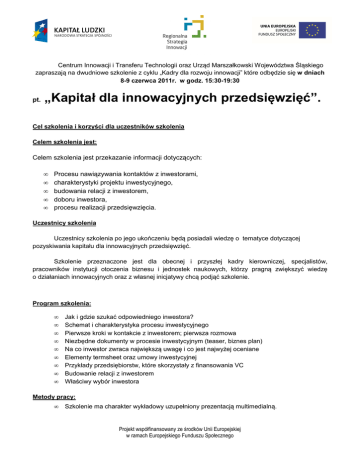 Centrum Innowacji i Transferu Technologii oraz Urząd Marszałkowski Województwa Śląskiego zapraszają na dwudniowe szkolenie z cyklu „Kadry dla rozwoju innowacji” które odbędzie się w dniach 8-9 czerwca 2011r. w godz. 15:30-19:30 pt. „Kapitał dla innowacyjnych przedsięwzięć”. Cel szkolenia i korzyści dla uczestników szkolenia Celem szkolenia jest: Celem szkolenia jest przekazanie informacji dotyczących: • • • • • Procesu nawiązywania kontaktów z inwestorami, charakterystyki projektu inwestycyjnego, budowania relacji z inwestorem, doboru inwestora, procesu realizacji przedsięwzięcia. Uczestnicy szkolenia Uczestnicy szkolenia po jego ukończeniu będą posiadali wiedzę o tematyce dotyczącej pozyskiwania kapitału dla innowacyjnych przedsięwzięć. Szkolenie przeznaczone jest dla obecnej i przyszłej kadry kierowniczej, specjalistów, pracowników instytucji otoczenia biznesu i jednostek naukowych, którzy pragną zwiększyć wiedzę o działaniach innowacyjnych oraz z własnej inicjatywy chcą podjąć szkolenie. Program szkolenia: • • • • • • • • • Jak i gdzie szukać odpowiedniego inwestora? Schemat i charakterystyka procesu inwestycyjnego Pierwsze kroki w kontakcie z inwestorem; pierwsza rozmowa Niezbędne dokumenty w procesie inwestycyjnym (teaser, biznes plan) Na co inwestor zwraca największą uwagę i co jest najwyżej oceniane Elementy termsheet oraz umowy inwestycyjnej Przykłady przedsiębiorstw, które skorzystały z finansowania VC Budowanie relacji z inwestorem Właściwy wybór inwestora Metody pracy: • Szkolenie ma charakter wykładowy uzupełniony prezentacją multimedialną. Projekt współfinansowany ze środków Unii Europejskiej w ramach Europejskiego Funduszu Społecznego Warunki uczestnictwa • • • • • Udział w szkoleniu jest bezpłatny (decyduje obecność na szkoleniu) Uczestnikiem szkolenia muszą być osoby pracujące - zameldowane bądź pracujące na terenie województwa śląskiego Pierwszeństwo w rekrutacji mają osoby, które dotychczas nie skorzystały ze wsparcia w ramach Projektu „Zarządzanie, wdrażanie i monitorowanie Regionalnej Strategii Innowacji Województwa Śląskiego”. O przyjęciu na szkolenie decyduje kolejność zgłoszeń Liczba miejsc ograniczona Prowadzący: ekspert w dziedzinie Formularz zgłoszeniowy na stronie: http://www.citt.polsl.pl/formularz/ Szkolenie współfinansowane jest przez Unię Europejską ze środków Europejskiego Funduszu Społecznego w ramach projektu: „Zarządzanie, wdrażanie i monitorowanie Regionalnej Strategii Innowacji Województwa Śląskiego” realizowanego w ramach poddziałania 8.2.2. Programu Operacyjnego Kapitał Ludzki. Kontakt: Biuro Projektu Systemowego Centrum Innowacji i Transferu Technologii Politechniki Śląskiej Ul. Jagiellońska 38A 41-800 Zabrze Tel. 32 278-75-22, fax: 32 278-75-11 e-mali: [email protected] Projekt współfinansowany ze środków Unii Europejskiej w ramach Europejskiego Funduszu Społecznego