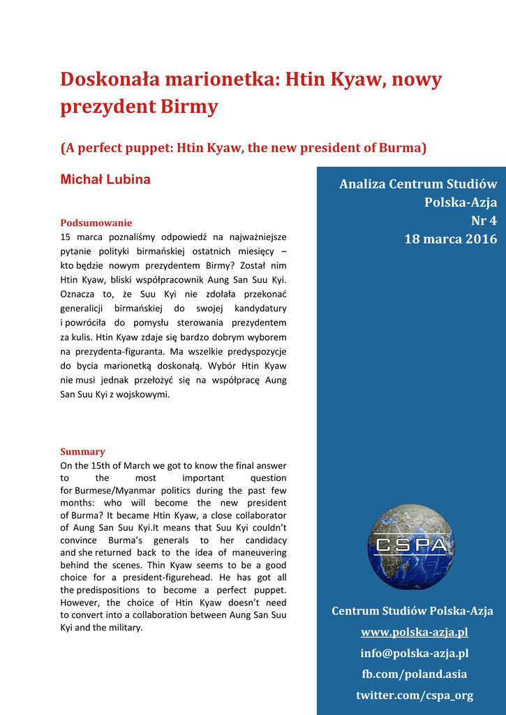 Doskonała marionetka: Htin Kyaw, nowy prezydent Birmy (A perfect puppet: Htin Kyaw, the new president of Burma) Michał Lubina Podsumowanie 15 marca poznaliśmy odpowiedź na najważniejsze pytanie polityki birmaoskiej ostatnich miesięcy – kto będzie nowym prezydentem Birmy? Został nim Htin Kyaw, bliski współpracownik Aung San Suu Kyi. Oznacza to, że Suu Kyi nie zdołała przekonad generalicji birmaoskiej do swojej kandydatury i powróciła do pomysłu sterowania prezydentem za kulis. Htin Kyaw zdaje się bardzo dobrym wyborem na prezydenta-figuranta. Ma wszelkie predyspozycje do bycia marionetką doskonałą. Wybór Htin Kyaw nie musi jednak przełożyd się na współpracę Aung San Suu Kyi z wojskowymi. Summary On the 15th of March we got to know the final answer to the most important question for Burmese/Myanmar politics during the past few months: who will become the new president of Burma? It became Htin Kyaw, a close collaborator of Aung San Suu Kyi.It means that Suu Kyi couldn’t convince Burma’s generals to her candidacy and she returned back to the idea of maneuvering behind the scenes. Thin Kyaw seems to be a good choice for a president-figurehead. He has got all the predispositions to become a perfect puppet. However, the choice of Htin Kyaw doesn’t need to convert into a collaboration between Aung San Suu Kyi and the military. Analiza Centrum Studiów Polska-Azja Nr 4 18 marca 2016 Centrum Studiów Polska-Azja www.polska-azja.pl [email protected] fb.com/poland.asia twitter.com/cspa_org Doskonała Marionetka: Htin Kyaw… Michał Lubina 15 marca poznaliśmy odpowiedź na najważniejsze pytanie polityki birmaoskiej ostatnich miesięcy – kto będzie nowym prezydentem Birmy? Został nim Htin Kyaw, bliski współpracownik Aung San Suu Kyi. Oznacza to, że Suu Kyi nie zdołała przekonad generalicji birmaoskiej do swojej kandydatury i powróciła do pomysłu sterowania prezydentem zza kulis. Htin Kyaw zdaje się bardzo dobrym wyborem na prezydenta-figuranta. Ma wszelkie predyspozycje do bycia marionetką doskonałą. Wybór Htin Kyaw nie musi jednak przełożyd się na współpracę Aung San Suu Kyi z wojskowymi. Długie przekazywanie władzy Birma po ponad sześddziesięciu latach wojskowej dyktatury powraca do eksperymentów z demokracją. Jednakże system polityczny tego kraju, oparty na konstytucji z 2008 r. i wielu mechanizmach pozaformalnych, został zaprojektowany przez Tatmadaw (armię birmaoską). Stworzono go tak nie tylko po to by utrzymad armijne przywileje, lecz również by w razie najgorszego generalicja mogła utrzymad strukturalną równowagę sił i szachowad każdy rząd cywilny. Ta przezornośd opłaciła się Tatmadaw: najgorsze naprawdę nastąpiło – w wyborach powszechnych w listopadzie 2015 roku miażdżąco zwyciężyła opozycyjna Narodowa Liga na rzecz Demokracji (NLD) długoletniej przeciwniczki armii, Aung San Suu Kyi. Jednym z bezpieczników armii był bardzo długi proces przekazywania władzy. Od wyborów w listopadzie do pierwszej sesji parlamentu, wyłaniających kandydatów na prezydenta w lutym, minęło niemal dwa miesiące. Do obecnego wyboru prezydenta – następny miesiąc. Tak długi okres przekazywania władzy lokuje Birmę w niechlubnej światowej czołówce. Pozwolił jednak armii na przystosowanie się do nowej sytuacji. Dał również dużo czasu na zakulisowe negocjacje między wojskowymi a Aung San Suu Kyi. Nieudana szarża Suu Kyi Suu Kyi szła do wyborów z pomysłem wyznaczenia marionetkowego prezydenta. Mając świadomośd, iż konstytucja birmaoska zakazuje jej ubiegania się o prezydenturę, mówiła wprost, iż wybierze figuranta, a sama będzie podejmowad najważniejsze decyzje („będę ponad prezydentem”). Prawdopodobnie z takim scenariuszem rozpoczęła również negocjacje z wojskowym establishmentem (szerzej, vide: analiza nr 2 CSPA). Jednakże jej wzmocniona po wyborach pozycja doprowadziły ją do brawurowej szarży – pod koniec stycznia, tuż przed wyznaczeniem kandydata na prezydenta, Suu Kyi spróbowała przekonad generałów do zmiany konstytucji i zgody na jej osobę. Wywołało to wielkie emocje społeczne i rozbudziło ogromne nadzieje. Wielu uwierzyło, że Suu Kyi zdoła wymanewrowad dla siebie prezydenturę. Tak jednak się nie stało. Według przecieków Suu Kyi nie zdołała porozumied się z szefem sztabu armii birmaoskiej, gen. Min Aung Hlaingiem. Nie chcąc ryzykowad zamachu stanu armii, zdecydowała się wycofad i powrócid do pierwotnego planu wyznaczenia figuranta. Centrum Studiów Polska-Azja ul. Nowy Świat 27 lok. 1, 00-029 Warszawa 2 Doskonała Marionetka: Htin Kyaw… Michał Lubina O tym, że nie był to wymarzony scenariusz świadczy fakt, że Suu Kyi celowo obniżyła rangę wyboru prezydenta – m.in. nie pojawiła się na sesji parlamentu, podczas której nominowano kandydatów. Wizerunkowo NLD zamiast podkreślad „święto demokracji” – objęcia prezydentury przez pierwszego „prawdziwego” cywila od 1962 roku, raczej ukazywała cały proces jako konieczną formalnośd techniczną. Nieznany kandydat Chociaż Htin Kyaw był wymieniany wśród potencjalnych kandydatów na prezydenta (jego osoba pojawiła się w wyścigu prezydenckim po raz pierwszy w przecieku medialnym z NLD pod koniec stycznia), to jednak jego nominacja jest zaskoczeniem. Bardziej prawdopodobne wydawały się byd osoby Tin Mar Aung czy nawet Tin Oo. Tym niemniej to właśnie Htin Kyaw wybrała Suu Kyi. Gdy NLD rekomendowało Htin Kyaw na prezydenta, mało kto wiedział kim on jest (z wyjątkiem najbliższego kręgu Suu Kyi i generałów biorących udział w zakulisowych negocjacjach). W sieci pojawiło się mnóstwo niesprawdzonych informacji, takich jak ta o ukooczeniu przez Htin Kyaw Oksfordu (w rzeczywistości jest absolwentem LSE). Największą wpadkę zaliczyli dziennikarze CNN, pisząc o nim jako „kierowcy” Suu Kyi (błąd ten powtórzyła później BBC) i publikując zdjęcie… i