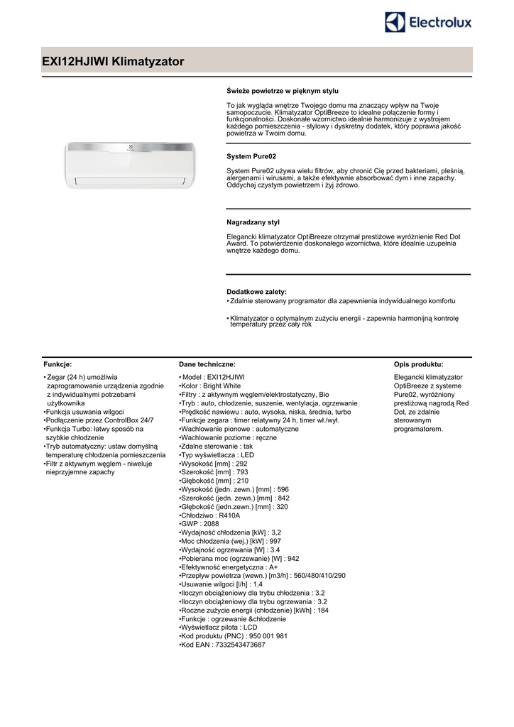 EXI12HJIWI Klimatyzator Świeże powietrze w pięknym stylu To jak wygląda wnętrze Twojego domu ma znaczący wpływ na Twoje samopoczucie. Klimatyzator OptiBreeze to idealne połączenie formy i funkcjonalności. Doskonałe wzornictwo idealnie harmonizuje z wystrojem każdego pomieszczenia - stylowy i dyskretny dodatek, który poprawia jakość powietrza w Twoim domu. System Pure02 System Pure02 używa wielu filtrów, aby chronić Cię przed bakteriami, pleśnią, alergenami i wirusami, a także efektywnie absorbować dym i inne zapachy. Oddychaj czystym powietrzem i żyj zdrowo. Nagradzany styl Elegancki klimatyzator OptiBreeze otrzymał prestiżowe wyróżnienie Red Dot Award. To potwierdzenie doskonałego wzornictwa, które idealnie uzupełnia wnętrze każdego domu. Dodatkowe zalety: • Zdalnie sterowany programator dla zapewnienia indywidualnego komfortu • Klimatyzator o optymalnym zużyciu energii - zapewnia harmonijną kontrolę temperatury przez cały rok Funkcje: Dane techniczne: Opis produktu: • Zegar (24 h) umożliwia zaprogramowanie urządzenia zgodnie z indywidualnymi potrzebami użytkownika •Funkcja usuwania wilgoci •Podłączenie przez ControlBox 24/7 •Funkcja Turbo: łatwy sposób na szybkie chłodzenie •Tryb automatyczny: ustaw domyślną temperaturę chłodzenia pomieszczenia •Filtr z aktywnym węglem - niweluje nieprzyjemne zapachy • Model : EXI12HJIWI •Kolor : Bright White •Filtry : z aktywnym węglem/elektrostatyczny, Bio •Tryb : auto, chłodzenie, suszenie, wentylacja, ogrzewanie •Prędkość nawiewu : auto, wysoka, niska, średnia, turbo •Funkcje zegara : timer relatywny 24 h, timer wł./wył. •Wachlowanie pionowe : automatyczne •Wachlowanie poziome : ręczne •Zdalne sterowanie : tak •Typ wyświetlacza : LED •Wysokość [mm] : 292 •Szerokość [mm] : 793 •Głębokość [mm] : 210 •Wysokość (jedn. zewn.) [mm] : 596 •Szerokość (jedn. zewn.) [mm] : 842 •Głębokość (jedn.zewn.) [mm] : 320 •Chłodziwo : R410A •GWP : 2088 •Wydajność chłodzenia [kW] : 3,2 •Moc chłodzenia (wej.) [kW] : 997 •Wydajność ogrzewania [W] : 3.4 •Pobierana moc (ogrzewanie) [W] : 942 •Efektywność energetyczna : A+ •Przepływ powietrza (wewn.) [m3/h] : 560/480/410/290 •Usuwanie wilgoci [l/h] : 1,4 •Iloczyn obciążeniowy dla trybu chłodzenia : 3.2 •Iloczyn obciążeniowy dla trybu ogrzewania : 3.2 •Roczne zużycie energii (chłodzenie) [kWh] : 184 •Funkcje : ogrzewanie &chłodzenie •Wyświetlacz pilota : LCD •Kod produktu (PNC) : 950 001 981 •Kod EAN : 7332543473687 Elegancki klimatyzator OptiBreeze z systeme Pure02, wyróżniony prestiżową nagrodą Red Dot, ze zdalnie sterowanym programatorem.