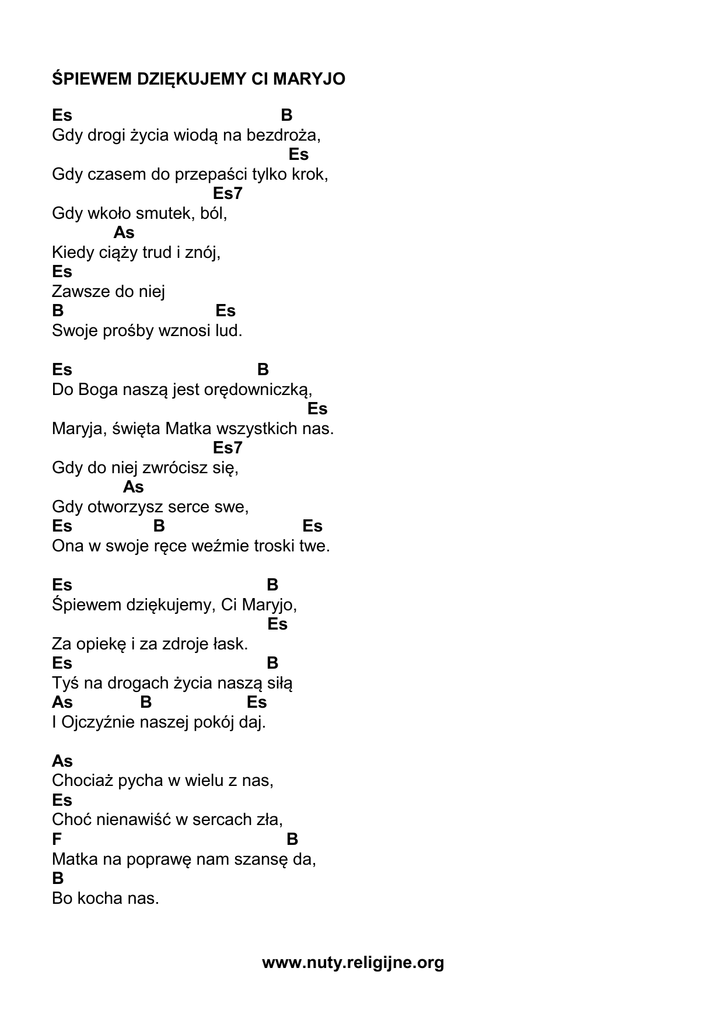 ŚPIEWEM DZIĘKUJEMY CI MARYJO Es B Gdy drogi życia wiodą na bezdroża, Es Gdy czasem do przepaści tylko krok, Es7 Gdy wkoło smutek, ból, As Kiedy ciąży trud i znój, Es Zawsze do niej B Es Swoje prośby wznosi lud. Es B Do Boga naszą jest orędowniczką, Es Maryja, święta Matka wszystkich nas. Es7 Gdy do niej zwrócisz się, As Gdy otworzysz serce swe, Es B Es Ona w swoje ręce weźmie troski twe. Es B Śpiewem dziękujemy, Ci Maryjo, Es Za opiekę i za zdroje łask. Es B Tyś na drogach życia naszą siłą As B Es I Ojczyźnie naszej pokój daj. As Chociaż pycha w wielu z nas, Es Choć nienawiść w sercach zła, F B Matka na poprawę nam szansę da, B Bo kocha nas. www.nuty.religijne.org Śpiewem dziękujemy, Ci Maryjo, Za opiekę i za zdroje łask. Do ciebie cały rok pielgrzymujemy, By w twoich sanktuariach modlić się. Tam przecież w każdy czas Z miłością witasz nas, Nasze modły niesiesz aż po Boży tron. Śpiewem dziękujemy, Ci Maryjo, Za opiekę i za zdroje łask. Tyś na drogach życia naszą siłą I Ojczyźnie naszej pokój daj. Chociaż pycha w wielu z nas, Choć nienawiść w sercach zła, Matka na poprawę nam szansę da, Bo kocha nas. Śpiewem dziękujemy, Ci Maryjo, Za opiekę i za zdroje łask. Chociaż pycha w wielu z nas, Choć nienawiść w sercach zła, Matka na poprawę nam szansę da, Bo kocha nas. Śpiewem dziękujemy, Ci Maryjo, Za opiekę i za zdroje łask. www.nuty.religijne.org