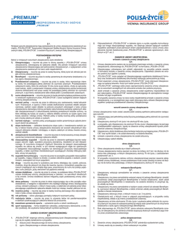 „PREMIUM” O G Ó L N E WA R U N K I U B E Z P I E C Z E N I A N A Ż YC I E I D O Ż YC I E „PREMIUM” § 1. Niniejsze warunki ubezpieczenia mają zastosowanie do umów ubezpieczenia zawieranych pomiędzy „POLISA-ŻYCIE” Towarzystwo Ubezpieczeń Spółka Akcyjna Vienna Insurance Group, zwanym dalej „POLISA-ŻYCIE”, a osobami fizycznymi, zwanymi dalej Ubezpieczającymi. POSTANOWIENIA WSTĘPNE § 2. Ilekroć w niniejszych warunkach ubezpieczenia użyto określenia: 1) Ubezpieczający – rozumie się przez to stronę zawartej z „POLISA-ŻYCIE” umowy ubezpieczenia, zobowiązaną do opłacania składki. Dla potrzeb niniejszych warunków ubezpieczenia Ubezpieczający jest jednocześnie Ubezpieczonym, z wyłączeniem umów ubezpieczenia zawieranych na rzecz osób niepełnoletnich; 2) Ubezpieczony – rozumie się przez to osobę fizyczną, której życie lub zdrowie jest objęte ochroną ubezpieczeniową; 3) Beneficjent – rozumie się przez to osobę uprawnioną do otrzymania świadczenia z tytułu zgonu Ubezpieczonego; 4) Przedstawiciel ustawowy – rozumie się przez to osobę, która reprezentuje interesy osoby nie posiadającej pełnej zdolności do czynności prawnych. Przedstawicielami ustawowymi osoby, która nie ukończyła 18 roku życia są jej rodzice, chyba ze sąd postanowił inaczej. Jeżeli z postanowień niniejszej umowy ubezpieczenia wynika konieczność złożenia oświadczenia woli przez osobę nie posiadającą pełnej zdolności do czynności prawnych, w jej imieniu oświadczenie takie składa jeden z przedstawicieli ustawowych; 5) suma ubezpieczenia – rozumie się przez to kwotę pieniężną będącą podstawą wymiaru świadczeń wypłacanych przez „POLISA-ŻYCIE” z tytułu wystąpienia zdarzeń objętych ochroną ubezpieczeniową; 6) wartość polisy – rozumie się przez to obliczoną przy zastosowaniu metod aktuarialnych i finansowych, w oparciu o które została skalkulowana wysokość składki ubezpieczeniowej, wartość części składek na pokrycie przyszłych zobowiązań z tytułu umowy ubezpieczenia stanowiącą różnicę pomiędzy zakumulowaną wartością wpłaconych składek ubezpieczeniowych a zakumulowaną wartością poniesionych kosztów ochrony, na które składają się koszty za ryzyko tj. należna składka ochronna za ryzyko zgonu oraz koszty zawarcia i obsługi umowy. Wartość polisy w każdą rocznicę polisy powiększana jest o kwotę zależną od udziału w zyskach; 7) wartość wykupu – wartość polisy, przysługująca osobie uprawnionej po upływie pierwszych dwóch lat polisowych; 8) stopa techniczna – zakładana teoretyczna stopa zysku z inwestowania wartości polisy w trakcie trwania umowy ubezpieczenia stosowana we wzorach aktuarialnych dotyczących obliczania składek i obniżająca, w stopniu zależnym od okresu trwania umowy, wartość składki; 9) ubezpieczenie bezskładkowe – rozumie się przez to kontynuowaną umowę ubezpieczenia bez konieczności dalszego opłacania składki; 10) nieszczęśliwy wypadek – rozumie się przez to zdarzenie spełniające łącznie następujące warunki: nagłe, wywołane przyczyną zewnętrzną, niezależne od woli Ubezpieczonego. W rozumieniu niniejszych Ogólnych Warunków do kategorii nieszczęśliwego wypadku nie zalicza się chorób, w tym również występujących nagle lub ujawnionych w następstwie nieszczęśliwego wypadku lub stanowiących przyczynę nieszczęśliwego wypadku, a także czynników chorobotwórczych wywołujących chorobę infekcyjną (bakterie, wirusy lub pasożyty); 11) wypadek komunikacyjny – rozumie się przez to szczególny przypadek nieszczęśliwego wypadku, mający miejsce na drodze, w postaci zderzenia pojazdu z osobami, przedmiotami, zwierzętami lub innym pojazdami; 12) droga – rozumie się przez to wydzielony pas terenu składający się z jezdni, pobocza, chodnika, drogi dla pieszych lub drogi dla rowerów, łącznie z torowiskiem pojazdów szynowych znajdującym się w obrębie tego pasa, przeznaczony do ruchu lub postoju pojazdów, ruchu pieszych, jazdy wierzchem lub pędzenia zwierząt; 13) umowa dodatkowa – rozumie się przez to umowę, na podstawie której „POLISA-ŻYCIE” udziela dodatkowej ochrony ubezpieczeniowej w zakresie i na warunkach określonych w tej umowie. Umowa dodatkowa stanowi integralną część podstawowej umowy ubezpieczenia; 14) okres polisowy – rozumie się przez to okres rozpoczynający się w dniu początku odpowiedzialności, a następnie w odpowiednim dniu każdego kolejnego okresu obowiązywania umowy; okresem polisowym, o którym mowa wyżej, w zależności od wybranej przez Ubezpieczającego częstotliwości opłacania składek może być miesiąc, kwartał, półrocze lub rok; 15) rocznica polisy – rozumie się przez to każdą rocznicę pierwszego dnia odpowiedzialności z tytułu umowy ubezpieczenia; 16) rok polisowy – okres upływający pomiędzy kolejnymi rocznicami polisy; 17) nadużycie leków – rozumie się przez to używanie leków lub parafarmaceutyków w dawkach przekraczających zalecenia lekarza lub producenta; 18) zawodowe uprawianie sportu – uprawianie sportu w celach zarobkowych; 19) sport wyczynowy – forma działalności człowieka, podejmowana dobrowolnie, w drodze rywalizacji, dla uzyskania maksymalnych wyników sportowych. ZAKRES OCHRONY UBEZPIECZENIOWEJ § 3. 1. „POLISA-ŻYCIE” obejmuje ochroną ubezpieczeniową życie Ubezpieczonego i zobowiązuje się do wypłaty świadczenia w przypadku: 1) dożycia przez Ubezpieczonego do końca okresu ubezpieczenia, 2) zgonu Ubezpieczonego w okresie ubezpieczenia. 2. Odpowiedzialność „POLISA-ŻYCIE” w zakresie zgonu w wyniku wypadku komunikacyjnego lub innego nieszczęśliwego wypadku, nie obejmuje zdarzeń będących wynikiem wypadków zaistniałych przed pierwszym dniem odpowiedzialności z tytułu umowy ubezpieczenia również świadczonej przez „POLISA-ŻYCIE” w zakresie ograniczonym, określonym 