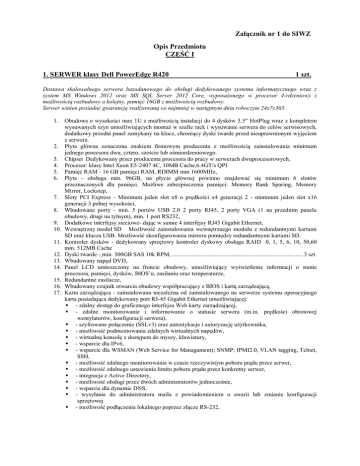Załącznik nr 1 do SIWZ Opis Przedmiotu CZĘŚĆ I 1. SERWER klasy Dell PowerEdge R420 1 szt. Dostawa skalowalnego serwera bazodanowego do obsługi dedykowanego systemu informatycznego wraz z system MS Windows 2012 oraz MS SQL Server 2012 Core, wyposażonego w procesor 4-rdzeniowy z możliwością rozbudowy o kolejny, pamięć 16GB z możliwością rozbudowy. Serwer winien posiadać gwarancję realizowaną co najmniej w następnym dniu roboczym 24x7x365. 1. 2. 3. 4. 5. 6. 7. 8. 9. 10. 11. 12. 13. 14. 15. 16. 17. Obudowa o wysokości max 1U z możliwością instalacji do 4 dysków 3.5" HotPlug wraz z kompletem wysuwanych szyn umożliwiających montaż w szafie rack i wysuwanie serwera do celów serwisowych, dodatkowy przedni panel zamykany na klucz, chroniący dyski twarde przed nieuprawnionym wyjęciem z serwera. Płyta główna oznaczona znakiem firmowym producenta z możliwością zainstalowania minimum jednego procesora dwu, cztero, sześcio lub ośmiordzeniowego. Chipset Dedykowany przez producenta procesora do pracy w serwerach dwuprocesorowych, Procesor: klasy Intel Xeon E5-2407 4C, 10MB Cache,6.4GT/s QPI Pamięć RAM - 16 GB pamięci RAM, RDIMM min 1600MHz, Płyta - obsługa min. 96GB, na płycie głównej powinno znajdować się minimum 6 slotów przeznaczonych dla pamięci. Możliwe zabezpieczenia pamięci: Memory Rank Sparing, Memory Mirror, Lockstep, Sloty PCI Express - Minimum jeden slot x8 o prędkości x4 generacji 2 - minimum jeden slot x16 generacji 3 pełnej wysokości, Wbudowane porty - min. 5 portów USB 2.0 2 porty RJ45, 2 porty VGA (1 na przednim panelu obudowy, drugi na tylnym), min. 1 port RS232, Dodatkowe interfejsy sieciowe- dając w sumie 4 interfejsy RJ45 Gigabit Ethernet, Wewnętrzny moduł SD Możliwość zainstalowania wewnętrznego modułu z redundantnymi kartami SD oraz klucza USB. Możliwość skonfigurowania mirroru pomiędzy redundantnymi kartami SD. Kontroler dysków - dedykowany sprzętowy kontroler dyskowy obsługa RAID 0, 1, 5, 6, 10, 50,60 min. 512MB Cache Dyski twarde - min. 300GB SAS 10k RPM, ...................................................................................... 3 szt. Wbudowany napęd DVD, Panel LCD umieszczony na froncie obudowy, umożliwiający wyświetlenie informacji o stanie procesora, pamięci, dysków, BIOS’u, zasilaniu oraz temperaturze, Redundantne zasilacze, Wbudowany czujnik otwarcia obudowy współpracujący z BIOS i kartą zarządzającą, Karta zarządzająca - zainstalowana niezależna od zainstalowanego na serwerze systemu operacyjnego karta posiadająca dedykowany port RJ-45 Gigabit Ethernet umożliwiającej: - zdalny dostęp do graficznego interfejsu Web karty zarządzającej, - zdalne monitorowanie i informowanie o statusie serwera (m.in. prędkości obrotowej wentylatorów, konfiguracji serwera), - szyfrowane połączenie (SSLv3) oraz autentykacje i autoryzację użytkownika, - możliwość podmontowania zdalnych wirtualnych napędów, - wirtualną konsolę z dostępem do myszy, klawiatury, - wsparcie dla IPv6, - wsparcie dla WSMAN (Web Service for Managament); SNMP; IPMI2.0, VLAN tagging, Telnet, SSH, - możliwość zdalnego monitorowania w czasie rzeczywistym poboru prądu przez serwer, - możliwość zdalnego ustawienia limitu poboru prądu przez konkretny serwer, - integracja z Active Directory, - możliwość obsługi przez dwóch administratorów jednocześnie, - wsparcie dla dynamic DNS, - wysyłanie do administratora maila z powiadomieniem o awarii lub zmianie konfiguracji sprzętowej - możliwość podłączenia lokalnego poprzez złącze RS-232, 18. 3 lata gwarancji producenta realizowanej w miejscu instalacji sprzętu, z czasem reakcji do następnego dnia roboczego od zgłoszenia, możliwość zgłaszania awarii w trybie 24x7x365, 19. System operacyjny - Windows Server 2012 Standard Edition, 20. MS SQL Server 2012 Standard Core – Odpowiednia ilość licencji na wszystkie rdzenie 2. SERWER klasy Dell PowerEdge R420 1 szt. Dostawa dwuprocesorowego serwera pod usługi oparte o systemy Linux 1. 2. 3. 4. 5. 6. 7. 8. 9. 10. 11. 12. 13. 14. 15. 16. Obudowa o wysokości max 1U z możliwością instalacji do 4 dysków 3.5" HotPlug wraz z kompletem wysuwanych szyn umożliwiających montaż w szafie rack i wysuwanie serwera do celów serwisowych, dodatkowy przedni panel zamykany na klucz, chroniący dyski twarde przed nieuprawnionym wyjęciem z serwera., Płyta główna oznaczona znakiem firmowym producenta z możliwością zainstalowania minimum jednego procesora dwu, cztero, sześcio lub ośmiordzeniowego. Dwa Procesory: klasy Intel Xeon E5-2407 4C, 10MB Cache,6.4GT/s QPI 32 GB pamięci RAM, RDIMM min 1600MHz, Płyta - obsługa min. 96GB, na płycie głównej powinno znajdować się minimum 6 slotów przeznaczonych dla pamięci. Możliwe zabezpieczenia pamięci: Memory Rank Sparing, Memory Mirror, Lockstep, Sloty PCI Express - Minimum jeden slot x8 o prędkości x4 generacji 2 - minimum jeden slot x16 generacji 3 pełnej wysokości, Wbudowane porty - min. 5 portów USB 2.0, 2 porty RJ45, 2 porty VGA (1 na przednim panelu obudowy, drugi na tylnym), min. 1 port RS232, Dodatkowe interfejsy sieciowe- dając w sumie 4 interfejsy RJ45 Gigabit Ethernet, Wewnętrzny moduł SD Możliwość zainstalowania wewnętrznego modułu z redundantnymi kartami SD oraz klucza USB. Możliwość skonfigurowania mirroru pomiędzy redundantnymi kartami SD. Kontroler dysków - dedykowany sprzętowy kontroler dyskowy obsługa RAID 0, 1, 5, 6, 10, 50,60 min. 512MB Cache Dyski twarde - min. 600GB SAS 10k RPM, ...................................................................................... 4 szt. Wbudowany napęd DVD, Panel LCD umieszczony na froncie obudowy, umożliwiający wyświetlenie informacji o stanie procesora, pamięci, dysków, BIOS’u, zasilaniu oraz temperaturze, Redundantne zasilacze, Wbudowany czujnik otwarcia obudowy współpracujący z BIOS i kartą zarządzającą, Karta zarządzająca - zainstalowana niezale