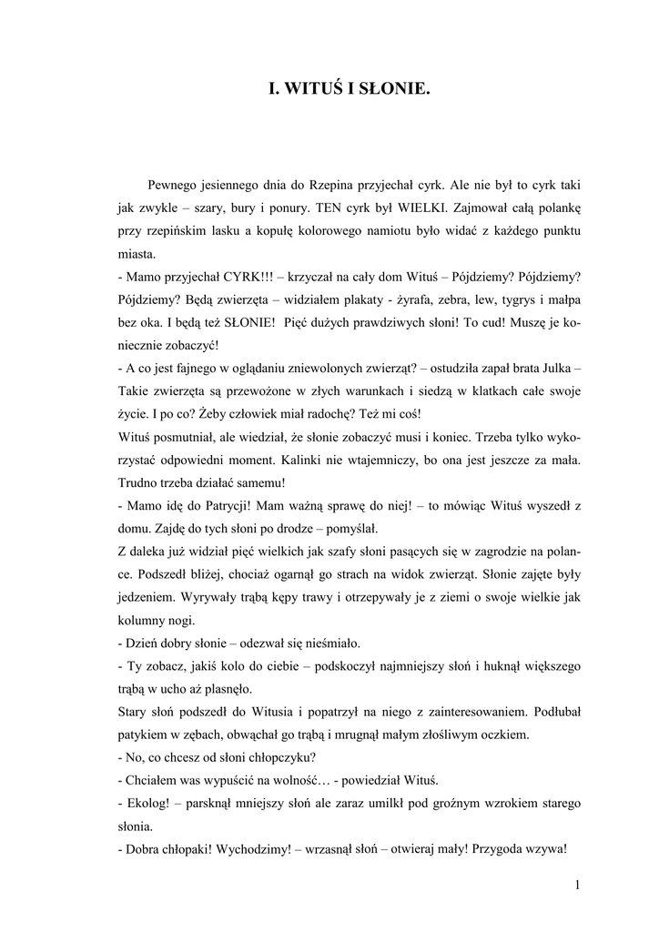 I. WITUŚ I SŁONIE. Pewnego jesiennego dnia do Rzepina przyjechał cyrk. Ale nie był to cyrk taki jak zwykle – szary, bury i ponury. TEN cyrk był WIELKI. Zajmował całą polankę przy rzepińskim lasku a kopułę kolorowego namiotu było widać z każdego punktu miasta. - Mamo przyjechał CYRK!!! – krzyczał na cały dom Wituś – Pójdziemy? Pójdziemy? Pójdziemy? Będą zwierzęta – widziałem plakaty - żyrafa, zebra, lew, tygrys i małpa bez oka. I będą też SŁONIE! Pięć dużych prawdziwych słoni! To cud! Muszę je koniecznie zobaczyć! - A co jest fajnego w oglądaniu zniewolonych zwierząt? – ostudziła zapał brata Julka – Takie zwierzęta są przewożone w złych warunkach i siedzą w klatkach całe swoje życie. I po co? Żeby człowiek miał radochę? Też mi coś! Wituś posmutniał, ale wiedział, że słonie zobaczyć musi i koniec. Trzeba tylko wykorzystać odpowiedni moment. Kalinki nie wtajemniczy, bo ona jest jeszcze za mała. Trudno trzeba działać samemu! - Mamo idę do Patrycji! Mam ważną sprawę do niej! – to mówiąc Wituś wyszedł z domu. Zajdę do tych słoni po drodze – pomyślał. Z daleka już widział pięć wielkich jak szafy słoni pasących się w zagrodzie na polance. Podszedł bliżej, chociaż ogarnął go strach na widok zwierząt. Słonie zajęte były jedzeniem. Wyrywały trąbą kępy trawy i otrzepywały je z ziemi o swoje wielkie jak kolumny nogi. - Dzień dobry słonie – odezwał się nieśmiało. - Ty zobacz, jakiś kolo do ciebie – podskoczył najmniejszy słoń i huknął większego trąbą w ucho aż plasnęło. Stary słoń podszedł do Witusia i popatrzył na niego z zainteresowaniem. Podłubał patykiem w zębach, obwąchał go trąbą i mrugnął małym złośliwym oczkiem. - No, co chcesz od słoni chłopczyku? - Chciałem was wypuścić na wolność… - powiedział Wituś. - Ekolog! – parsknął mniejszy słoń ale zaraz umilkł pod groźnym wzrokiem starego słonia. - Dobra chłopaki! Wychodzimy! – wrzasnął słoń – otwieraj mały! Przygoda wzywa! 1 Wszystkie słonie ustawiły się jeden za drugim trzymając się trąbami za ogony. Stary olbrzym wychodząc z zagrody posadził sobie Witusia na grzbiet. - Jak masz na imię chłopaku? – zapytał - Wituś, a ty słoniu? - Ja się nazywam Elefant – powiedział słoń. – No to prowadź, gdzie idziemy? - Na sawannę! - Dobra, może być. A gdzie to jest? - No przecież w Afryce! – zdziwił się Wituś. – na takiej sawannie jest wszystko czego słonie potrzebują do życia! -O! To idziemy, idziemy! – ponaglił swoich towarzyszy Elefant. - Pójdziemy najpierw w dół tą ulicą koło kościółka – wskazał Wituś – a później pokażę wam gdzie pracuje moja mama. - A ja nie mam mamusi – chlipnął mniejszy słoń. Wituś pomyślał sobie, że to straszne nie mieć mamusi i zrobiło mu się żal słonika, ale zaraz o tym zapomniał, bo właśnie dochodzili do żółtego budynku, w którym pracowała mama. Przed nim kwitły pachnące róże i rozciągał się trawnik. - Postój! – zawołał Elefant – czas na małą przekąskę! Słonie zabrały się ochoczo do skubania soczystej trawki (na drugi dzień kierownik mamusi, pan Robert przecierał oczy ze zdumienia i cały dzień zastanawiał się, kto tak ładnie skosił trawę). Po posiłku słoniowy korowód ruszył dalej. Jeden ze słoni przemycił kilka róż i włożył je sobie za ucho. - Teraz pójdziemy koło szkoły mojej siostry Julki – powiedział Wituś i wskazał na duży, piękny budynek otoczony starymi platanami. - A czemu te drzewa mają zdartą korę? – zapytał ciekawie mały słonik – czy tędy przechodziły już jakieś inne słonie i ją zżarły? Wituś wyjaśnił mu, że te drzewa zawsze tak wyglądały, a innych słoni w Rzepinie nigdy nie było, przynajmniej on nie pamięta. - O! A tutaj można zjeść bardzo dobrą pizzę – pokazał paluszkiem na budynek restauracji. Zwierzęta ożywiły się na te słowa i nawet padła propozycja zakupienia pizzy wegetariańskiej na wynos, ale nic z tego nie wyszło, bo żaden ze słoni nie miał przy sobie gotówki. Poszli dalej przez Stare Miasto, ale słonie wyraźnie zaczęły tracić cierpliwość. Marudziły i grymasiły, że ta sawanna jest jednak za daleko. I kto im tam będzie przygoto2 wywał jedzenie i drapał za uszami oraz prał kostiumy cyrkowe. A oprócz tego stwierdziły, że są bardzo głodne i spragnione. Wituś pocieszał je, że niedaleko jest rzeka i będą mogły się ochlapać i napić przed dalszą drogą. Doszli do rzeki i słonie pognały żeby ugasić pragnienie, ale niestety woda nie nadawała się do picia, była brudna i śmierdząca a zawiedzione słonie spluwały z obrzydzeniem. Z coraz większą niechęcią poszły dalej, a jeden ze słoni powiedział, że już dalej nie pójdzie choćby nie wiem co, ale szybko dogonił pozostałe, bo przestraszył się małego ujadającego głośno psa. Wituś był zmartwiony postawą słoni. Pomyślał, że jak tak dalej pójdzie to nigdy nie dotrą na sawannę i słonie nie będą ani szczęśliwe ani wolne. Przez całe swoje życie będą siedzieć w klatkach w złych warunkach, tak jak powiedziała Julka. Stary słoń zatrzymał się nagle zdumiony, wskazał trąbą i zapytał – A co to jest? Wszystkie słonie wyjrzały zza niego ciekawie i uśmiechy rozjaśniły ich twarze. Pognały na złamanie karku w stronę wskazaną przez starego słonia. - Co to jest? – powtórzył pytanie Elefant. - Ulica – Wituś nie wiedział, o co chodzi słoniowi. - A to okrągłe na ulicy? – dopytywał się słoń. - To jest rondo! - Wygląda jak arena cyrkowa – wzruszył się stary Elefant, a w jego małych oczkach zabłysły łzy. Wszystkie słonie chwyciły się za ogony i zrobiły kilka szybkich rundek naokoło ronda. Witusiowi od tej szaleńczej jazdy zakręciło się w głowie, ale słonie wyglądały na zadowolone. Jeden ze słoni stanął na jednej