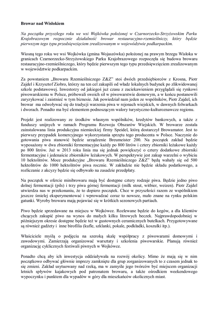 Browar nad Wisłokiem Na początku przyszłego roku we wsi Wojkówka położonej w Czarnorzecko-Strzyżowskim Parku Krajobrazowym rozpocznie działalność browar restauracyjno-rzemieślniczy, który będzie pierwszym tego typu przedsięwzięciem zrealizowanym w województwie podkarpackim. Wiosną tego roku we wsi Wojkówka (gmina Wojaszówka) położonej na prawym brzegu Wisłoka w granicach Czarnorzecko-Strzyżowskiego Parku Krajobrazowego rozpoczęła się budowa browaru restauracyjno-rzemieślniczego, który będzie pierwszym tego typu przedsięwzięciem zrealizowanym w województwie podkarpackim. Za powstaniem „Browaru Rzemieślniczego Z&Z” stoi dwóch przedsiębiorców z Krosna, Piotr Zajdel i Krzysztof Ziobro, którzy na ten cel zakupili od władz lokalnych budynek po zlikwidowanej szkole podstawowej. Inwestorzy od jakiegoś już czasu z zaciekawieniem przyglądali się rynkowi piwowarskiemu w Polsce, próbowali swoich sił w piwowarstwie domowym, a w końcu postanowili zaryzykować i zaistnieć w tym biznesie. Jak powiedział nam jeden ze wspólników, Piotr Zajdel, ich browar ma odwoływać się do tradycji warzenia piwa w rejonach wiejskich, w dawnych folwarkach i dworach. Ponadto ma być elementem podnoszącym walory turystyczno-kulturoznawcze regionu. Projekt jest realizowany ze środków własnym wspólników, kredytów bankowych, a także z funduszy unijnych w ramach Programu Rozwoju Obszarów Wiejskich. W browarze została zainstalowana linia produkcyjna niemieckiej firmy Speidel, którą dostarczył Browamator. Jest to pierwszy przypadek komercyjnego wykorzystania sprzętu tego producenta w Polsce. Naczynie do gotowania piwa stanowić będzie urządzenie Breumeister 200. Na początek zakład będzie wyposażony w dwa zbiorniki fermentacyjne każdy po 800 litrów i cztery zbiorniki leżakowe każdy po 800 litrów. Już w 2013 roku linia ma się jednak powiększyć o cztery dodatkowe zbiorniki fermentacyjne i jedenaście zbiorników leżakowych. W perspektywie jest zakup warzelni o wybiciu 10 hektolitrów. Moce produkcyjne „Browaru Rzemieślniczego Z&Z” będą wahały się od 500 hektolitrów do 1000 hektolitrów piwa rocznie. W zakładzie nie będzie składu podatkowego, a rozliczanie z akcyzy będzie się odbywało na zasadzie przedpłaty. Na początek w ofercie minibrowaru mają być dostępne cztery rodzaje piwa. Będzie jedno piwo dolnej fermentacji (pils) i trzy piwa górnej fermentacji (milk stout, witbier, weizen). Piotr Zajdel utwierdza nas w przekonaniu, że to dopiero początek. Chce w przyszłości razem ze wspólnikiem jeszcze śmielej eksperymentować i wprowadzać coraz to nowsze, mało znane na rynku polskim gatunki. Wyroby browaru mają pojawiać się w krótkich sezonowych partiach. Piwo będzie sprzedawane na miejscu w Wojkówce. Rozlewane będzie do kegów, a dla klientów chcących zakupić piwo na wynos do małych kilku litrowych beczek. Najprawdopodobniej w późniejszym okresie dostępne będzie też w gustownych ceramicznych butelkach. Przygotowywane są również gadżety i inne birofilia (kufle, szklanki, pokale, podkładki, koszulki itp.). Właściciele myślą o podjęciu na szeroką skalę współpracy z piwowarami domowymi i zawodowymi. Zamierzają organizować warsztaty i szkolenia piwowarskie. Planują również organizację cyklicznych festiwali piwnych w Wojkówce. Ponadto chcą aby ich inwestycja oddziaływała na rozwój okolicy. Mimo że mają się w nim początkowo odbywać głównie imprezy zamknięte dla grup zorganizowanych to z czasem jednak to się zmieni. Zakład usytuowany nad rzeką, ma w zamyśle jego twórców być miejscem organizacji letnich spływów kajakowych pod patronatem browaru, a także ośrodkiem weekendowego wypoczynku i punktem dla wypadów w góry dla mieszkańców okolicznych miast.