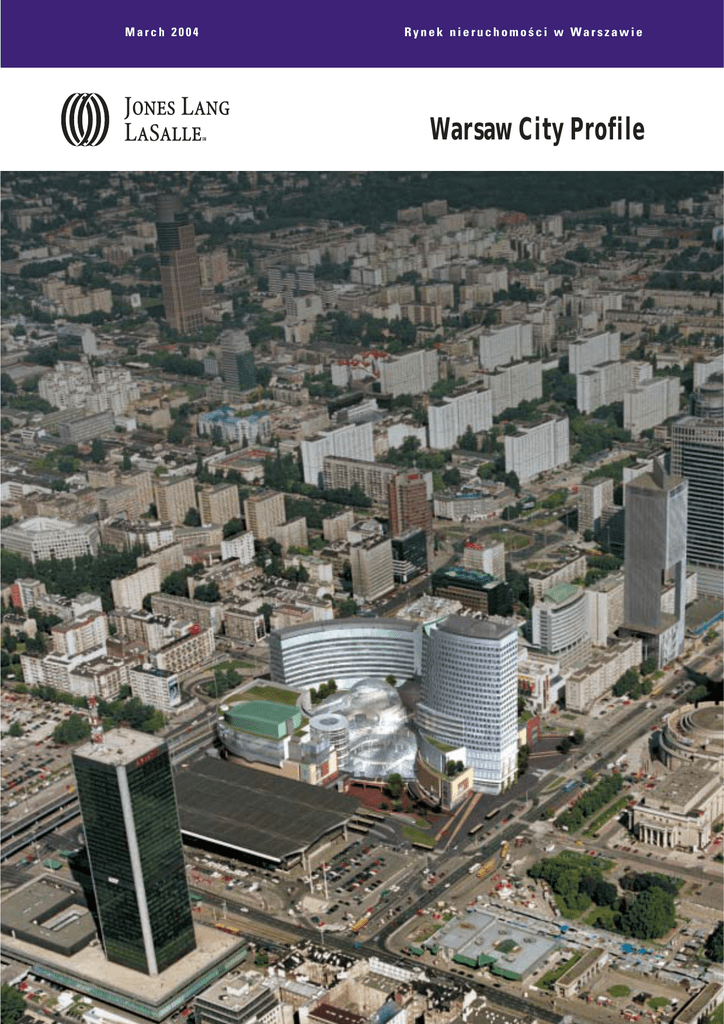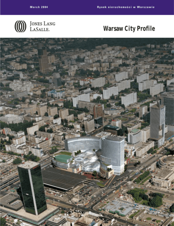 March 2004 Rynek nieruchomoÊci w Warszawie Warsaw City Profile Rynek nieruchomoÊci w Warszawie Contents Spis tre’sci Economy Ekonomia 4 Industrial Market Rynek powierzchni magazynowych 7 Office Market Rynek powierzchni biurowych 5 Investment Market Rynek inwestycyjny 8 Retail Market Rynek powierzchni handlowych 6 Investment Market Regional Overview Rynek inwestycyjny – charakterystyka regionu 9 Dear Reader, Szanowni Paƒstwo, We have pleasure in presenting the 13th edition of the Warsaw City Profile. Mamy przyjemnoÊç przedstawiç Paƒstwu trzynaste wydanie raportu Warszawski Rynek NieruchomoÊci. 2003 saw another challenging year for the office market with similar levels of take up to 2002, and continuing pressure on net effective rental levels. However due to restricted construction activity, vacancy rates have fallen, and the outlook for the market in the next 12 months is more positive. We believe that this will be a big year for retail with two major centres opening in Warsaw, an active year for warehouse / logistics with increased developer and investor interest in this sector and a year where we should see some stability in the office market with demand and supply being more in line and rental levels finding a sustainable level. The investment market witnessed a major surge, particularly in the retail sector and we expect this trend to continue through 2004 with continued interest from the large German and Austrian funds and increased activity from the private investors. As we near the 1st May 2004, the date for EU accession, there is a firm belief in the future growth prospects of the real estate sector that should be strengthened by the improving Polish economy. We look forward to another interesting year in the Warsaw real estate market. Rok 2003 by∏ kolejnym interesujàcym rokiem na rynku powierzchni biurowych. WielkoÊç wynaj´tej powierzchni by∏a zbli˝ona do poziomu najmu z roku 2002. Nastàpi∏ dalszy spadek efektywnego poziomu czynszów. Ze wzgl´du na ograniczonà dzia∏alnoÊç deweloperskà wspó∏czynnik powierzchni niewynaj´tych obni˝y∏ si´ i prognozy rynkowe na kolejne 12 miesi´cy sà bardziej optymistyczne. Wierzymy, ˝e ten rok b´dzie znaczàcy równie˝ dla rynku powierzchni handlowych, ze wzgl´du na otwarcie dwóch du˝ych centrów handlowych w Warszawie. Oczekuje si´ te˝ wzrostu zainteresowania sektorem powierzchni magazynowych / logistycznych wÊród deweloperów i inwestorów. B´dzie to rok, w którym powinniÊmy zaobserwowaç stabilizacj´ na rynku powierzchni biurowych, z bardziej zrównowa˝onym popytem i poda˝à oraz stabilizujàcymi si´ stawkami czynszu. Na rynku inwestycyjnym zanotowano gwa∏towny wzrost, szczególnie w sektorze powierzchni handlowych. Oczekuje si´, ˝e taka tendencja utrzyma si´ w roku 2004, któremu towarzyszyç b´dzie zainteresowanie ze strony du˝ych funduszy niemieckich i austriackich oraz zwi´kszona aktywnoÊç prywatnych inwestorów. W zwiàzku ze zbli˝ajàcym si´ 1 maja 2004, dniem akcesji do Unii Europejskiej, panuje silne przekonanie, ˝e nastàpi wzrost na rynku nieruchomoÊci wsparty poprawiajàcà si´ sytuacjà gospodarczà Polski. Oczekujemy kolejnego ciekawego roku na rynku nieruchomoÊci w Warszawie. Ben Bannatyne Ben Bannatyne Managing Director, Central Europe Dyrektor Zarzàdzajàcy, Europa Centralna 3 Rynek nieruchomoÊci w Warszawie Economy Ekonomia Sytuacja polityczna • At the beginning of 2004, for the first time since the last general election, the SLD has lost its place at the top of the political opinion polls, scoring 17% according to a poll carried out by Rzeczpospolita. • New members of the Monetary Policy Council have been chosen. Experts estimate that the new Council will be an advocate of a looser monetary policy than that presently pursued, but its decisions should be restrained and not threatening to the economy. • Na poczàtku 2004 roku, po raz pierwszy od ostatnich wyborów parlamentarnych, SLD straci∏o pierwsze miejsce w sonda˝ach opinii spo∏ecznej, wg raportu Rzeczpospolitej. • Wybrano nowych cz∏onków Rady Polityki Pieni´˝nej. Zdaniem ekspertów, nowa Rada b´dzie sprzyjaç mniej restrykcyjnej polityce monetarnej ni˝ obecna, jednak˝e jej decyzje nie powinny znaczàco zagroziç rozwojowi gospodarki. GDP Growth & Inflation Net Foreign Direct Investment Prospect (% of GDP) 6 12 5 10 4 8 3 6 2 4 1 2 12 10 8 Inflation % / Inflacja % GDP Growth % / Wzrost PKB % Political climate 6 4 2 0 -2 0 0 2000 2001 2002 GDP (LHS) *estimates /dane szacunkowe 2003* 2004** 1998 2005** 2001 Czech 2002 2003 2004* Russia Source/èród∏o: Consensus Forecasts, July 2003 Prognozy bezpoÊrednich inwestycji zagranicznych (% PKB) Wzrost PKB / Inflacja • The Polish economy gave clear signals of improving at the end of last year. Business activity is accelerating, inflation has slightly increased (0.8% in December), and the state revenue is increasing. Consensus forecasts estimate GDP growth at 3.6% in 2003 and predicting 4.6% for this year. Low interest rates (5.25%) and growing business confidence are expected to encourage investment. • Expecting membership of the EU due in May 2004 reduced financial risks and improved the attractiveness of foreign investments. FDI forecasts for Poland accounts for 2.6% of GDP in 2003 and are expected to increase to 2.9% in 2004. • Despite positive economic trends, there are still serious issues to be resolved. Poland’s Finance Ministry has announced that the 2003 budget deficit amounted to PLN37 bn (EUR8.4 bn), 4.9% of GDP. Economists are concerned at this high level, as it is not much lower than the previous year’s 5.1%. •The unemployment rate in Poland is still high at 20% in December 2003. 2000 Hungary *forecast/prognoza **forecast / prognoza Source/èród∏o: GUS, Consensus Forecasts National economy 1999 Poland Inflation (RHS) Sytuacja gospodarcza • Koniec 2003 r. przyniós∏ oznaki umacniania si´ sprzyjajàcych tren