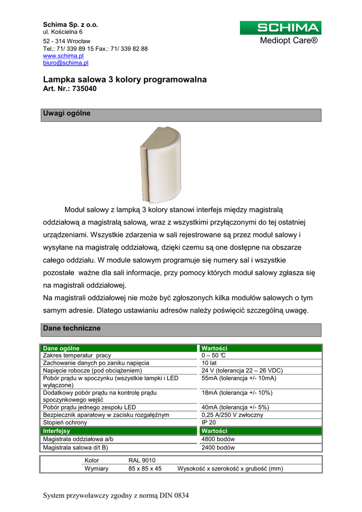 Schima Sp. z o.o. ul. Kościelna 6 Mediopt Care® 52 - 314 Wrocław Tel.: 71/ 339 89 15 Fax.: 71/ 339 82 88 www.schima.pl [email protected] Lampka salowa 3 kolory programowalna Art. Nr.: 735040 Uwagi ogólne Moduł salowy z lampką 3 kolory stanowi interfejs między magistralą oddziałową a magistralą salową, wraz z wszystkimi przyłączonymi do tej ostatniej urządzeniami. Wszystkie zdarzenia w sali rejestrowane są przez moduł salowy i wysyłane na magistralę oddziałową, dzięki czemu są one dostępne na obszarze całego oddziału. W module salowym programuje się numery sal i wszystkie pozostałe ważne dla sali informacje, przy pomocy których moduł salowy zgłasza się na magistrali oddziałowej. Na magistrali oddziałowej nie może być zgłoszonych kilka modułów salowych o tym samym adresie. Dlatego ustawianiu adresów należy poświęcić szczególną uwagę. Dane techniczne Dane ogólne Zakres temperatur pracy Zachowanie danych po zaniku napięcia Napięcie robocze (pod obciążeniem) Pobór prądu w spoczynku (wszystkie lampki i LED wyłączone) Dodatkowy pobór prądu na kontrolę prądu spoczynkowego wejść Pobór prądu jednego zespołu LED Bezpiecznik aparatowy w zacisku rozgałęźnym Stopień ochrony Interfejsy Magistrala oddziałowa a/b Magistrala salowa d/t B) Kolor Wymiary RAL 9010 85 x 85 x 45 Wartości 0 – 50 °C 10 lat 24 V (tolerancja 22 – 26 VDC) 55mA (tolerancja +/- 10mA) 18mA (tolerancja +/- 10%) 40mA (tolerancja +/- 5%) 0,25 A/250 V zwłoczny IP 20 Wartości 4800 bodów 2400 bodów Wysokość x szerokość x grubość (mm) System przywoławczy zgodny z normą DIN 0834 Mediopt Care® Okablowanie • magistrala korytarzowa: - przyłączamy tylko magistralę danych (a, b) i zasilanie: +24V, GND, Sugerowane przewody: - YTKSY 3x2x0,8mm ( 2 wolne) – długość magistrali 100m. - YTKSY 2x2x0,5mm ( 2 wolne) + YDY 2x1,5mm2 - długość magistrali ponad 100m. • magistrala salowa: - przyłączamy zasilanie: +24V, GND i dane d, t Sugerowane przewody: - YTKSY 3x2x0,5mm ( 2 wolne) System przywoławczy zgodny z normą DIN 0834 2 Mediopt Care® Adresowanie łączników Łącznik DIL S1 Nr 1-7: Adres modułu salowego na magistrali oddziałowej (ustawienie fabryczne 17=ON) 0 6 Liczba binarna 0-127 (1≅2 ....7≅2 ) ON=0, OFF=1 (Tabela łączników DIL patrz str. 95) Na każdą salę są do dyspozycji tylko adresy 0-99. Łącznik DIL S2 Nr 1-4: Grupowa lampa sygnalizacyjna: wszystkie moduły salowe o takim samym ustawionym tu adresie = liczba binarna (0-15) tworzą obszar takiej samej sygnalizacji zbiorczej na grupowych lampach sygnalizacyjnych. Grupowe lampy sygnalizacyjne należy przyłączyć do magistrali salowej. Ustawienia dokonuje się analogicznie do adresów sal (patrz tabela na ostatniej stronie). Nr 8 nieużywany ON: ustawienie fabryczne, proszę nie zmieniać Jeśli nie zamierza się tworzyć grup, to należy pozostawić ustawienie fabryczne łączników DIL = adres 0 (1-4 na ON). Nr 5 jeśli funkcja wezwania z WC Nr 7=ON: kasowanie wezwania WC ON: Kasowanie wezwania z WC możliwe tylko przyciskiem odwoławczym WC (ustawienie fabryczne) OFF możliwe także przyciskiem obecności personelu Nr 6 jeśli funkcja wezwania z WC Nr 7=ON → kasowanie przypomnienia ON: Kasowanie przypomnienia możliwe tylko przyciskiem odwoławczym/obecności siostry (ustawienie fabryczne) OFF Kasowanie przypomnienia możliwe zarówno przyciskiem odwoławczym/obecności siostry, jak i przyciskiem kasującym WC. Zalecenie: położenie OFF Nr 7 ON: funkcja wezwania z WC ZAŁ →wybrać to ustawienie (ustawienie fabryczne) OFF: nie zajęty Nr 8 nieużywany ON: ustawienie fabryczne, nie zmieniać System przywoławczy zgodny z normą DIN 0834 3 Mediopt Care® System przywoławczy zgodny z normą DIN 0834 4