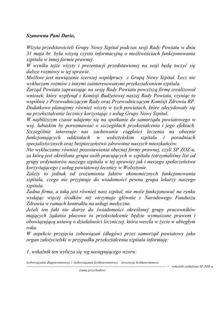 Szanowna Pani Dario, Wizyta przedstawicieli Grupy Nowy Szpital podczas sesji Rady Powiatu w dniu 31 maja br. była wizytą czysto informacyjną o możliwościach funkcjonowania szpitala w innej formie prawnej. W wyniku tejże wizyty i prezentacji przedstawionej na sesji będą toczyć się dalsze rozmowy w tej sprawie. Możliwe jest nawiązanie szerszej współpracy z Grupą Nowy Szpital. Lecz nie wykluczam rozmów z innymi zainteresowanymi przekształceniem szpitala. Zarząd Powiatu zapraszając na sesję Rady Powiatu powyższą firmę zrealizował wniosek, który wypłynął z Komisji Budżetowej naszej Rady Powiatu, czyniąc to wspólnie z Przewodniczącym Rady oraz Przewodniczącym Komisji Zdrowia RP. Dodatkowo planujemy również wizyty w tych powiatach, które zdecydowały się na przekształcenie lecznicy korzystając z usług Grupy Nowy Szpital. W najbliższym czasie udajemy się na spotkanie do samorządu powiatowego w woj. lubuskim by porozmawiać o szczegółach przekształcenia i jego efektach. Szczególnie interesuje nas zachowanie ciągłości leczenia na obecnie funkcjonujących oddziałach w wolsztyńskim szpitalu i poradniach specjalistycznych oraz bezpieczeństwo zdrowotne naszych mieszkańców. Nie wykluczamy również pozostawienia obecnej formy prawnej, czyli SP ZOZ-u, za którą jest określona grupa osób pracujących w szpitalu (otrzymaliśmy list od grupy ordynatorów naszego szpitala w tej sprawie) jak i naszego społeczeństwa korzystającego z usług powiatowej lecznicy w Wolsztynie. Zależy to jednak od zrozumienia faktów ekonomicznych funkcjonowania szpitala, czego nie przyjmuje do wiadomości pewna grupa lekarzy naszego szpitala. Żadna firma, a taką jest również nasz szpital, nie może funkcjonować na rynku wydając więcej środków niż otrzymuje głównie z Narodowego Funduszu Zdrowia w ramach kontraktu na usługi medyczne. Jeżeli ten fakt nie dotrze do świadomości określonej grupy pracowników mających żądania płacowe to przekształcenie będzie wymuszone prawem i obowiązującą ustawą o działalności leczniczej, która weszła w życie w ubiegłym roku. W aspekcie przejęcia zobowiązań (długów) przez samorząd powiatowy jako organ założycielski w przypadku przekształcenia szpitala informuję: 1. wskaźnik ten wylicza się wg następującego wzoru: (zobowiązania długoterminowe) + (zobowiązania krótkoterminowe) – inwestycje krótkoterminowe ----------------------------------------------------------------------------------------------------------------------------- = wskaźnik zasłużenia SP ZOZ-u (suma przychodów) W przypadku naszej lecznicy powiatowej wygląda to następująco: 2.06.114 + 5.107.271 – 1.246.984 -------------------------------------------------------- = 0,19 31.233.256 Wszystkie dane liczbowe z rachunku zysków i strat na dzień 31 grudnia 2011 r. otrzymane z księgowości szpitala. Wskaźnik ten jak widać jest dużo niższy niż 0,5 czyli samorząd powiatowy nie ma obowiązku przejmowania zobowiązań SP ZOZ-u w momencie jego przekształcenia. W załączeniu przesyłam Pani dwa wycinki z Nr 78 „Gazety Prawnej” z dnia 20 – 22 kwietnia br. mówiące o wyliczeniach wskaźnika zadłużenia. Reasumując moją odpowiedź na otrzymaną od Pani wiadomość drogą elektroniczną pragnę dodać, iż przekształcenie szpitala w inną formę prawną nie jest panaceum na poprawę kondycji ekonomicznej szpitala. Sama zmiana formy prawnej nie zmieni sytuacji. Dlatego też jesienią ubiegłego roku powołano Zespół ds. funkcjonowania szpitala, który wypracował wnioski do wdrożenia bez przekształcenia szpitala. Niestety nie wszystkie z nich znajdują zrozumienie wśród grupy pracowników szpitala. Jeżeli zmieni się nastawienie określonych osób do wprowadzenia niezbędnych zmian w zakresie sytuacji ekonomicznej szpitala, która na obecną chwilę, czyli koniec kwietnia br. nie jest taka zła, to przekształcenia można zaniechać. Ale wymaga to zrozumienia sytuacji i zaniechania działań szkodzących naszej lecznicy w oczach społeczeństwa korzystającego z jej usług. Takimi działaniami są np.: list otwarty do Rady Powiatu podpisany przez czterech lekarzy uzurpujących sobie prawo do reprezentowania wszystkich członków Związku Zawodowego Lekarzy zrzeszającego ponad 20 osób. List ten został odczytana podczas Sesji Rady Powiatu w dniu 31 maja 2012 r. oraz ukazał się w lokalnych mediach (Dzień Wolsztyński z dn. 12.06 br. oraz Głos Wolsztyński z dn. 13.06 br.). Zawiera on wiele nieprawdziwych stwierdzeń i pomówień w stosunku do wybranych osób reprezentujących samorząd powiatowy w różnych jego władzach, w tym również w stosunku do mojej osoby. Lecz o tym być może będzie okazja porozmawiać lub napisać w innym czasie. I już na zakończenie dziękuję Pani za zainteresowanie tematem funkcjonowania naszego szpitala, licząc na dalszą konstruktywną i rzeczową dyskusję w tej materii. Z poważaniem Starosta Wolsztyński /-/ Ryszard Kurp