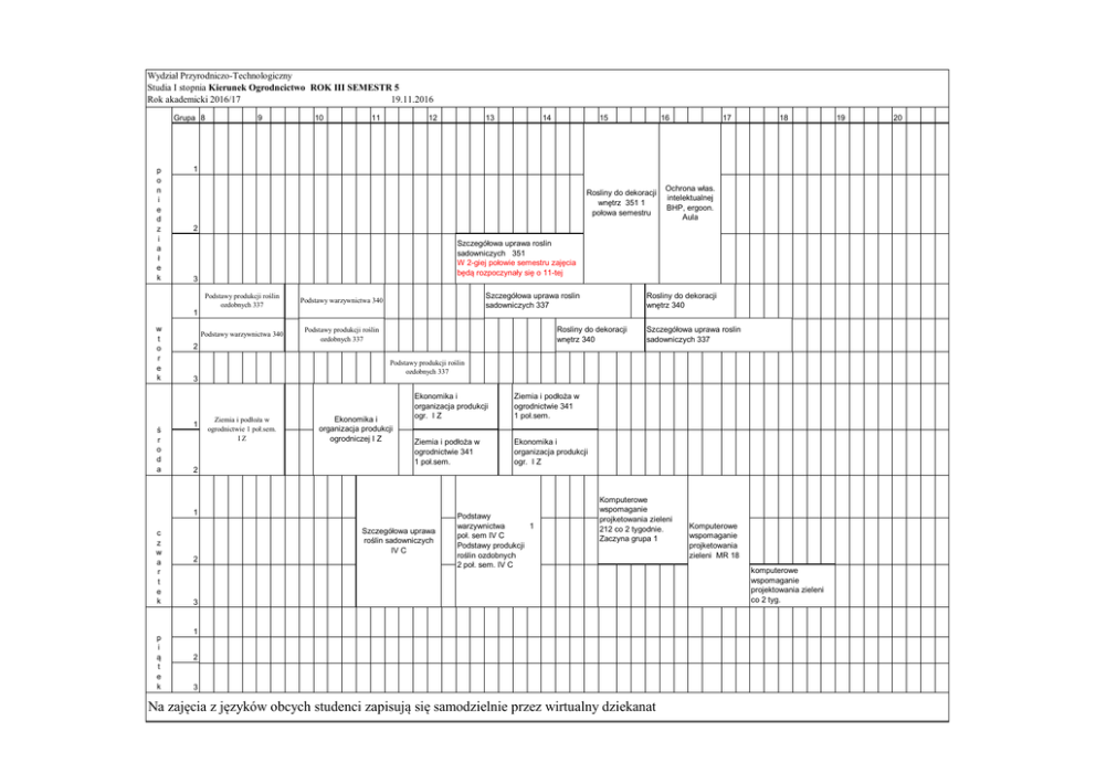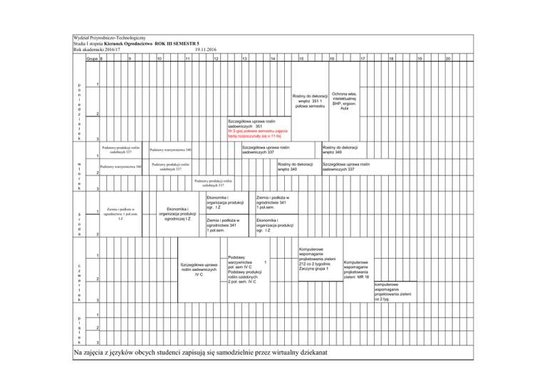 Wydział Przyrodniczo-Technologiczny Studia I stopnia Kierunek Ogrodncictwo ROK III SEMESTR 5 Rok akademicki 2016/17 19.11.2016 Grupa 8 p o n i e d z i a ł e k 9 10 11 12 13 14 15 16 17 18 1 Rosliny do dekoracji wnętrz 351 1 połowa semestru Ochrona włas. intelektualnej BHP, ergoon. Aula 2 Szczegółowa uprawa roslin sadowniczych 351 W 2-giej połowie semestru zajęcia będą rozpoczynały się o 11-tej 3 Podstawy produkcji roślin ozdobnych 337 Podstawy warzywnictwa 340 Podstawy warzywnictwa 340 Podstawy produkcji roślin ozdobnych 337 Szczegółowa uprawa roslin sadowniczych 337 Rosliny do dekoracji wnętrz 340 1 w t o r e k ś r o d a Rosliny do dekoracji wnętrz 340 2 Podstawy produkcji roślin ozdobnych 337 3 1 Ziemia i podłoża w ogrodnictwie 1 poł.sem. IZ Ekonomika i organizacja produkcji ogrodniczej I Z Ekonomika i organizacja produkcji ogr. I Z Ziemia i podłoża w ogrodnictwie 341 1 poł.sem. Ziemia i podłoża w ogrodnictwie 341 1 poł.sem. Ekonomika i organizacja produkcji ogr. I Z 2 1 c z w a r t e k p i ą t e k Szczegółowa uprawa roslin sadowniczych 337 Szczegółowa uprawa roślin sadowniczych IV C 2 Podstawy warzywnictwa 1 poł. sem IV C Podstawy produkcji roślin ozdobnych 2 poł. sem. IV C Komputerowe wspomaganie projketowania zieleni 212 co 2 tygodnie. Zaczyna grupa 1 3 1 2 3 Na zajęcia z języków obcych studenci zapisują się samodzielnie przez wirtualny dziekanat Komputerowe wspomaganie projketowania zieleni MR 18 komputerowe wspomaganie projektowania zieleni co 2 tyg. 19 20