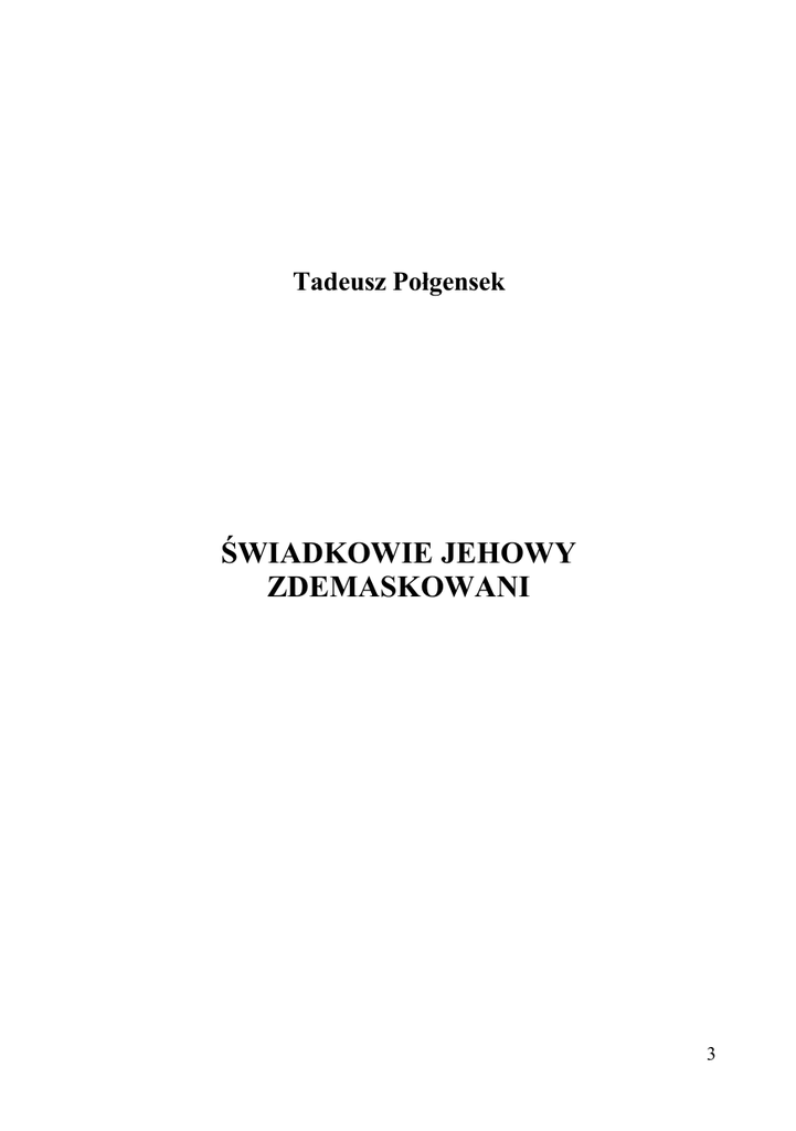Tadeusz Połgensek ŚWIADKOWIE JEHOWY ZDEMASKOWANI 3 Tadeusz Połgensek ŚWIADKOWIE JEHOWY ZDEMASKOWANI Wydawnictwo: Fundacja "Słowo Nadziei" Gdynia 2003 4 redakcja: Tadeusz Połgensek okładkę projektował: Krzysztof Komaniecki © Fundacja Słowo Nadziei Wszystkie prawa zastrzeżone Książka ani żadna jej część nie może być przedrukowana ani w jakikolwiek inny sposób reprodukowana czy powielana mechanicznie, fotooptycznie, zapisywana elektronicznie lub magnetycznie bez pisemnej zgody wydawcy. W sprawie zezwoleń należy zwracać się do Fundacji "Słowo Nadziei", 81209 Gdynia 9 , Skr.poczt.26 ISBN 83-902804--1-8 5 Chcę wam jeszcze coś powiedzieć na temat przyjścia Jezusa Chrystusa, naszego Pana i spotkania z nim; proszę was jednak, nie dajcie się tak łatwo otumanić ani zastraszyć tym, że już nadszedł dzień sądu Pana. Nie wierzcie temu, nawet gdyby ktoś powoływał się na objawienie lub na swoją wypowiedź, czy jakiś list, mnie przypisany. Nie dajcie się nikomu w ten sposób oszukiwać... Drugi List do Tes. 2:1-3 NT.WP. Słowo Wstępne Drogi Czytelniku, oddaję dziś do twoich rąk drugą książkę. Jest ona napisana na zapotrzebowanie czytelników, którzy zwracali się do redakcji o wyjaśnienie poszczególnych nauk, które zostały w niej zawarte. Pierwsza książka pt. Zanim zostaniesz Świadkiem Jehowy - przeczytaj, miała za zadanie pokazać czytelnikowi zakulisowe dramaty jakie przeżywa członek Organizacji, gdy się nie zgadza z naukami kierownictwa. Natomiast ta książka wyposaży cię w te argumenty. 6 Prawie jedna trzecia książki podaje biografie pięciu prezesów Towarzystwa Strażnica. Materiał ten jest o tyle cenny, że dotychczas nie był w taki sposób publikowany w Polsce. Następnie zajmuję się poszczególnymi naukami oraz ich zmianami, co daje czytelnikowi jasny obraz jak kierownictwo w Brooklynie dopasowuje nauki do polityki światowej, aby zatrzymać jak największą ilość głosicieli, którzy po raz któryś zostali wprowadzeni w błąd. Nie daj się zniechęcić tym, że przedstawiając te dowody ŚJ. nie od razu dadzą temu wiarę. Biblia mówi, że wszystko ma swój czas. Dzisiejszy czas dla kierownictwa ŚJ. jest bardzo niewygodny. Niespełniło się "proroctwo" o pokoleniu, które miało zobaczyć Armagedon. Dlatego w pośpiechu wycofano książkę Będziesz mógł żyć wiecznie w raju na ziemi, a wprowadzono nową: Wiedza, która prowadzi do życia wiecznego, która ani słowem nie wspomina o pokoleniu roku 1914. W ten to podstępny sposób kierownictwo ŚJ. wycofuje się ze swej fundamentalnej nauki, jaką jest rok 1914. Tematowi temu zostało poświęcone wiele miejsca, ponieważ rok ten przewija się w każdej publikacji przez nich wydanej. Trzecia książka poświęcona jest Królestwu Bożemu, natomiast czwarta zajmuje się w całości eschatologią, i pokaże jak żonglowano datami i wyjaśnieniami Pisma Świętego. Jestem pełen ufności, że ta skromna pozycja pomoże wielu osobom poznać mechanizmy jakie obowiązują w Organizacji, a głosicielom podjęcia właściwej decyzji. Aby czytelnik mógł szybko znaleźć cytaty ze Strażnic zostały zaznaczone inną czcionką, natomiast kursywą zostały wpisane wersety biblijne. Autor Tytułem wprowadzenia Apostołowie pytali: Kiedy to nastąpi? (...) Jakie wydarzenia będą zapowiadały Twój powrót i koniec tego świata? (Mat.24:3 NT S.Ż). Odpowiadając, Pan Jezus nie wskazał roku ani dnia, ale ostrzegł: Nie dajcie się zwieść (...) Wielu bowiem przyjdzie podając się za Mesjasza i oszuka mnóstwo ludzi (Mat. 24:4,5 NT, SŻ). W XXIV rozdziale Ewangelii Mateusza, Pan Jezus aż trzy razy ostrzega przed zwodzicielami, którzy przyjdą z wielką mocą. Historia przekonuje nas o proroczych słowach Mistrza. Niektóre źródła podają, że na początku XX wieku było około 1900 różnych sekt. W latach dziewięćdziesiątych naszego stulecia, od7 notowano ich ponad 20000! Co gorsza, liczba ta nie uwzględnia wielu ruchów działających nieformalnie. W Polsce mówi się, że działa ich około 300. Bóg powiedział do Adama: (...) Z każdego drzewa tego ogrodu możesz jeść, ale z drzewa poznania dobra i zła nie wolno ci jeść, bo gdy tylko zjesz z niego, na pewno umrzesz (Rodz. 2:16,17). Diabeł, w przewrotny sposób posługując się Słowem Bożym zapytał Ewę: Czy rzeczywiście?. Wierzący ludzie przez stulecia, które minęły od śmierci naszego Pana, Jezusa Chrystusa z utęsknieniem oczekiwali Jego powtórnego przyjścia. W trudnych chwilach wielu wypatrywało znaków mających poprzedzić powrót Pana. Jednak inni, próbowali ustalić ów dzień, zapominając o przestrodze Syna Bożego: Niebo i ziemia przeminą, ale słowa moje nie przeminą. A o tym dniu i godzinie nikt nie wie; ani aniołowie w niebie, ani Syn, tylko sam Ojciec (Mat. 24:35-36, NP). Przeciwnik Boży wszczepił w serce Ewy wątpliwość. Skutki nieposłuszeństwa są nam dobrze znane. Podobnie ma się sprawa z powtórnym przyjściem Pana. Chrystus wyraźnie powiedział, że nikt nie wie, kiedy to nastąpi. Mimo to wielu „proroków” nadal próbuje przewidzieć ów czas. Trafnie nazwał ich apostoł Paweł: Ludzie zaś źli i oszuści, coraz bardziej brnąć będą w zło, błądząc sami i drugich w błąd wprowadzając (2 Tym. 3:13). Apostoł Paweł już w I wieku n.e., ubolewał nad łatwowiernością wierzących., zwiedzionych przez pseudoapostołów. Nauka Pańska, nigdy nie cieszyła się takim zainteresowaniem, jak pokrętne nauki zwodzicieli. Albowiem przyjdzie czas, że zdrowej nauki nie ścierpią, ale według swoich upodobań nazbierają sobie nauczycieli, żądni tego, co ucho łechce. I odwrócą ucho od prawdy, a zwrócą się ku baśniom. Ale ty bądź czujny we wszystkim, cierp, wykonuj pracę ewangelisty, pełnij rzetelnie służbę swoją (2 Tym. 4:3-5). Pismo mówi wyraźnie, że przyjdzie czas, kiedy Antychrystowi oddadzą pokłon wszyscy mieszkańcy ziemi, każd