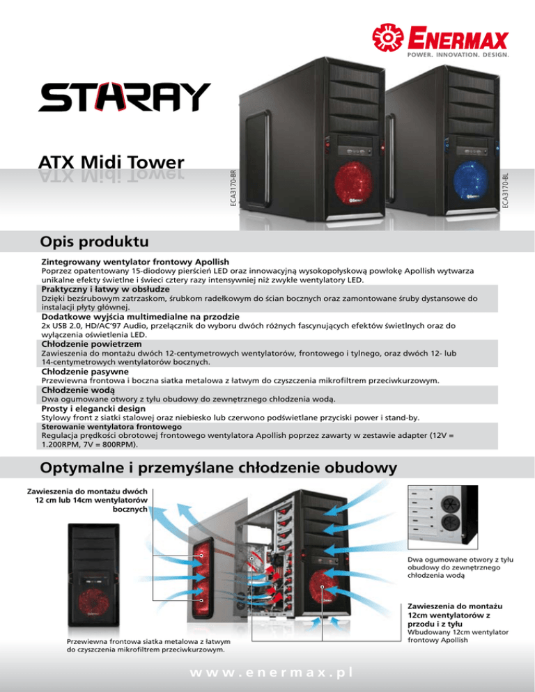 ECA3170-BL ECA3170-BR ATX Midi Tower Opis produktu Zintegrowany wentylator frontowy Apollish Poprzez opatentowany 15-diodowy pierścień LED oraz innowacyjną wysokopołyskową powłokę Apollish wytwarza unikalne efekty świetlne i świeci cztery razy intensywniej niż zwykłe wentylatory LED. Praktyczny i łatwy w obsłudze Dzięki bezśrubowym zatrzaskom, śrubkom radełkowym do ścian bocznych oraz zamontowane śruby dystansowe do instalacji płyty głównej. Dodatkowe wyjścia multimedialne na przodzie 2x USB 2.0, HD/AC’97 Audio, przełącznik do wyboru dwóch różnych fascynujących efektów świetlnych oraz do wyłączenia oświetlenia LED. Chłodzenie powietrzem Zawieszenia do montażu dwóch 12-centymetrowych wentylatorów, frontowego i tylnego, oraz dwóch 12- lub 14-centymetrowych wentylatorów bocznych. Chłodzenie pasywne Przewiewna frontowa i boczna siatka metalowa z łatwym do czyszczenia mikrofiltrem przeciwkurzowym. Chłodzenie wodą Dwa ogumowane otwory z tyłu obudowy do zewnętrznego chłodzenia wodą. Prosty i elegancki design Stylowy front z siatki stalowej oraz niebiesko lub czerwono podświetlane przyciski power i stand-by. Sterowanie wentylatora frontowego Regulacja prędkości obrotowej frontowego wentylatora Apollish poprzez zawarty w zestawie adapter (12V = 1.200RPM, 7V = 800RPM). Optymalne i przemyślane chłodzenie obudowy Zawieszenia do montażu dwóch 12 cm lub 14cm wentylatorów bocznych Dwa ogumowane otwory z tyłu obudowy do zewnętrznego chłodzenia wodą Zawieszenia do montażu 12cm wentylatorów z przodu i z tyłu Przewiewna frontowa siatka metalowa z łatwym do czyszczenia mikrofiltrem przeciwkurzowym. www.enermax.pl Wbudowany 12cm wentylator frontowy Apollish Staray meets Apollish: Świetny efekt + = Opatentowane oświetlenie LED świeci 4x intensywniej 2x USB 2.0, HD/AC’97 Audio oraz przełącznik do wyboru dwóch różnych fascynujących efektów świetlnych B 1 A 2 C 4 A Zminimalizowana powierzchnia styku Efektywne zmniejszenie hałasu B Rotor ze zintegrowanym magnesem 3 Niemalże bezdotykowy i spokojny bieg C Łożysko samosmarowe Gwarantuje najwyższą odporność na ścieranie Opatentowana technologia łożyskowa Twister •Stale niski poziom hałasu •Dłuższa żywotność: 100.000 godzin operacji (MTBF) 1 Namagnesowana kulka metalowa 2 Łożysko samosmarowe 3 Cewki Łatwe czyszczenie poprzez wyjmowanie rotora Wysokopołyskowa i wytrzymała powłoka Efektowny 15-diodowy pierścień LED 4 Rotor ze zintegrowanym magnesem Specyfikacja Model ECA3170-BL/-BR Typ obudowy ATX Midi Tower Wymiary (gł. x szer. x wys.) 485 x 185 x 420 mm Materiał SECC Kieszenie na dysk 5,25“ 4x zewnętrzne 3,5“ 7x = 1x zewnętrzne + 6x wewnętrzne Standard płyty głównej ATX & Micro ATX Front I/O 2 x USB 2.0, HD/AC’97 Audio I/O Zawieszenia wentylatorów front 1x 12 / 9 / 8 cm tył 1x 12 / 9 / 8 cm bok 2x 14 / 12 cm Gniazda rozszerzenia 7 Otwory do chłodzenia wodą 2 Sprawdzona jakość www.enermax.de • Hotline 0800-ENERMAX • [email protected]