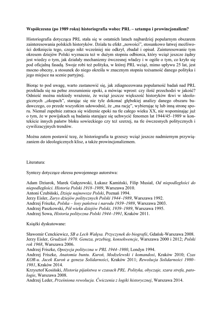 Współczesna (po 1989 roku) historiografia wobec PRL – sztampa i prowincjonalizm? Historiografia dotycząca PRL stała się w ostatnich latach najbardziej popularnym obszarem zainteresowania polskich historyków. Działa tu efekt „nowości”, stosunkowo łatwej możliwości dotknięcia tego, czego nikt wcześniej nie odkrył, zbadał i opisał. Zainteresowanie tym okresem dziejów Polski wyznacza też w dużym stopniu odbiorca, który wciąż jeszcze żądny jest wiedzy o tym, jak działały mechanizmy ówczesnej władzy i w ogóle o tym, co kryło się pod oficjalną fasadą. Swoje robi też polityka, w której PRL wciąż, mimo upływu 25 lat, jest mocno obecny, a stosunek do niego określa w znacznym stopniu tożsamość danego polityka i jego miejsce na scenie partyjnej. Biorąc to pod uwagę, warto zastanowić się, jak zdiagnozowana popularność badań nad PRL przekłada się na pełne zrozumienie epoki, a mówiąc wprost: czy ilość przechodzi w jakość? Odnieść można niekiedy wrażenie, że wciąż jeszcze większość historyków tkwi w ideologicznych „okopach”, starając się nie tyle dokonać głębokiej analizy danego obszaru badawczego, co przede wszystkim udowodnić, że „ma rację”, wybierając tę lub inną stronę sporu. Niemal zupełnie zatraca się widzenie epoki na tle całego wieku XX, nie wspominając już o tym, że w powijakach są badania starające się uchwycić fenomen lat 1944/45–1989 w kontekście innych państw bloku sowieckiego czy też szerzej, na tle ówczesnych politycznych i cywilizacyjnych trendów. Można zatem postawić tezę, że historiografia ta grzeszy wciąż jeszcze nadmiernym przywiązaniem do ideologicznych klisz, a także prowincjonalizmem. Literatura: Syntezy dotyczące okresu powojennego autorstwa: Adam Dziurok, Marek Gałęzowski, Łukasz Kamiński, Filip Musiał, Od niepodległości do niepodległości. Historia Polski 1918–1989, Warszawa 2010. Antoni Czubiński, Dzieje najnowsze Polski, Poznań 1994. Jerzy Eisler, Zarys dziejów politycznych Polski 1944–1989, Warszawa 1992. Andrzej Friszke, Polska – losy państwa i narodu 1939–1989, Warszawa 2003. Andrzej Paszkowski, Pół wieku dziejów Polski, 1939–1989, Warszawa 1995. Andrzej Sowa, Historia polityczna Polski 1944–1991, Kraków 2011. Książki dyskutowane: Sławomir Cenckiewicz, SB a Lech Wałęsa. Przyczynek do biografii, Gdańsk-Warszawa 2008. Jerzy Eisler, Grudzień 1970. Geneza, przebieg, konsekwencje, Warszawa 2000 i 2012; Polski rok 1968, Warszawa 2006. Andrzej Friszke, Opozycja polityczna w PRL 1944–1980, Londyn 1994. Andrzej Friszke, Anatomia buntu. Kuroń, Modzelewski i komandosi, Kraków 2010; Czas KOR-u. Jacek Kuroń a geneza Solidarności, Kraków 2011; Rewolucja Solidarności 1980– 1981, Kraków 2014. Krzysztof Kosiński, Historia pijaństwa w czasach PRL. Polityka, obyczaje, szara strefa, patologie, Warszawa 2008. Andrzej Leder, Prześniona rewolucja. Ćwiczenia z logiki historycznej, Warszawa 2014. Adam Leszczyński, Skok w nowoczesność. Polityka wzrostu w krajach peryferyjnych 19431980, Warszawa 2013. Paweł Machcewicz, Polski rok 1956, Warszawa 1993. Krzysztof Persak, Sprawa Henryka Hollanda, Warszawa 2006. Robert Spałek, Komuniści przeciwko komunistom Poszukiwanie wroga wewnętrznego w kierownictwie partii komunistycznej w Polsce w latach 1948–1956, Warszawa 2014. Mirosław Szumiło, Roman Zambrowski 1909-1977 : studium z dziejów elity komunistycznej w Polsce, Warszawa 2014. Marcin Zaremba, Komunizm, legitymizacja, nacjonalizm. Nacjonalistyczna legitymizacja władzy komunistycznej w Polsce, Warszawa 2001. Marcin Zaremba, Wielka trwoga. Polska 1944-1947. Ludowa reakcja na kryzys, Kraków 2012.